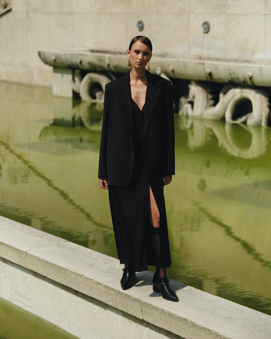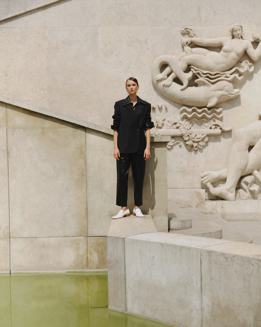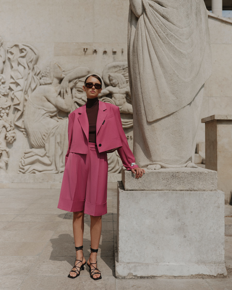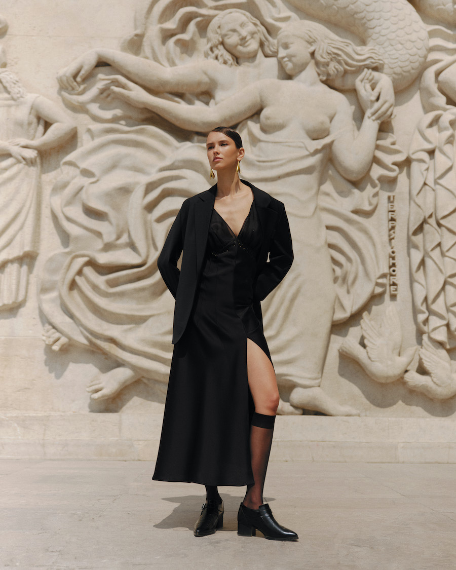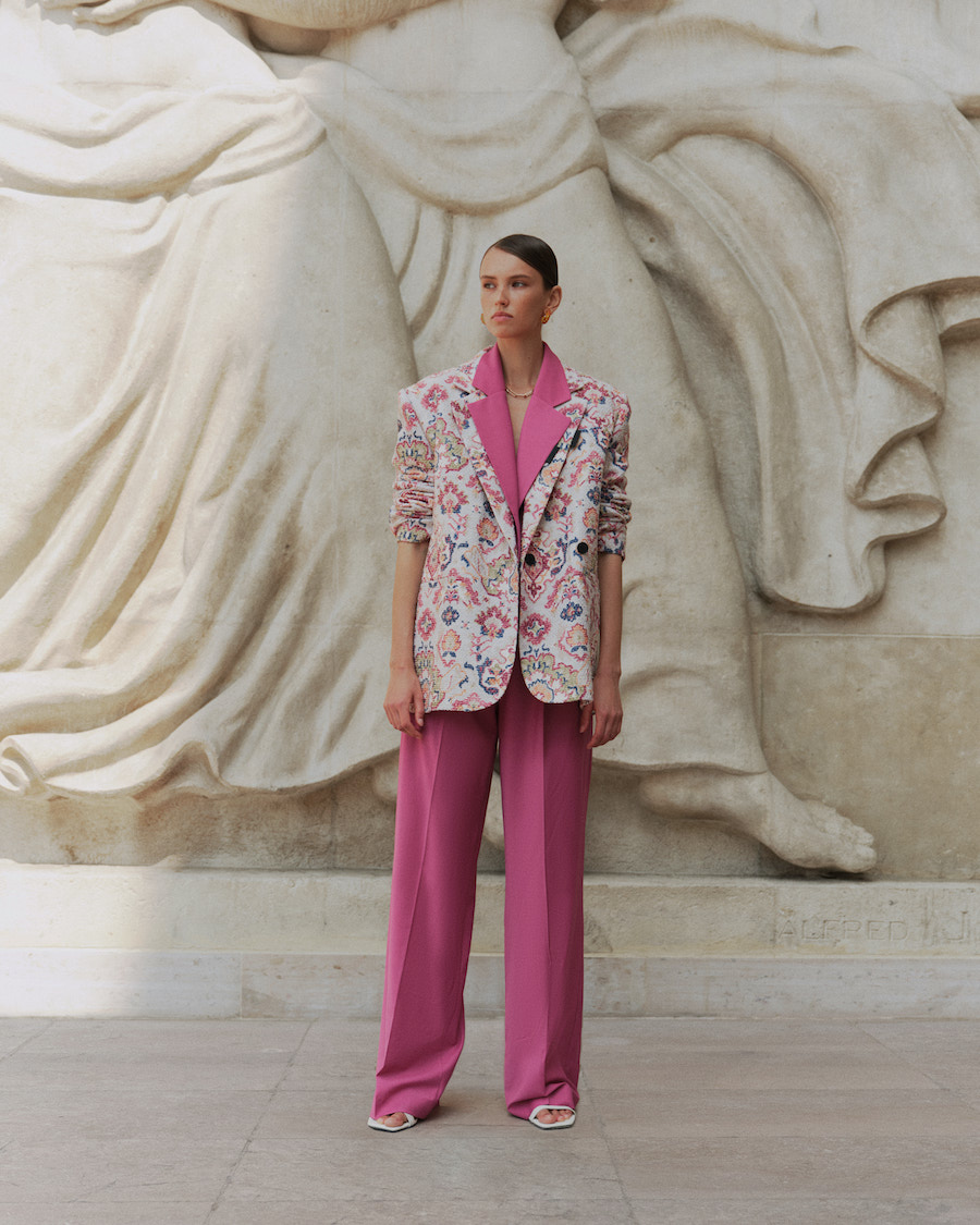 The KATERINA KVIT brand starts the new season with faith in a promising future. Bright colours, floral patterns, layered looks, and spectacular trendy details. The entire collection looks like a real challenge to basic, safe and boring wardrobe. This is the antipode of the careful classics. The location for the shooting was not chosen by chance. The famous Palais de Tokyo in the 16th arrondissement of Paris is an enclave of modern art and edgy ideas on the banks of the Seine. A model poses in front of Alfred Auguste Jeannio’s bas-reliefs ‘Legend of the Earth’ and ‘Legend of the Sea’.