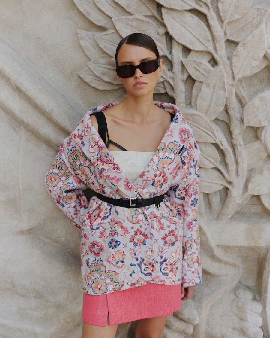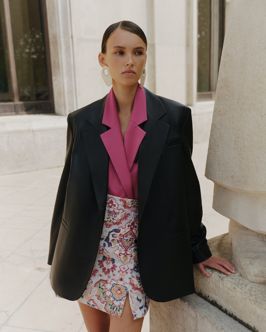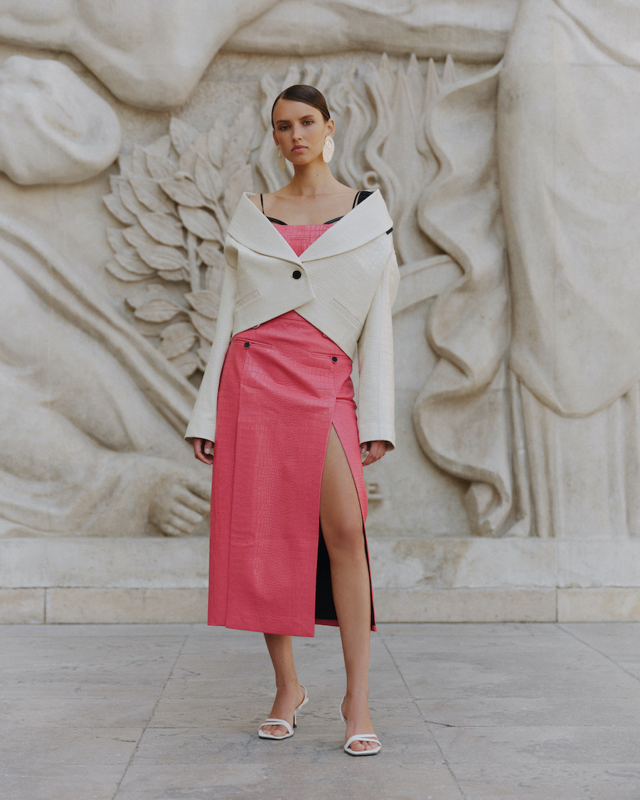 Bright colours were consciously chosen for Resort 2023. Such a palette attracts attention, makes you smile, and takes the path of positive thinking. Bright raspberry is a new shade in the brand’s colour range, in which custom-made leather with a crocodile print was released. In addition, exclusively for KATERINA KVIT, one of the oldest French textile companies has developed an ornament that fits the colourful collection with a French mood.