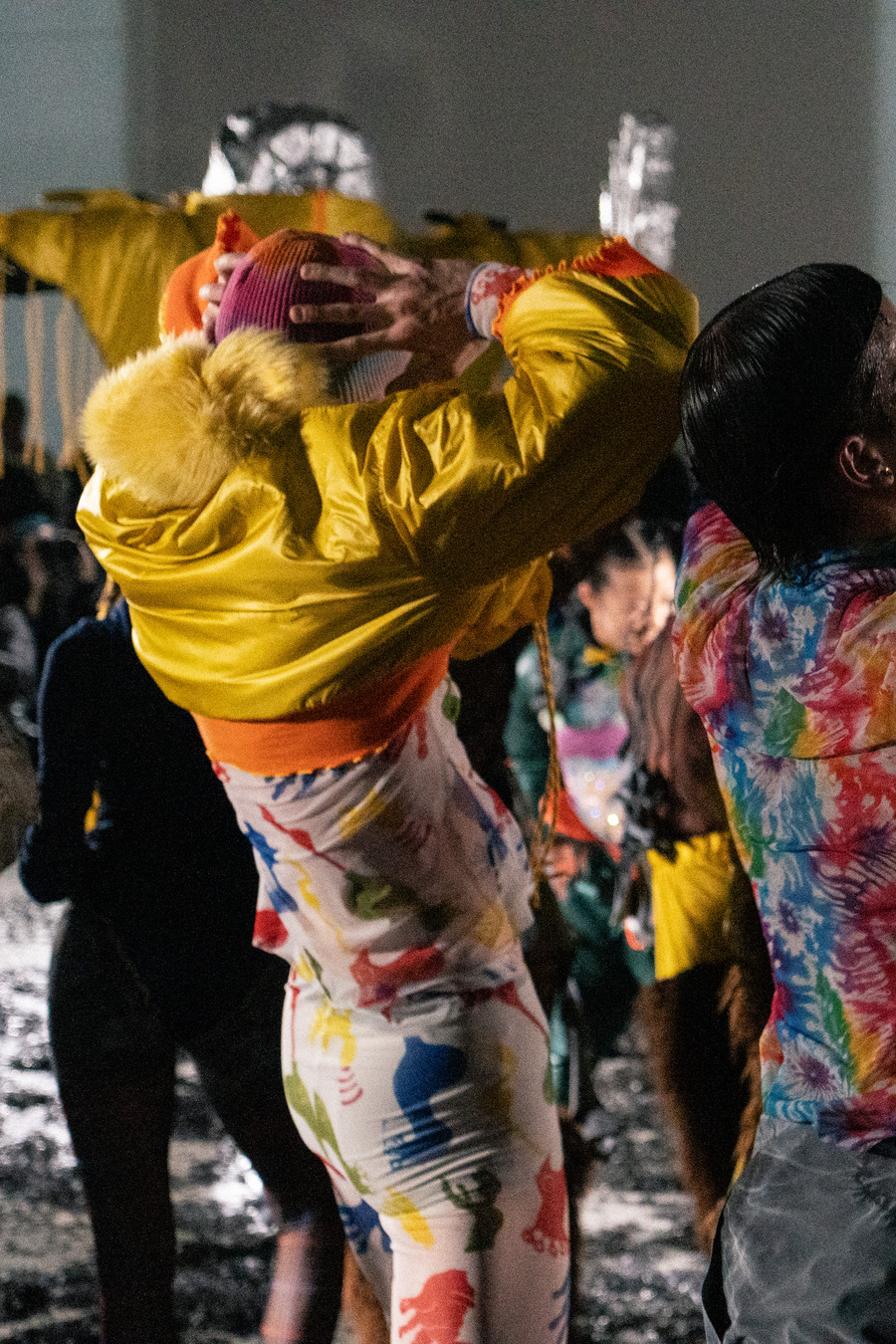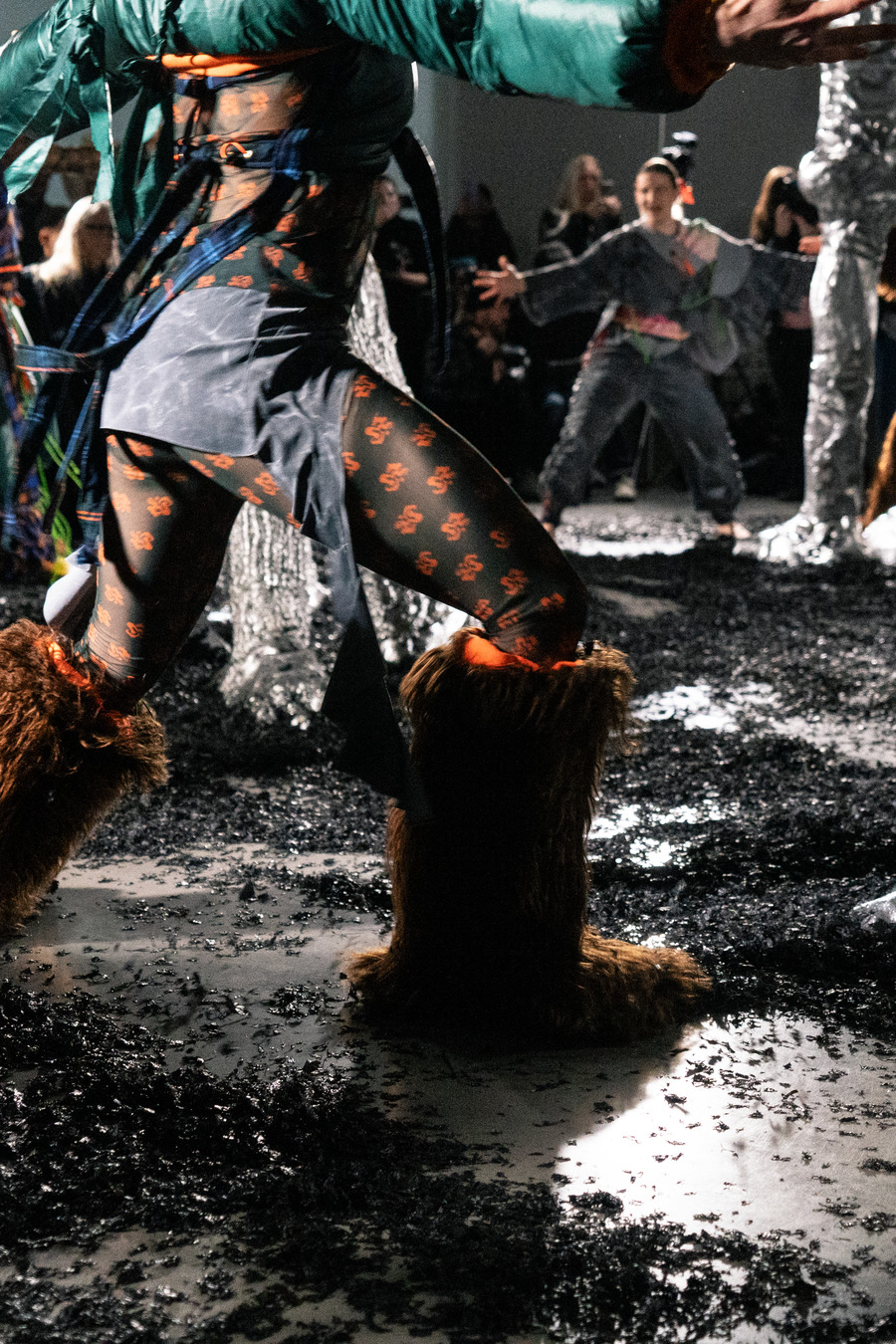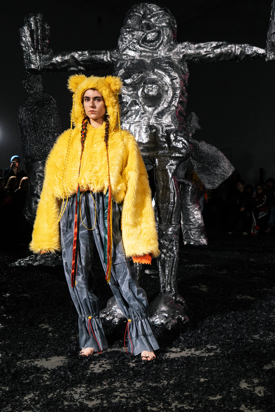 The collection boasts oversized, layered silhouettes that emphasize adjustability and reversibility, catering to all body types. Standout pieces include a reversible yellow padded jacket, a chic skirt, and tartan dungarees. Reflective trousers and an adjustable jacket bring functionality and fun, while a reversible faux fur and rainproof ensemble showcases comfort blended with technical precision. The whimsical “sculpture feet” shoes with padded layers add a narrative-driven touch to the eclectic offering.