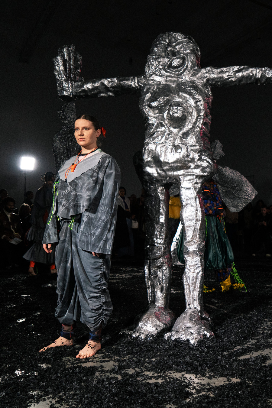 The organic, fluid nature of tie-dye mirrors the unpredictable formations of lead pouring. No two patterns are the same—just as no two sculptures or garments in the collection are identical. It reinforces the theme of transformation, where each piece carries its unique imprint of the process. This sense of fluidity connects all elements of the show, from the clothing to the performers to the sculptures themselves.
