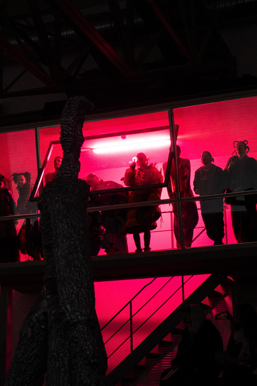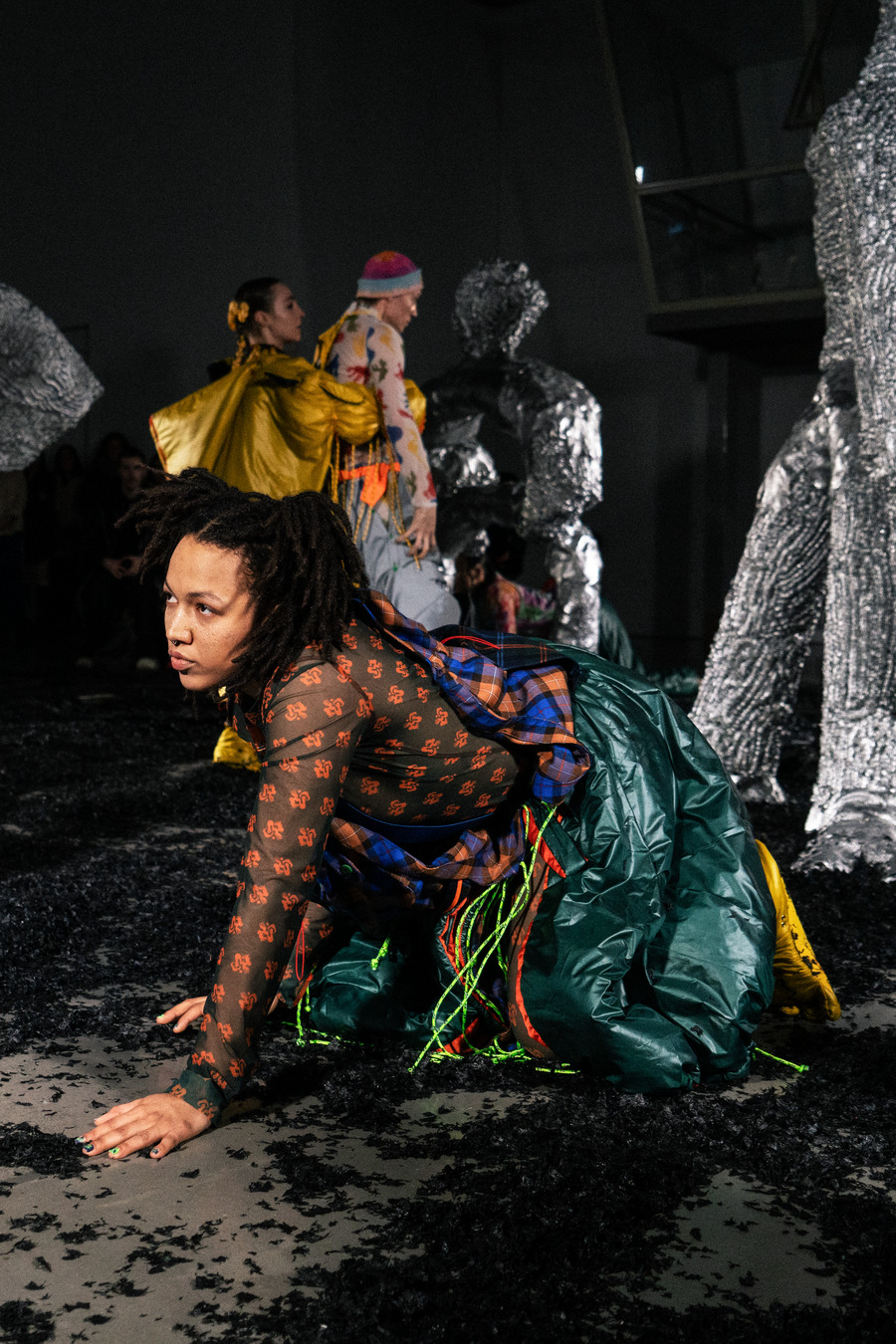 By creating a space—both physical and conceptual—where these values are lived, not just spoken about. Our sculptures act as guardians of this space, standing alongside the performers and garments, reinforcing the idea that identity and self-expression should be free from imposed structures. The clothing itself is adaptive, allowing the wearer to shape their silhouette rather than being confined by a predefined form. Empathy comes through in our approach to inclusivity, designing for all bodies, identities, and movements. We believe that clothing is a tool for self-expression and empowerment.