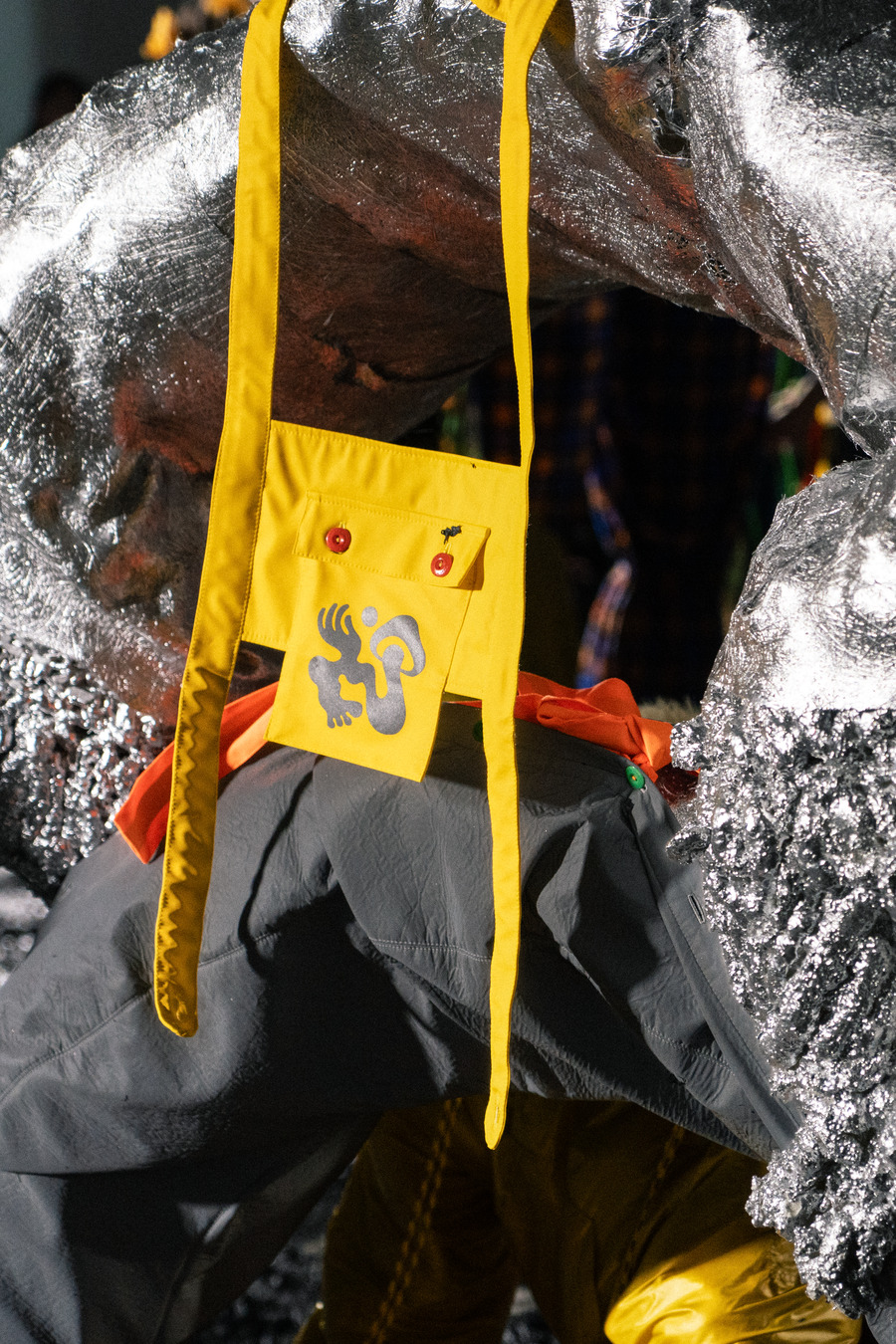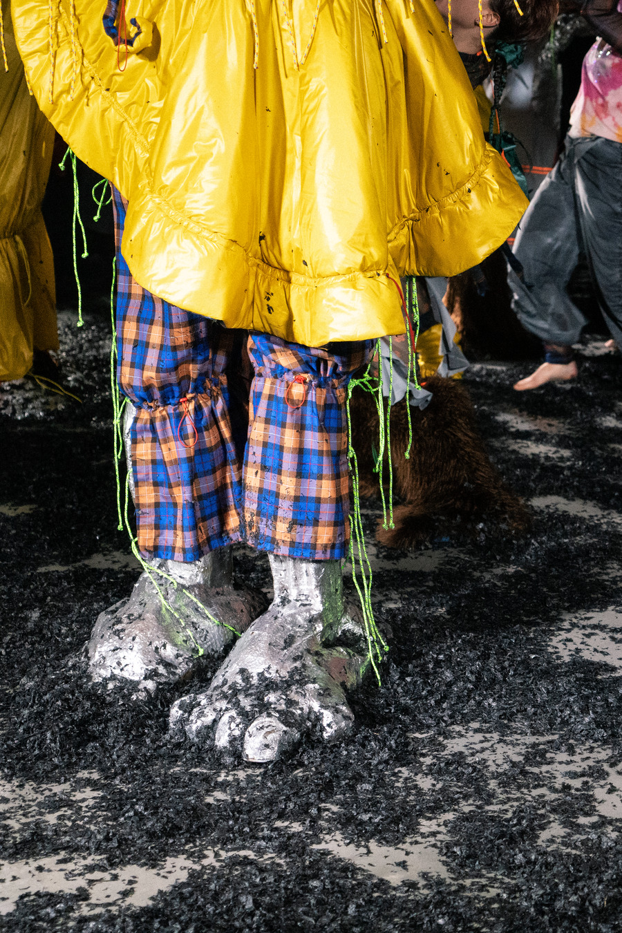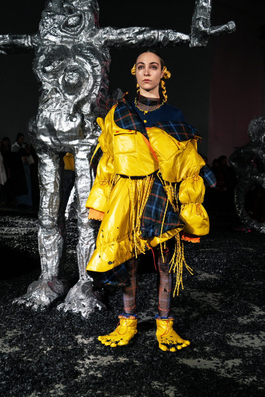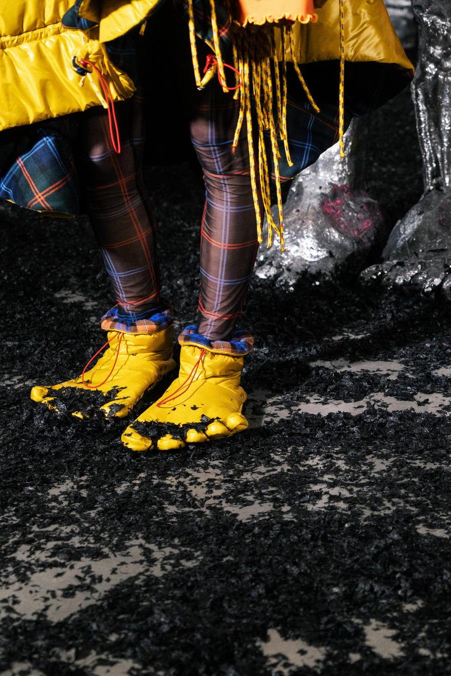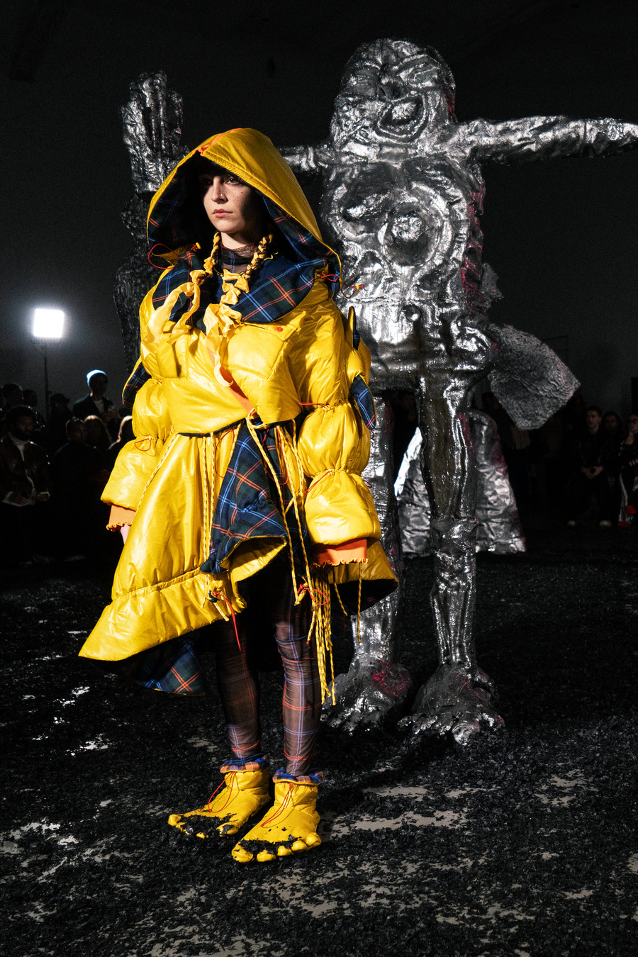 The collection boasts oversized, layered silhouettes that emphasize adjustability and reversibility, catering to all body types. Standout pieces include a reversible yellow padded jacket, a chic skirt, and tartan dungarees. Reflective trousers and an adjustable jacket bring functionality and fun, while a reversible faux fur and rainproof ensemble showcases comfort blended with technical precision. The whimsical “sculpture feet” shoes with padded layers add a narrative-driven touch to the eclectic offering.