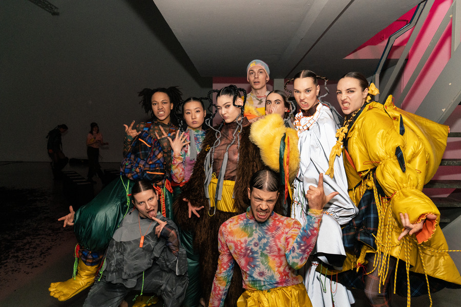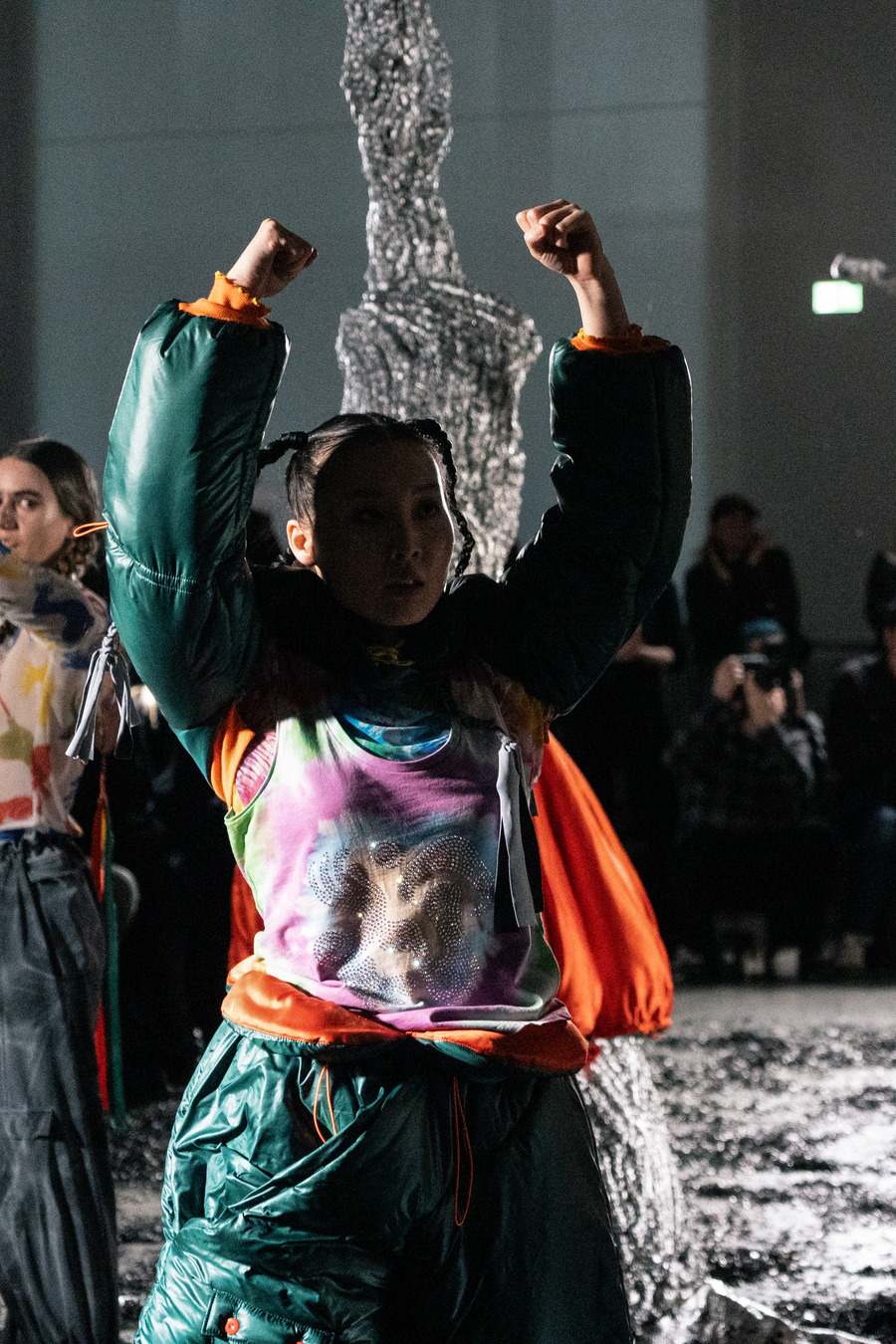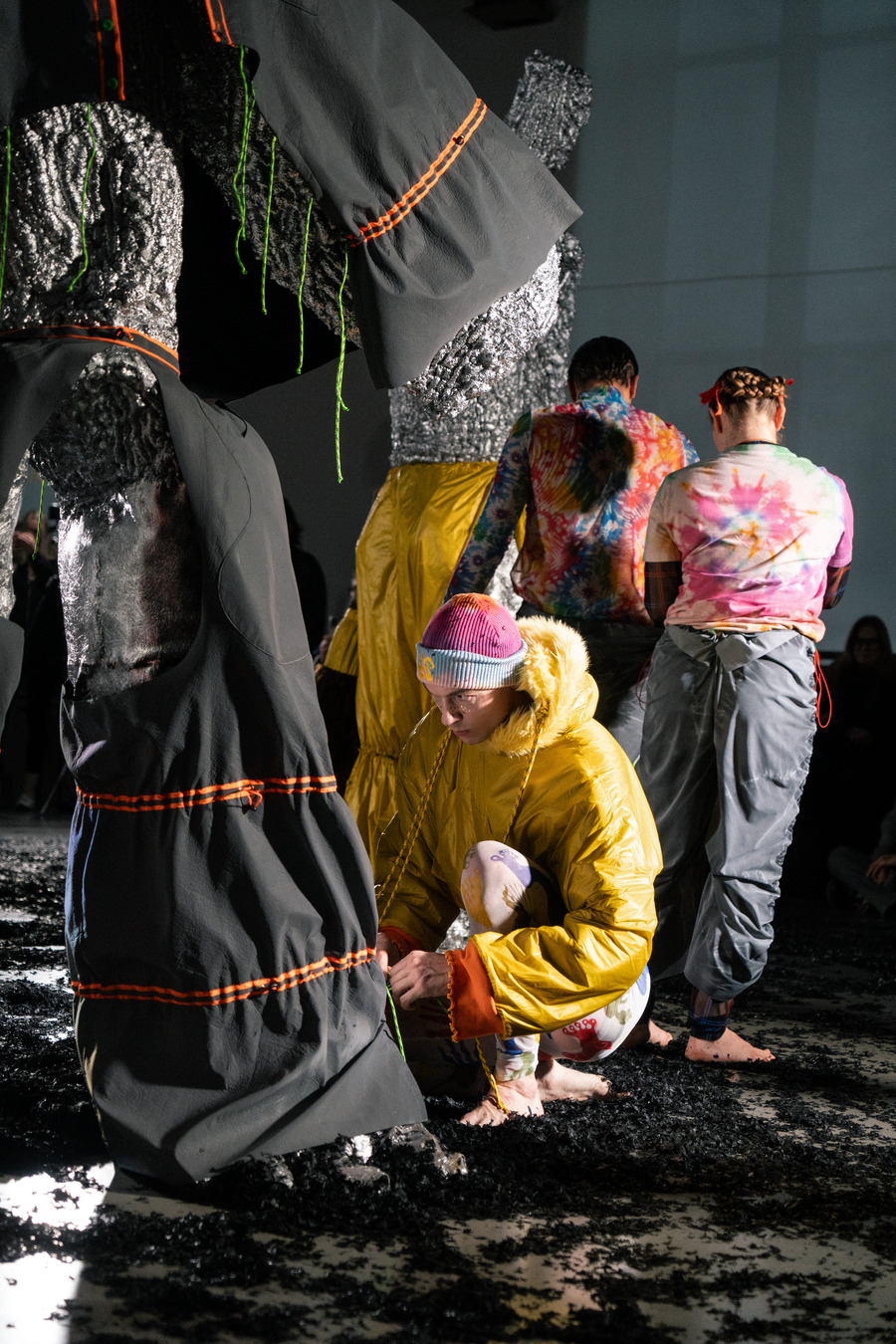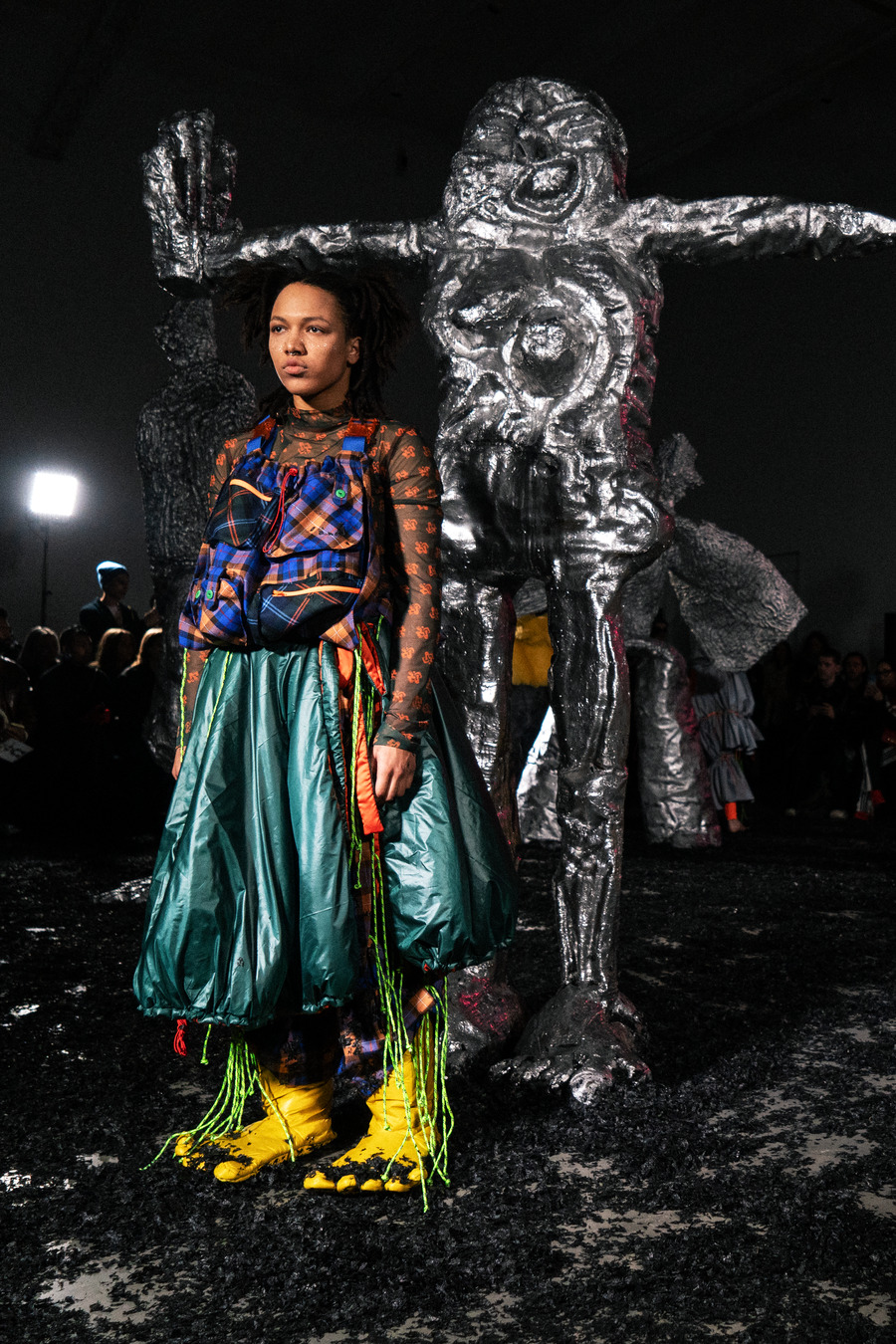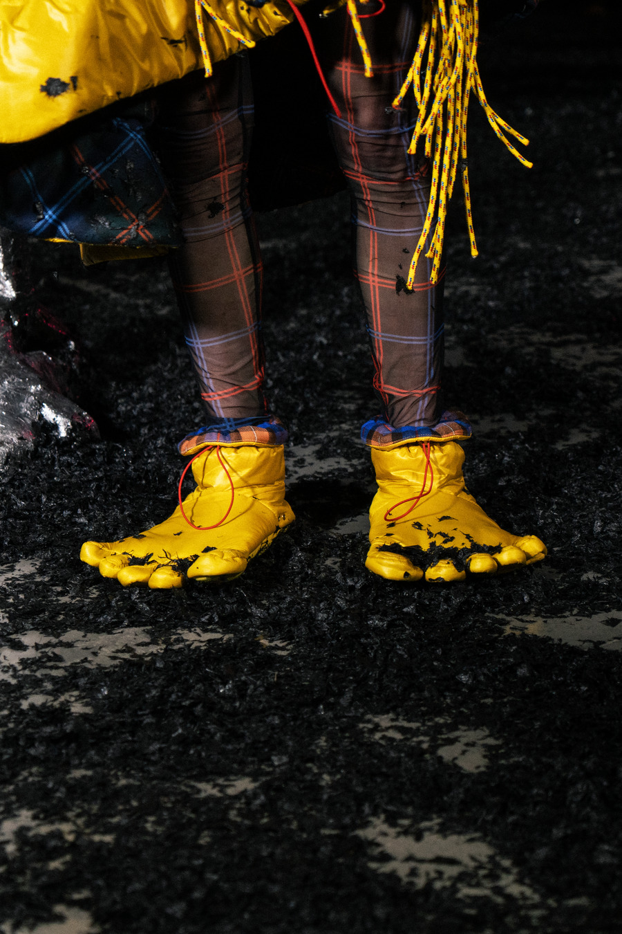 The collection boasts oversized, layered silhouettes that emphasize adjustability and reversibility, catering to all body types. Standout pieces include a reversible yellow padded jacket, a chic skirt, and tartan dungarees. Reflective trousers and an adjustable jacket bring functionality and fun, while a reversible faux fur and rainproof ensemble showcases comfort blended with technical precision. The whimsical “sculpture feet” shoes with padded layers add a narrative-driven touch to the eclectic offering.