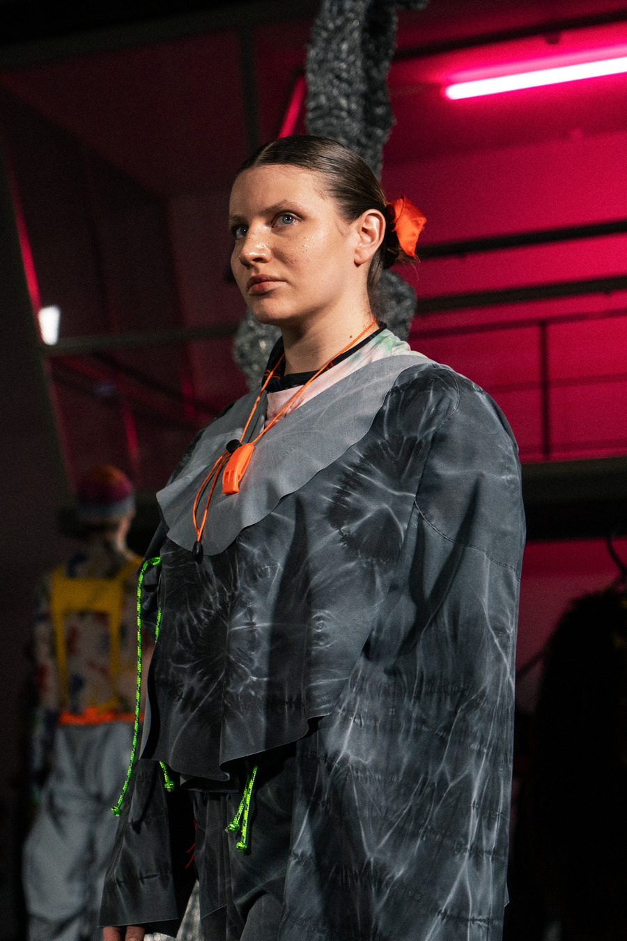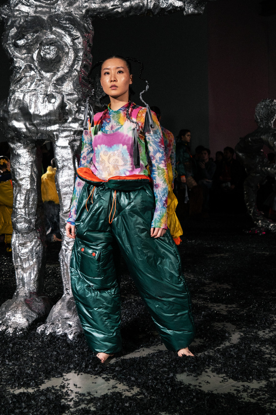 What sets “MØLYBDØMANCY” apart is its commitment to inclusivity and gender-neutral designs that empower self-expression. Each piece is crafted from deadstock fabrics, GOTS-certified textiles, and sustainable Thermore padding, which seamlessly merges artistry with a dedication to sustainability. Tying-dye patterns mirror the unpredictability of lead pouring, while vibrant hues and metallic accents call for boldness and confidence.