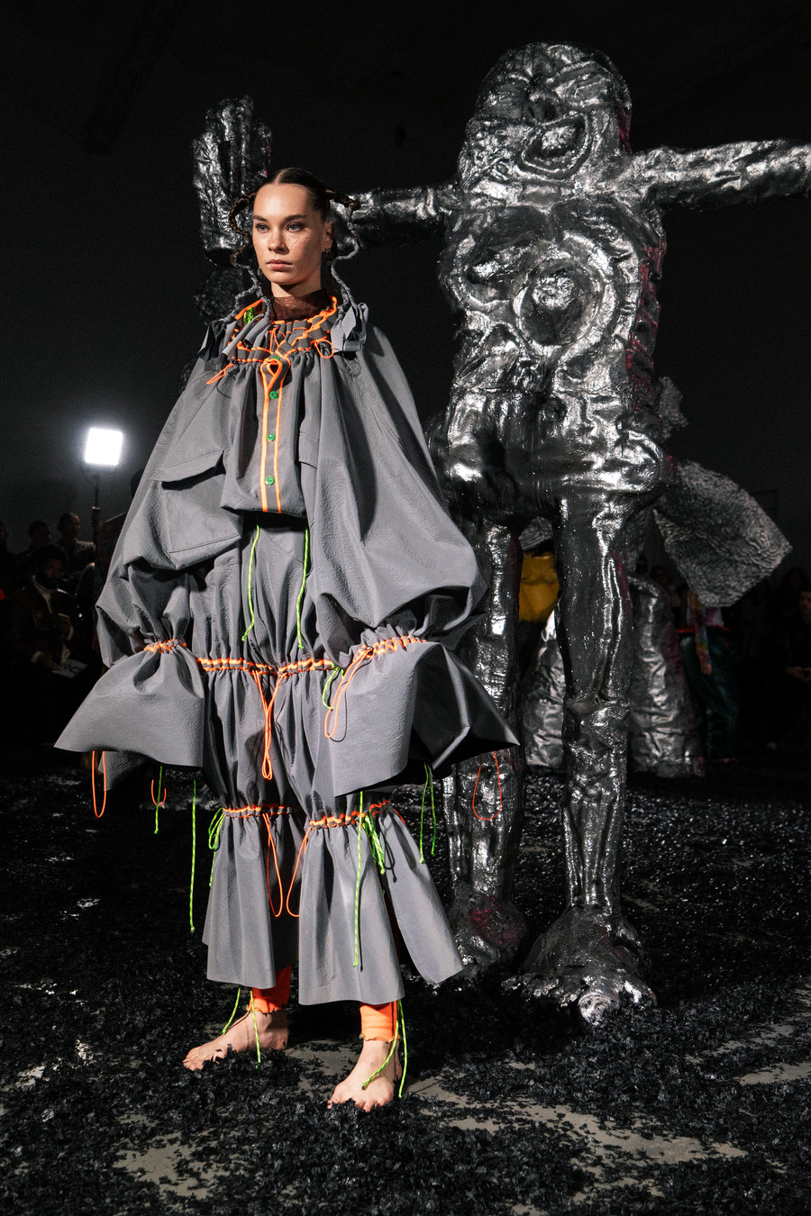 This collection is an exploration of modern spirituality, inspired by the ancient practice of lead pouring, where molten metal is cast into cold water, forming unpredictable shapes that are then interpreted. This idea of spontaneous creation resonates deeply with my artistic process, influencing not just the garments but also the sculptural elements of the show. The collection exists in dialogue with our sculptures, which act as totems—symbols of fluid identity, self-exploration, and ritualistic transformation.