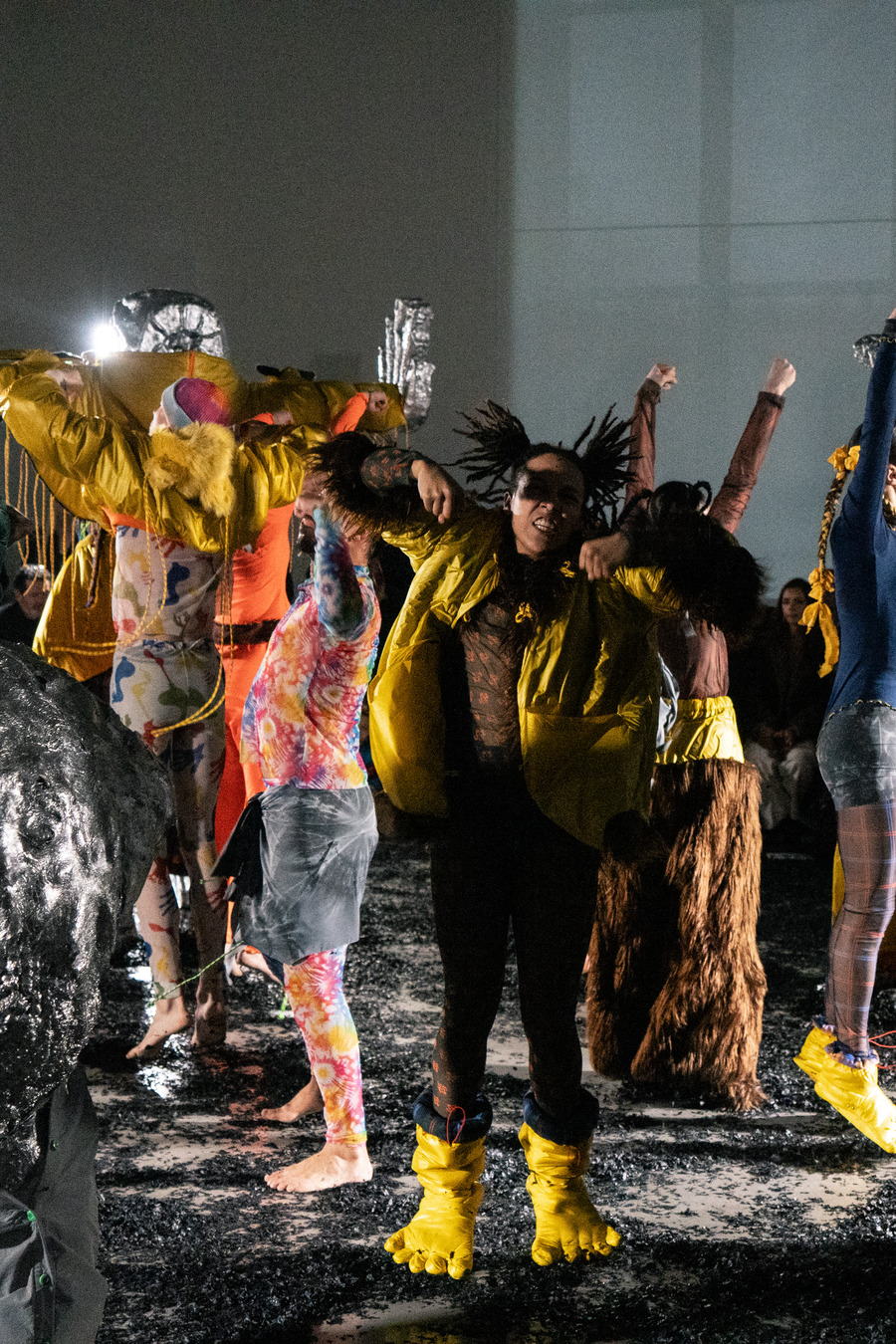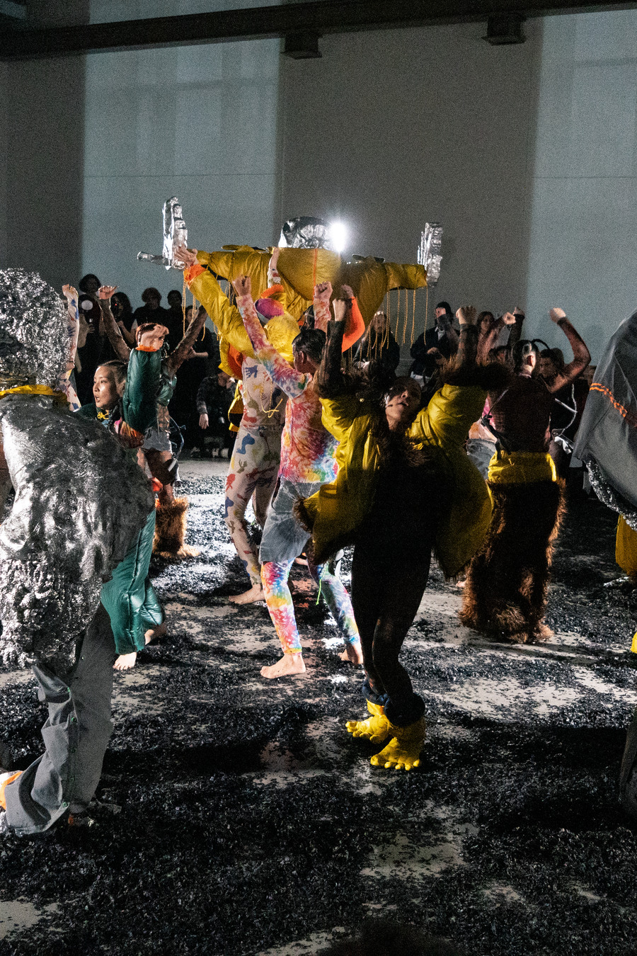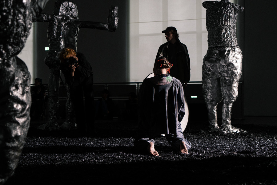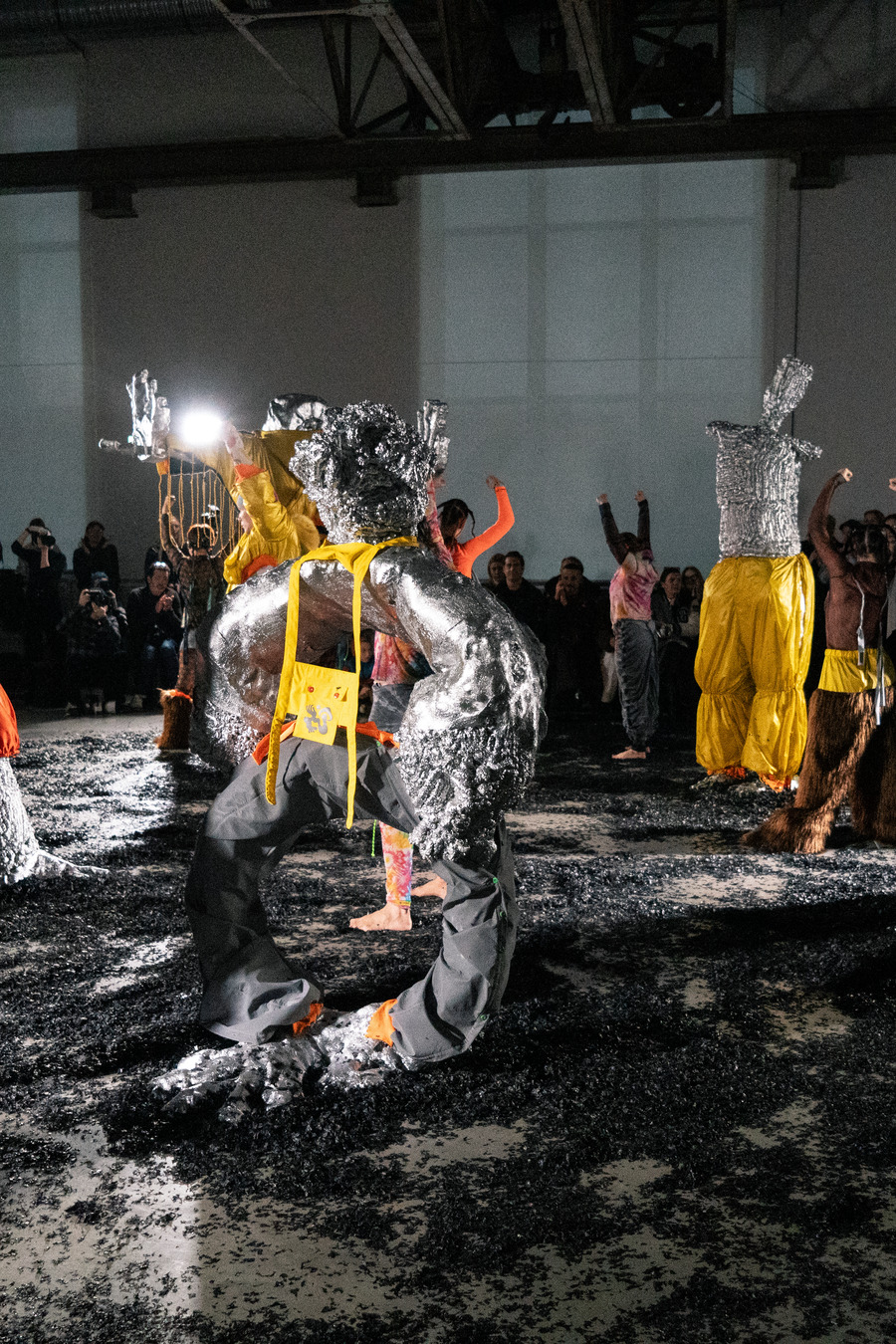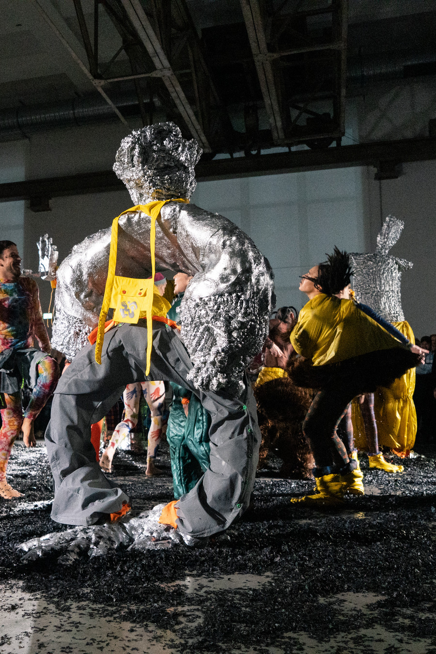 The organic, fluid nature of tie-dye mirrors the unpredictable formations of lead pouring. No two patterns are the same—just as no two sculptures or garments in the collection are identical. It reinforces the theme of transformation, where each piece carries its unique imprint of the process. This sense of fluidity connects all elements of the show, from the clothing to the performers to the sculptures themselves.