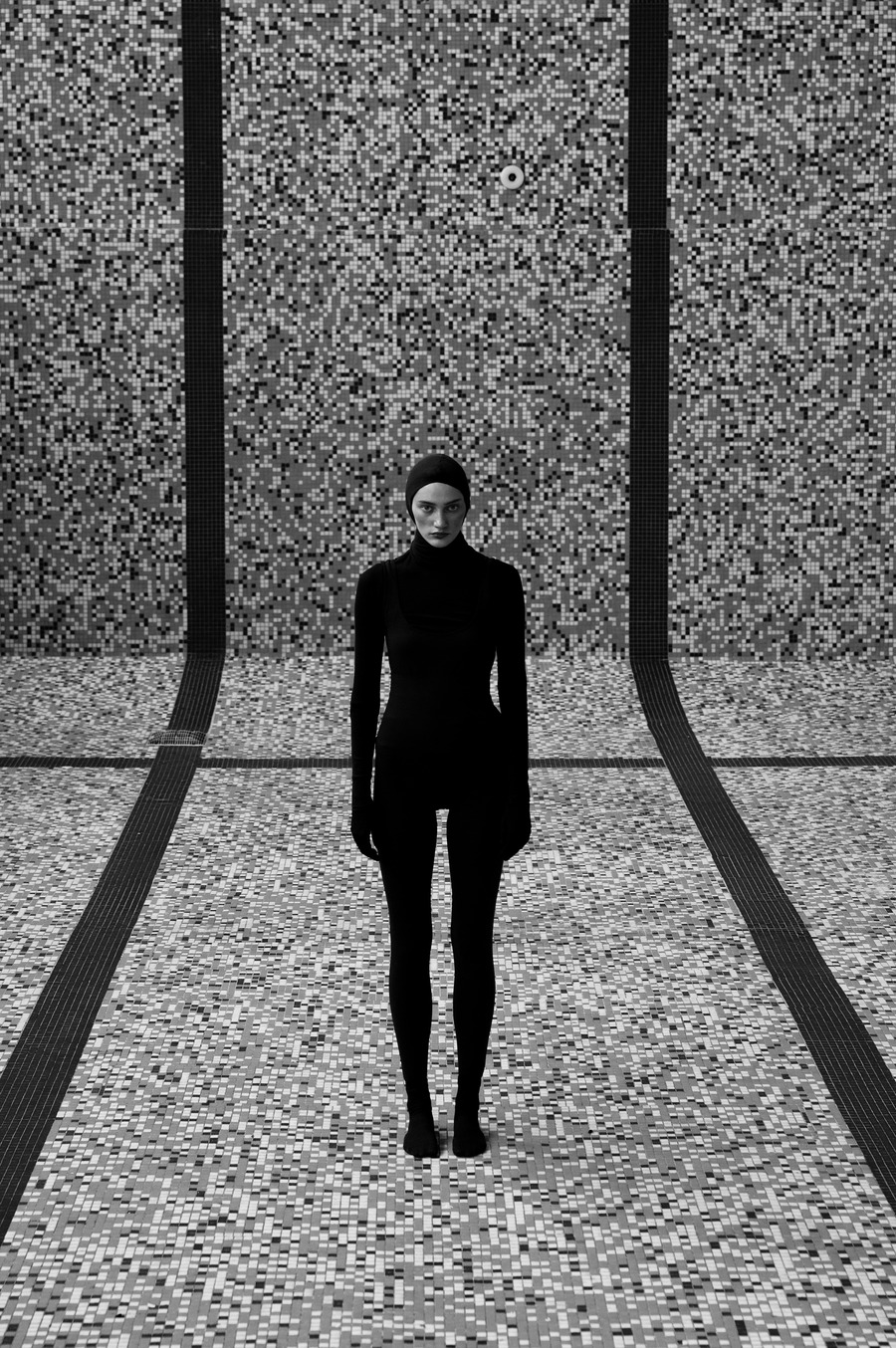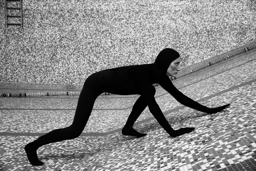 I passed by the pool, where I swam during my time at school. I wanted to go inside. There was a sign on the door stating that it is temporarily closed and it is not clear when it will reopen. My curiosity to know how much had changed led me to knock on the door and try to get in. To my delight, the guard opened the door. I told him that I swam in this pool when I was little and that I would very much like to see how much it had changed. I managed to negotiate and they let me inside. When I got inside, I saw that it was empty and shabby. It upset me a little but inspired me a lot. At this moment, I realized that I wanted to shoot in it. The image that came to my mind was in the likeness of an “amphibian human” – but more understandable to the viewer. I wanted to do something unusual, to convey the form, geometry, atmosphere and dramaturgy that was in my soul.”