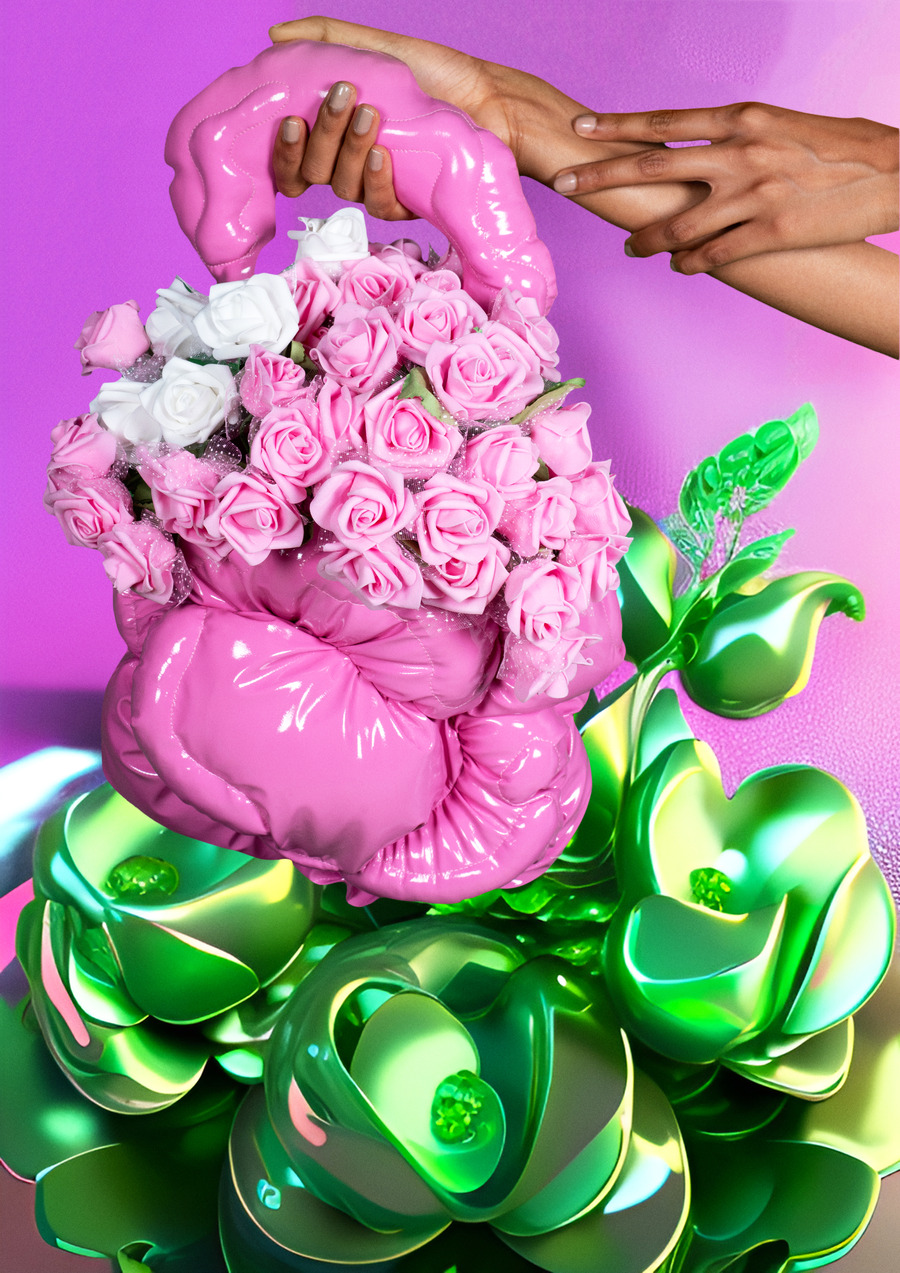 “Synthetic Garden” is a KALTBLUT exclusive editorial featuring German-based independent designers Anna Hieronymus, Helena Stölting, and Abarna Kugathasan. The shoot juxtaposes the beauty of organic flowers and plants with the innovative use of synthetic materials in fashion design. Models are placed against AI-generated backgrounds, based on prompts asking for their interpretation of natural elements.