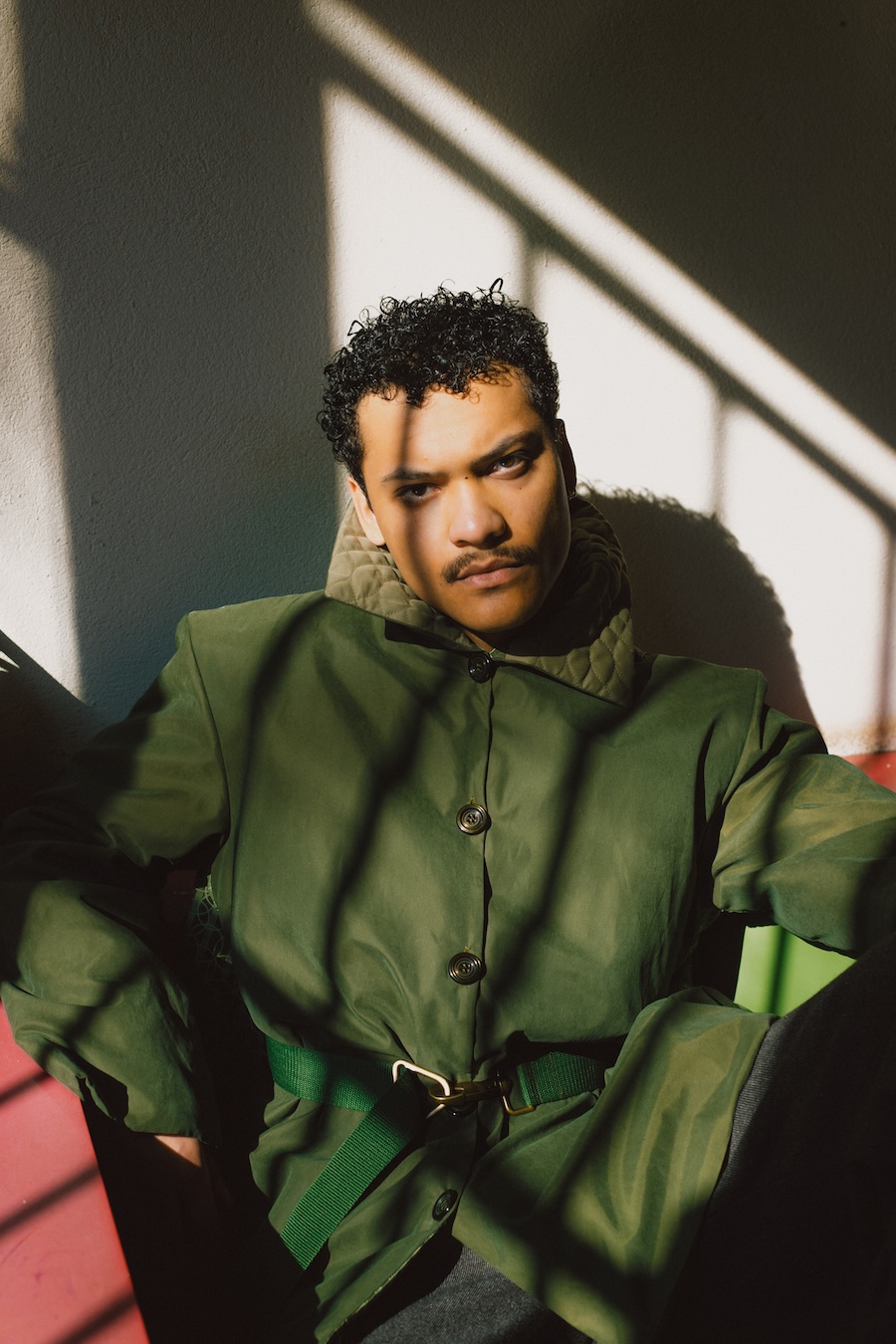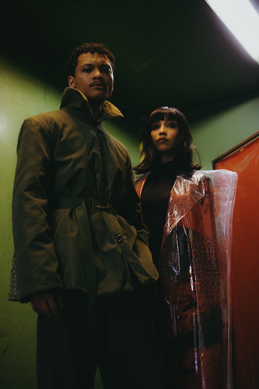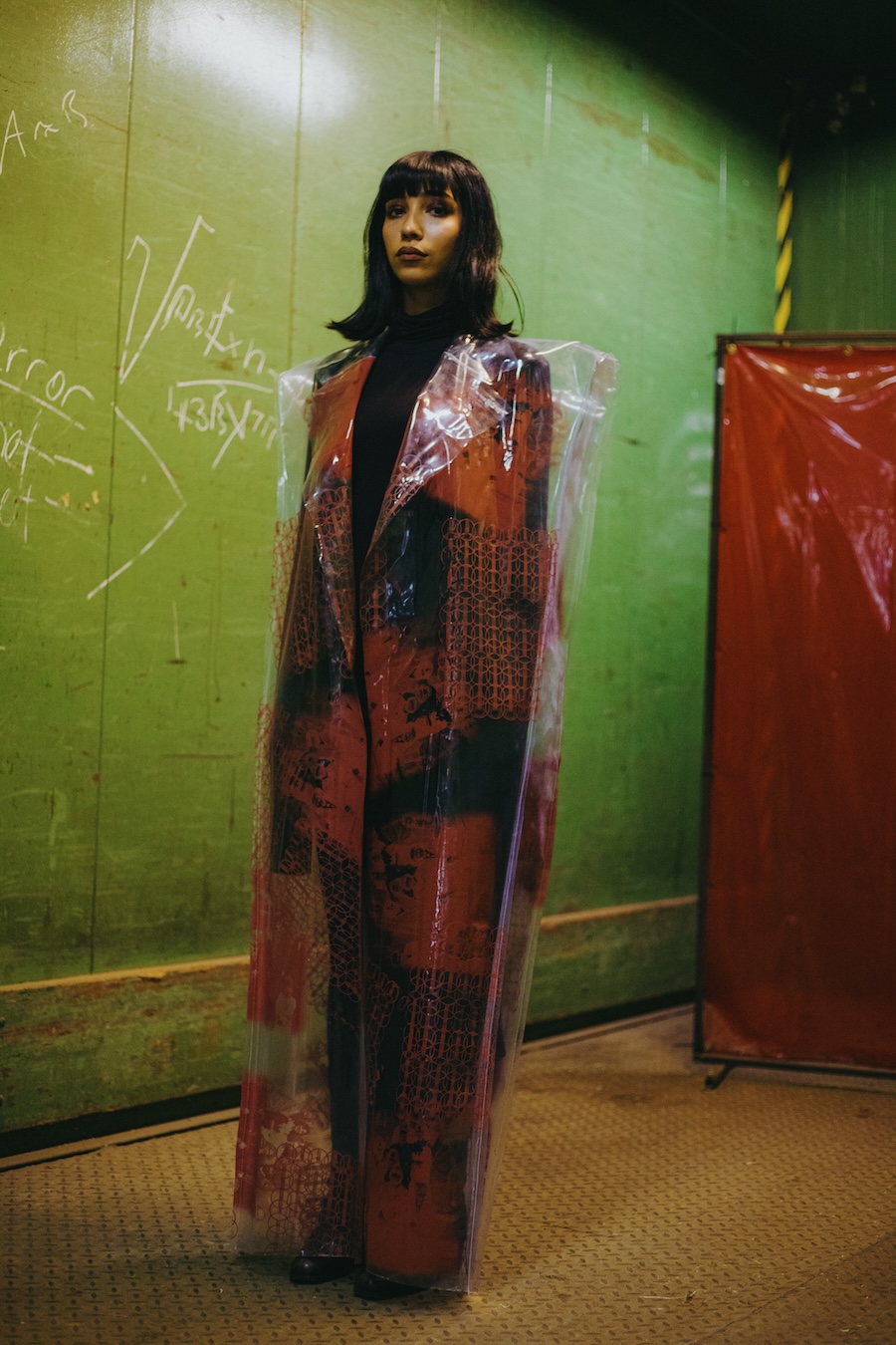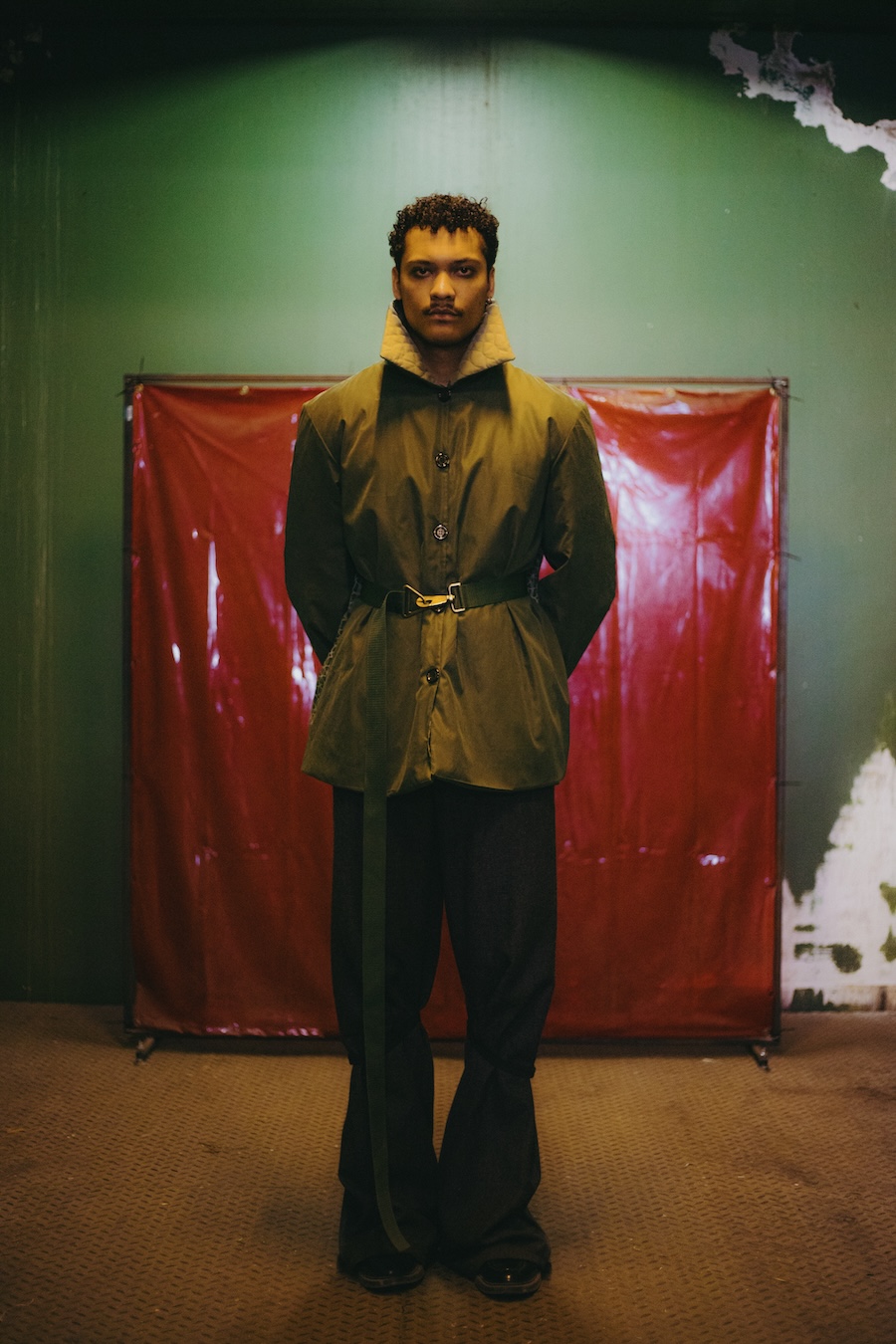 To make the collection even more personal, I printed an old wedding photo of my grandparents onto the coat, turning a family memory into a wearable narrative. I also used a historical broadcasting logo as a print element on several pieces, referencing the power of media and propaganda during that time. It’s a part of the history of my heritage being printed on my clothes.