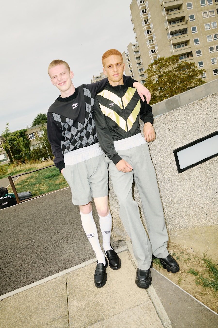 The inspo? Jones’ grandad. A man who treated clashing like a sport in itself: dress shirt and cardigan up top, grey joggers down below. Sweatshirt with formal trousers and proper shoes. No rules, no shame, just vibes. That gloriously awkward British approach to getting dressed becomes the backbone of Umbro x Adam Jones, a collection that thrives on things not quite matching but somehow looking incredibly perfected.