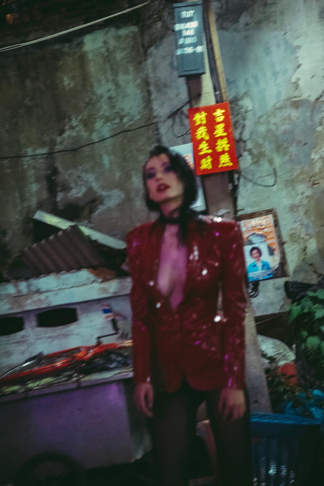 “The editorial was shot as movie stills at night, in an atmosphere between In The Mood For Love and Blade Runner. It is happening in the depths of the original Chinatown in Bangkok, within an area called Talaat Noi. “