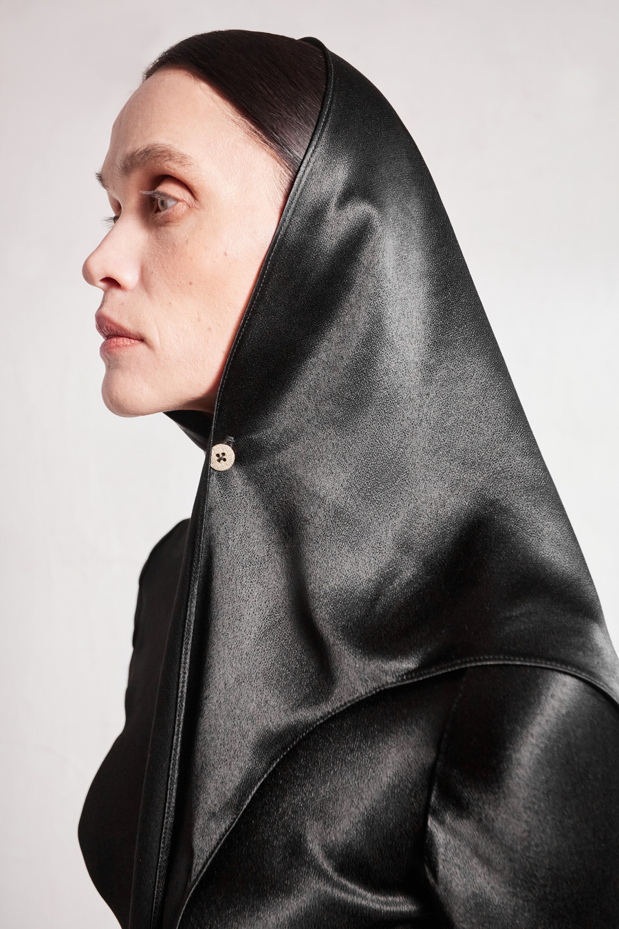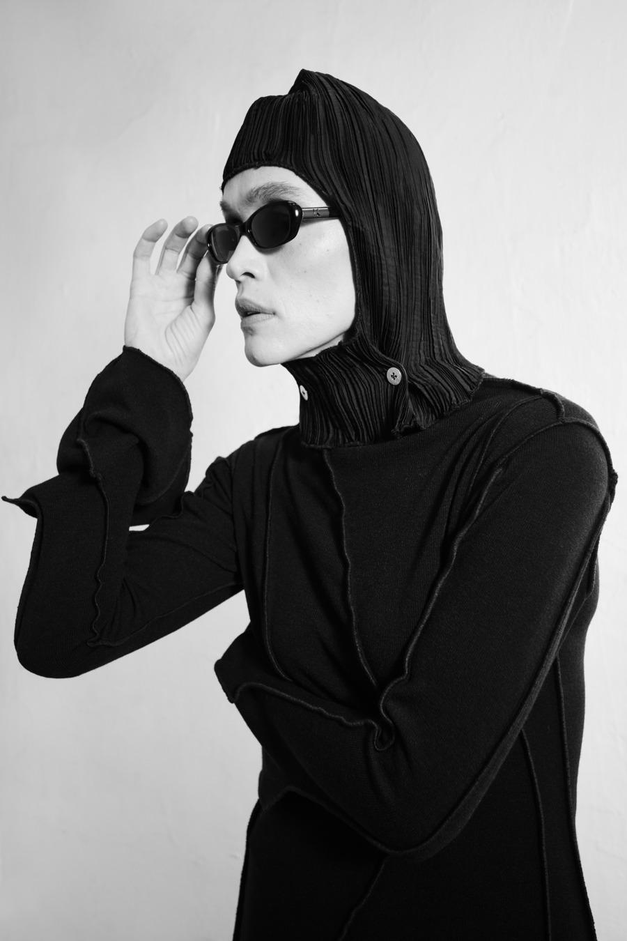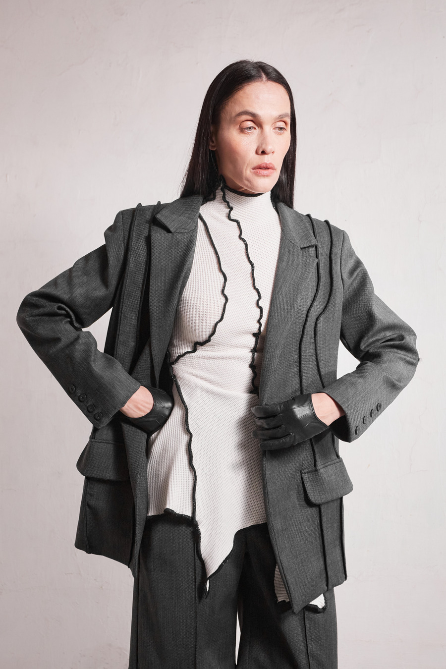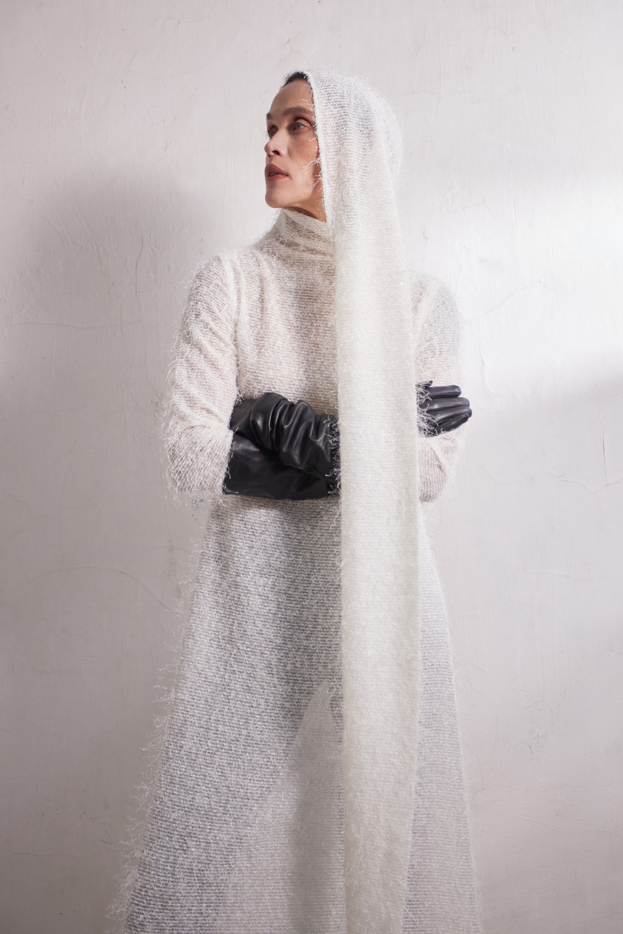 Notably, the A/W 2425 “Reflections” collection introduces two striking accessories: the pleated balaclava and the asymmetrical buttoned scarf, enriching TAMAR KEBURIA’s creative narrative.