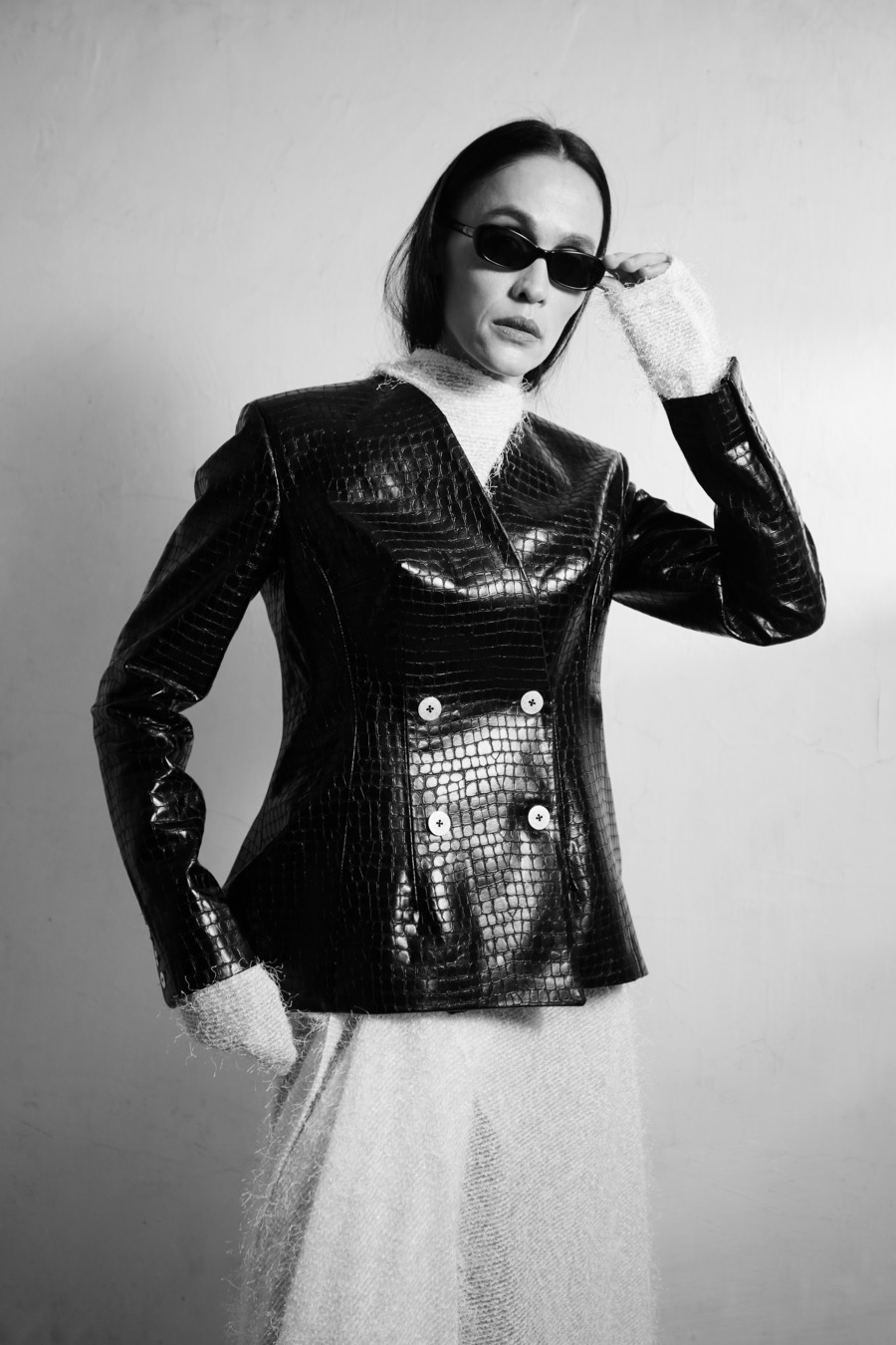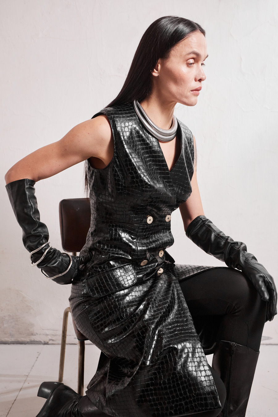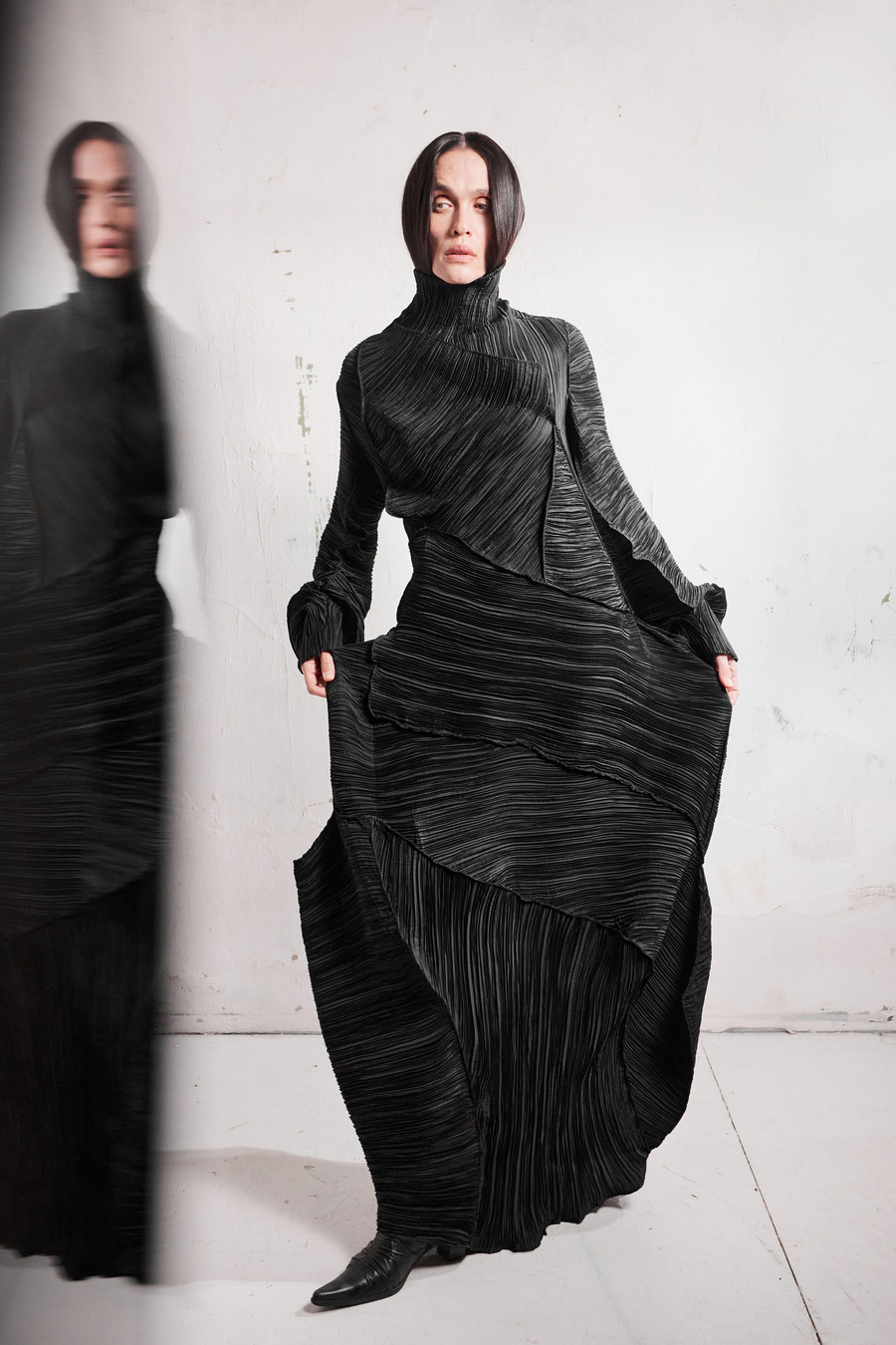 The collection plays with a thought-provoking monochromatic palette and striking architectural silhouettes, flawlessly merging an array of textures including silk, animal print eco-leather, pleats, and meticulously crafted linear elements. Streamlined shapes coalesce with intricate cuts and fabric manipulations, mirroring the diverse dimensions of the modern woman’s existence.