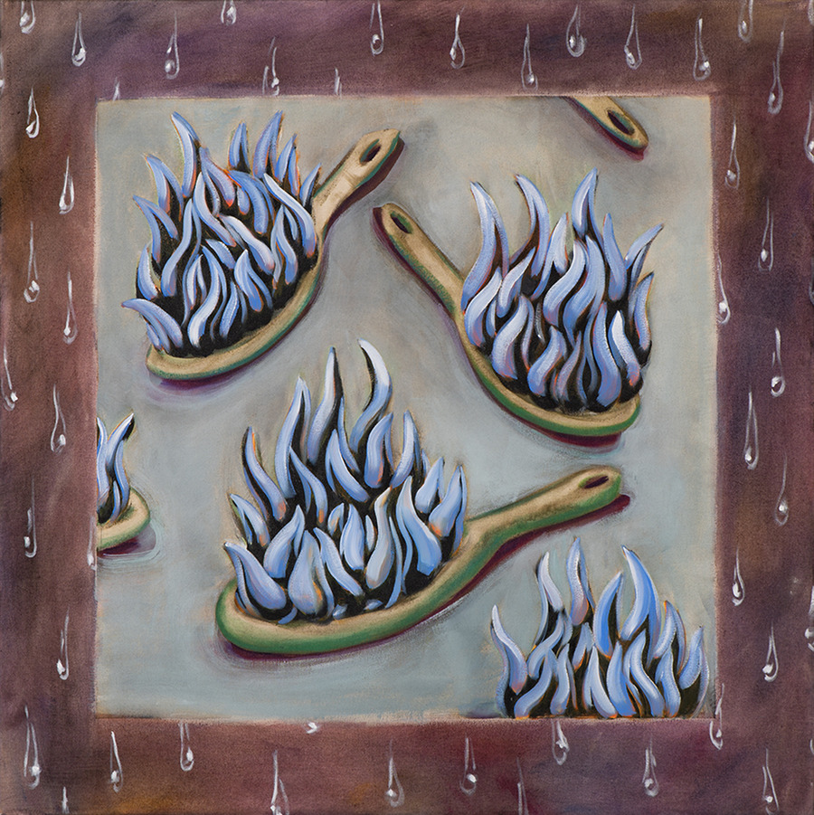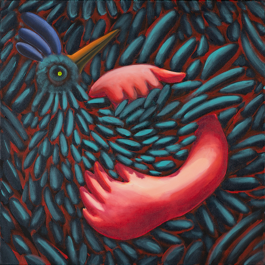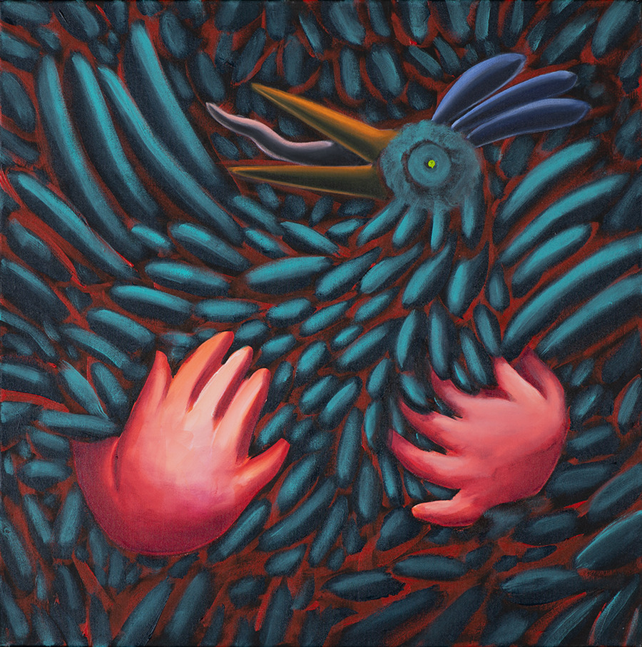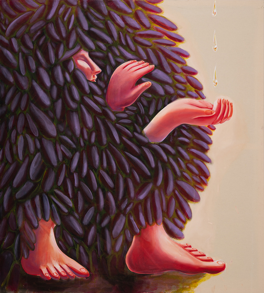 In her latest series, “One Part Sweet & Two Parts Bitter,” Malcher’s concept undergoes a striking evolution. This collection features fewer whole bodies compared to her previous works, opting instead for fragmented depictions. We see round bellies emerging over kneeling legs, eyes peeking through deep water, and hands emerging from a dense cluster of black chicken feathers. The repeated visual motifs throughout the series engage in a fluid conversation, giving rise to multiple interpretations. Notably, the same shape recurs, symbolizing leaves, feathers, hair, and flames across various works within the exhibition. “One Part Sweet & Two Parts Bitter” retains the confident contradictions present in Malcher’s earlier works while breaking free from the confines of art historical stereotypes. In doing so, the artist unveils a new layer of liberated female fantasy, embracing newfound freedom.