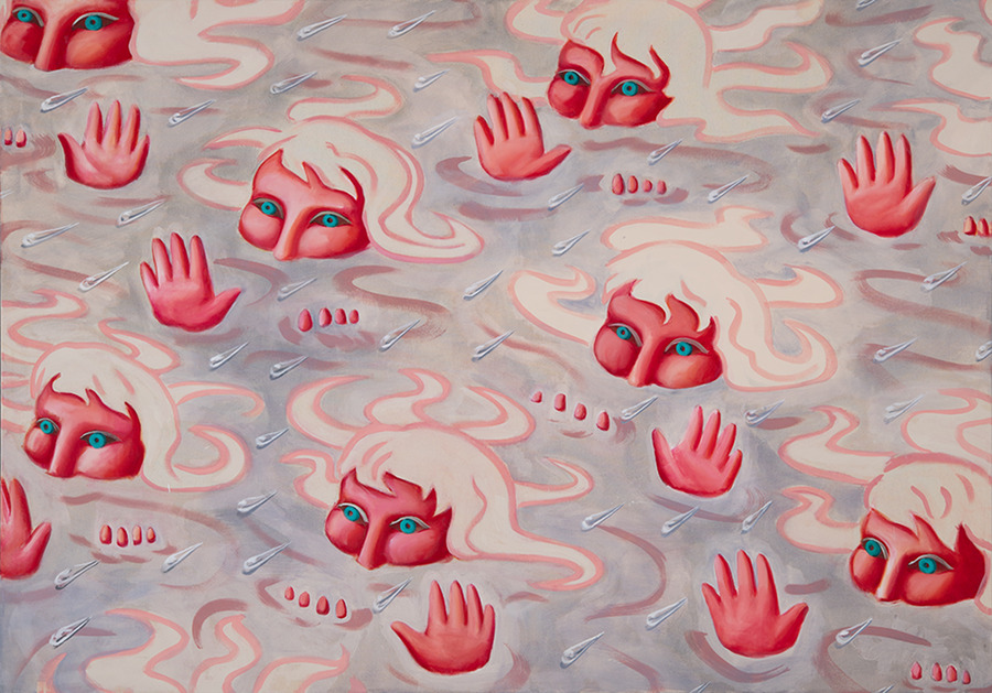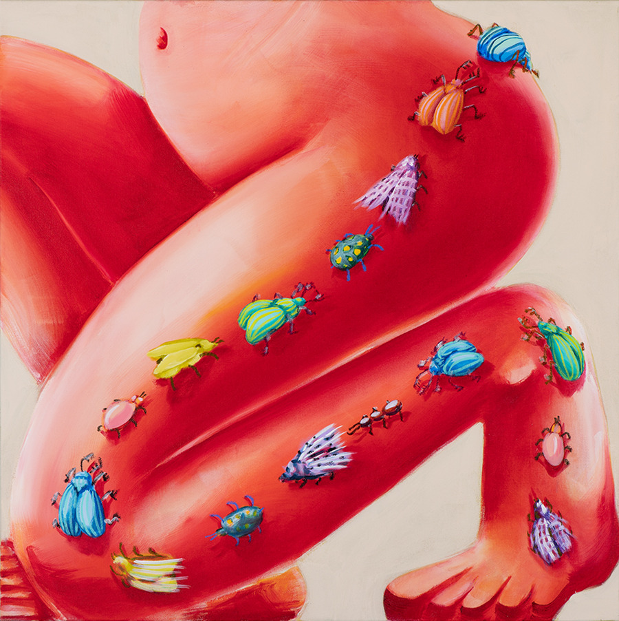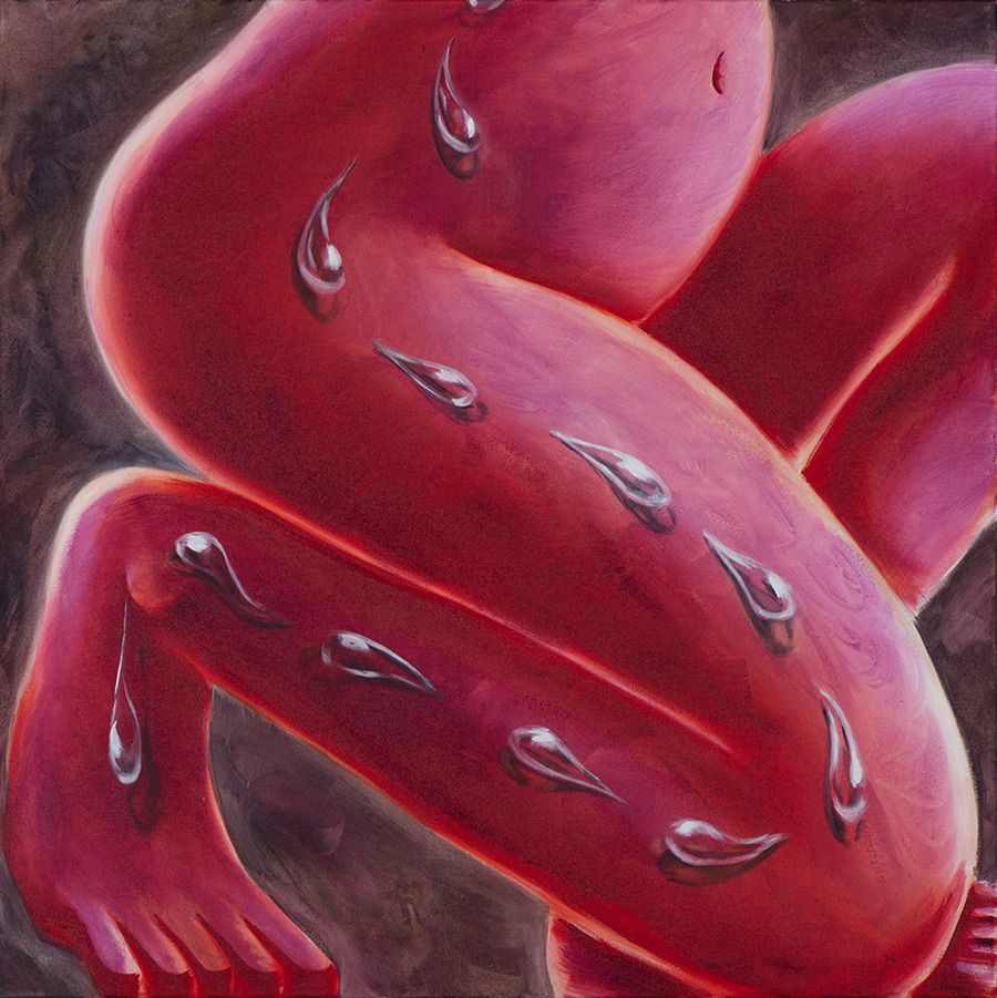 In Malcher’s world, we encounter a surreal and sensual realm, filled with vibrant and liminal spaces. Within these spaces, flushed and full-bodied nude women engage in an array of activities, from dancing and playing to running. Traditionally, male artists have employed the female form as a symbol of beauty, passiveness, fertility, or helplessness, drawing inspiration from figures such as Ingres, Botticelli, and the Venus of Willendorf. However, Malcher’s artistic practice disrupts this lineage through its unabashed audacity.