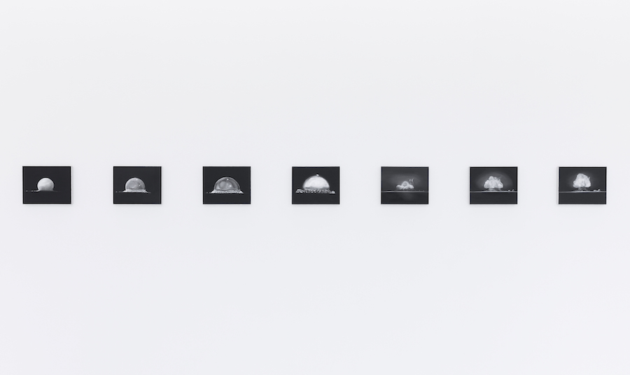 The group of paintings on view, however, are neither mightily apocalyptic nor hopeful of a forthcoming salvation. They spiral from a theme of global connectedness to an analytic acuity that deals with a vast scope of subject matters. Across the gallery two series of paintings, The Splash of a Drop (2022) and Trinity Testing (2020), of radically different topics, bear striking resemblance in their form, palette, and sequence. A drop of water unpacks its splash on one end of the gallery, from the initial contact with a surface to resumed stillness. In exact same sizes, Tan Mu deals with images from the first nuclear test in human history. Within a few seconds, the smooth, bright globe from the plutonium implosion device exploded into a mushroom cloud of debris.
