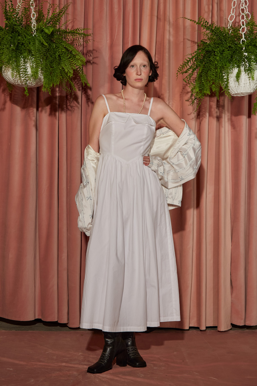 Committed to merging the worlds of fashion with interior design, the duo’s Spring / Summer 2023 outing takes a cue from dreamy “spring flings” of the 1950s, ’60s and ’70s, with a presentation that seamlessly integrated the duo’s expertise in crafting spaces as well as garments. With sets designed by the co-founders where models mingled and danced the night away, Tanner Fletcher’s “spring fling” brought the retro concept alive – but with a uniquely modern, Tanner Fletcher twist.