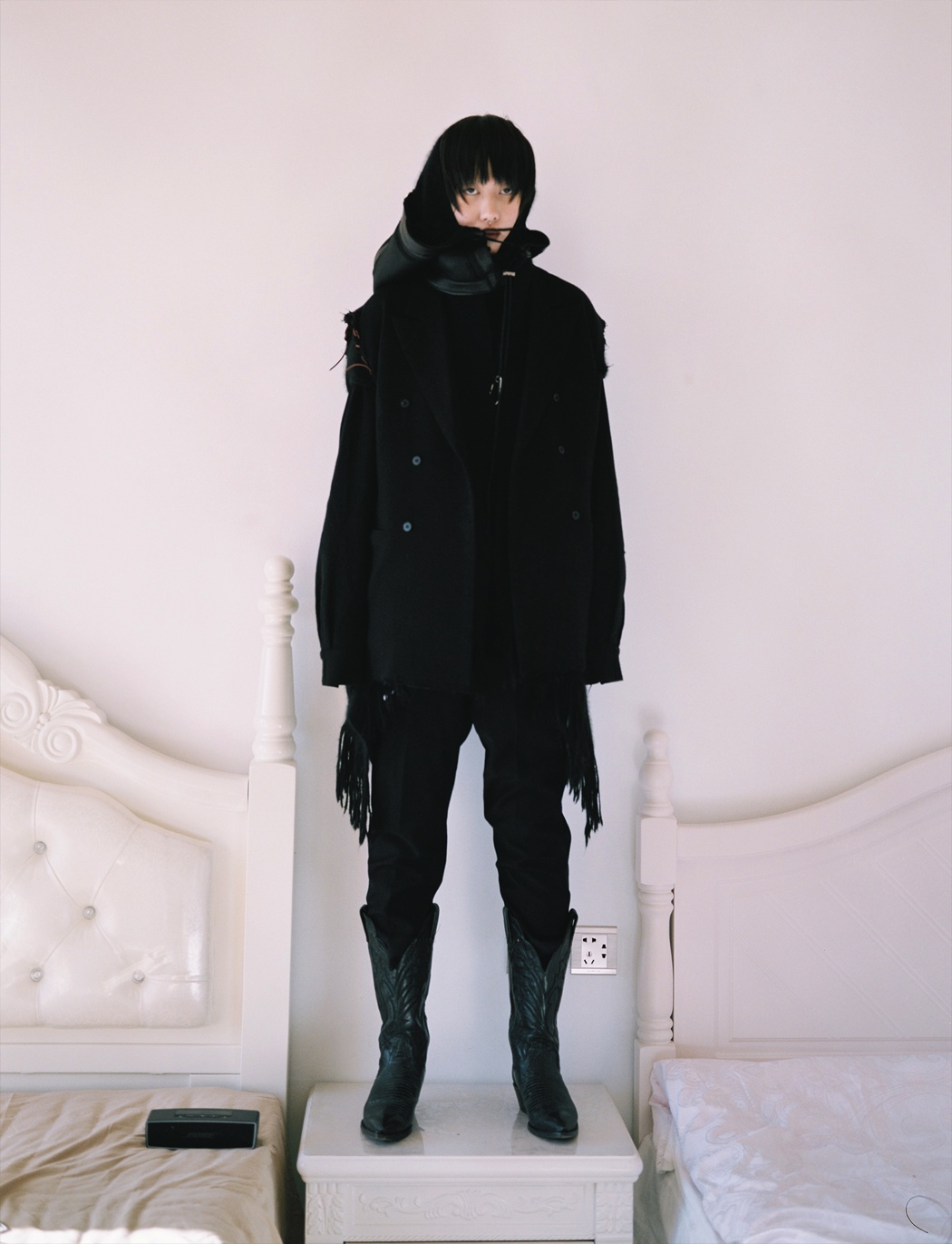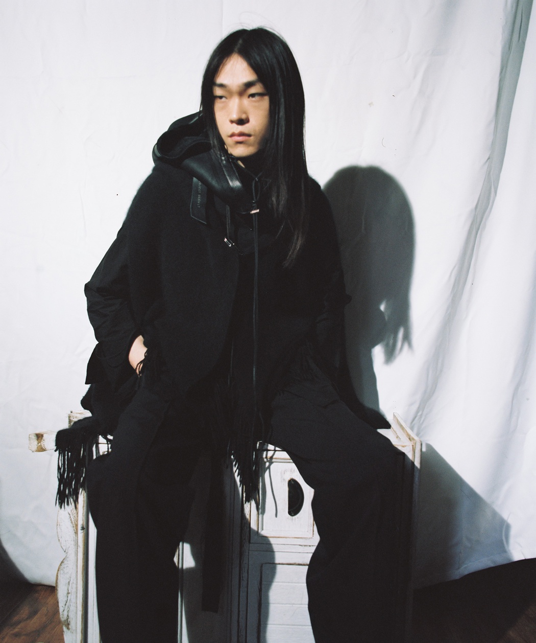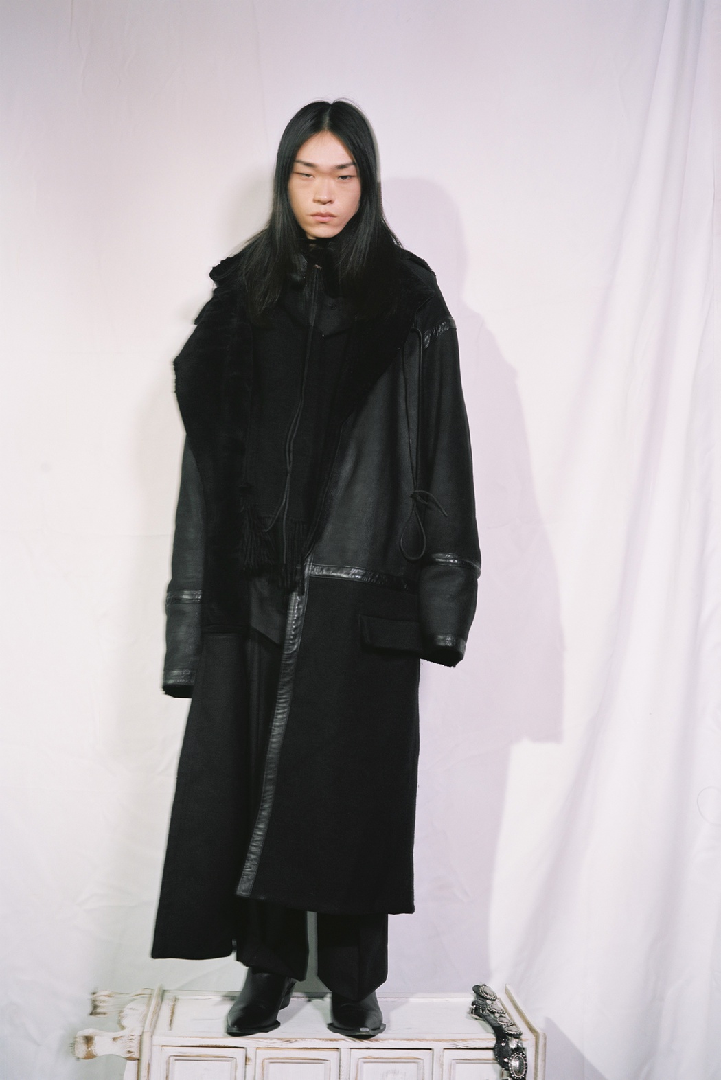 Shearling tasseled hood by Object Occult, cashmere shawl by Rick Owens, shirt by Obscur, pants by Yohji Yamamoto Shearling jacket and accessories by Object Occult Full look by Object Occult, boots by Takahiro Miyashita The Soloist, calfskin bag by Object Occult. ”Heavy ballista” shearling/ wool coat by Object Occult, pants by Yohji Yamamoto, boots by Helmut Lang, shearling tasseled rider bandana by Object Occult