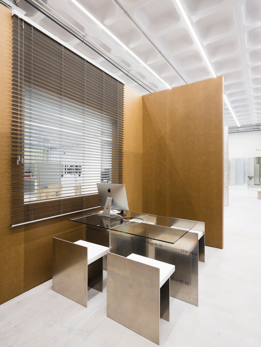 The minimalist retail space, boasting a futurist art gallery feel—think all shiny materials for separation elements, white walls and concrete floors meeting under the original coffer ceiling—is designed by renowned Berlin-based architects Gonzalez Haase. Measuring over 800 square metres,