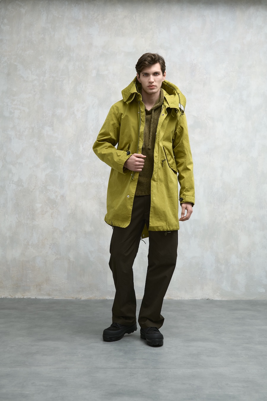 At the forefront is the iconic OJJ (Original Japanese Jersey), making a robust return in various interpretations. The garment-dyed version features a patinated, deeply textured surface that highlights the brand’s artisanal DNA. When piece-dyed and washed, OJJ takes on a softer, lived-in appearance that leads to new military-inspired designs. The down version introduces additional silhouettes with clear military references and superior thermal properties. The OJJ Ultralight 9 oz with Primaloft filling joins the lineup, ensuring maximum lightweight comfort and quick-drying capabilities. New to the collection is the OJJ Rubber Ultralight, featuring taped internal seams for complete waterproofing, available as the Kirkwool Anorak, Arran Jacket, and Milan Parka. All three models can be paired with new removable down inner jackets featuring a large diamond pattern, serving both as standalone pieces and mid-layers.