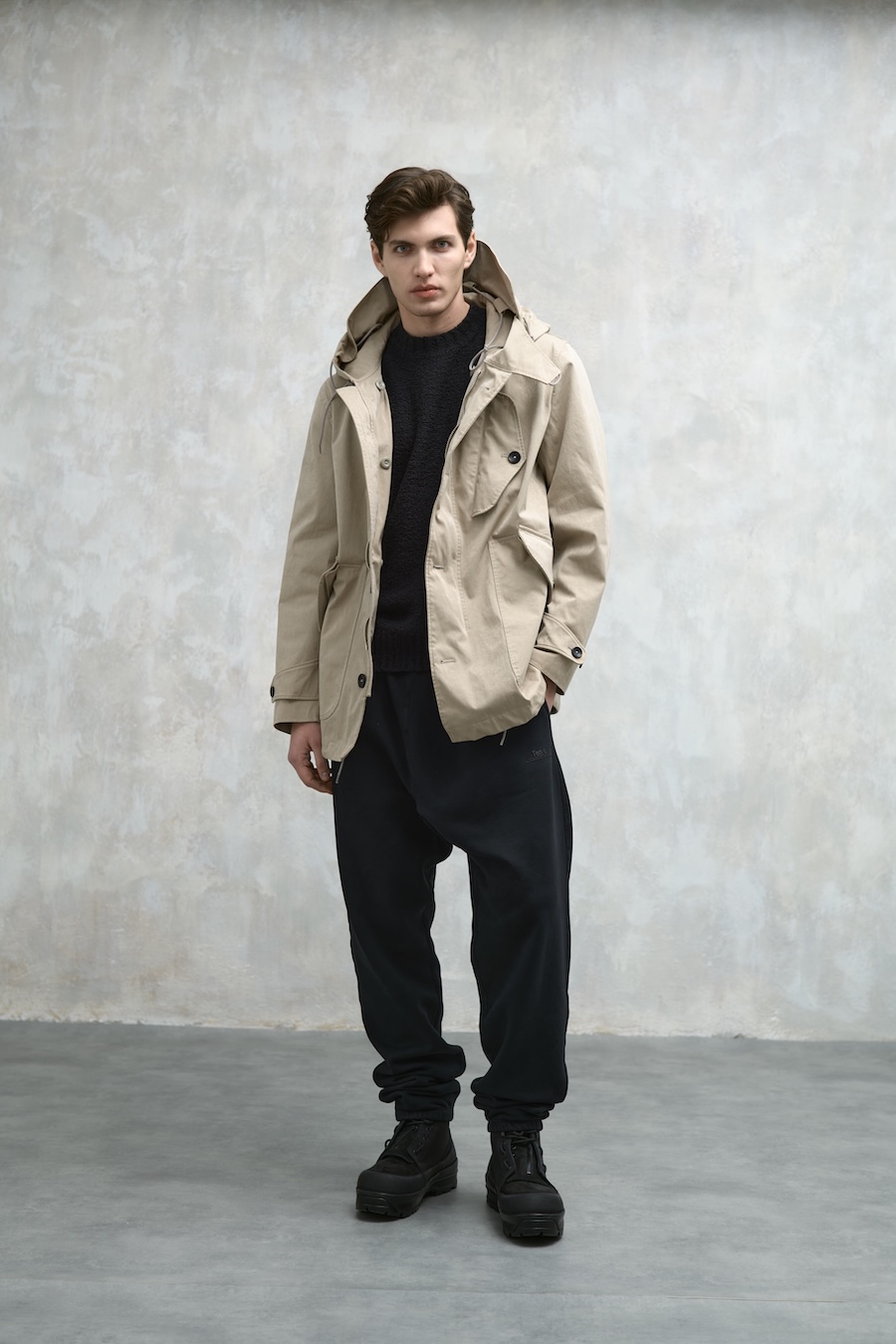 The collection also emphasises technical materials: technical nylon and ultra-light down fabrics are incorporated, soft to the touch, garment-dyed, and richly colored. Two new models crafted from matte nylon showcase detachable felt hoods. The signature Nylon Crinkle Combo OJJ returns, boasting a distinctive texture and military-inspired look.