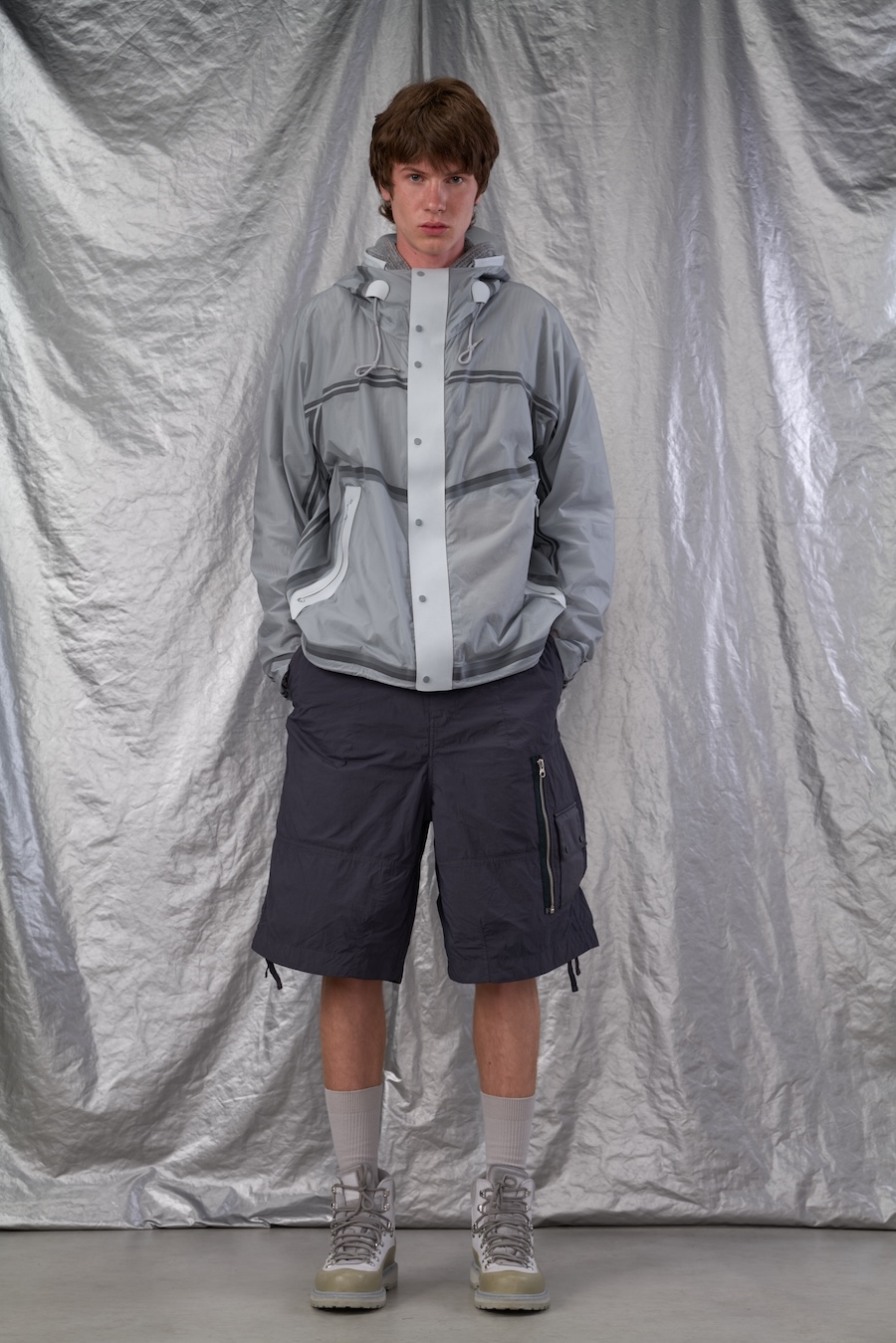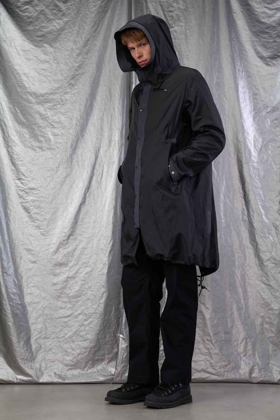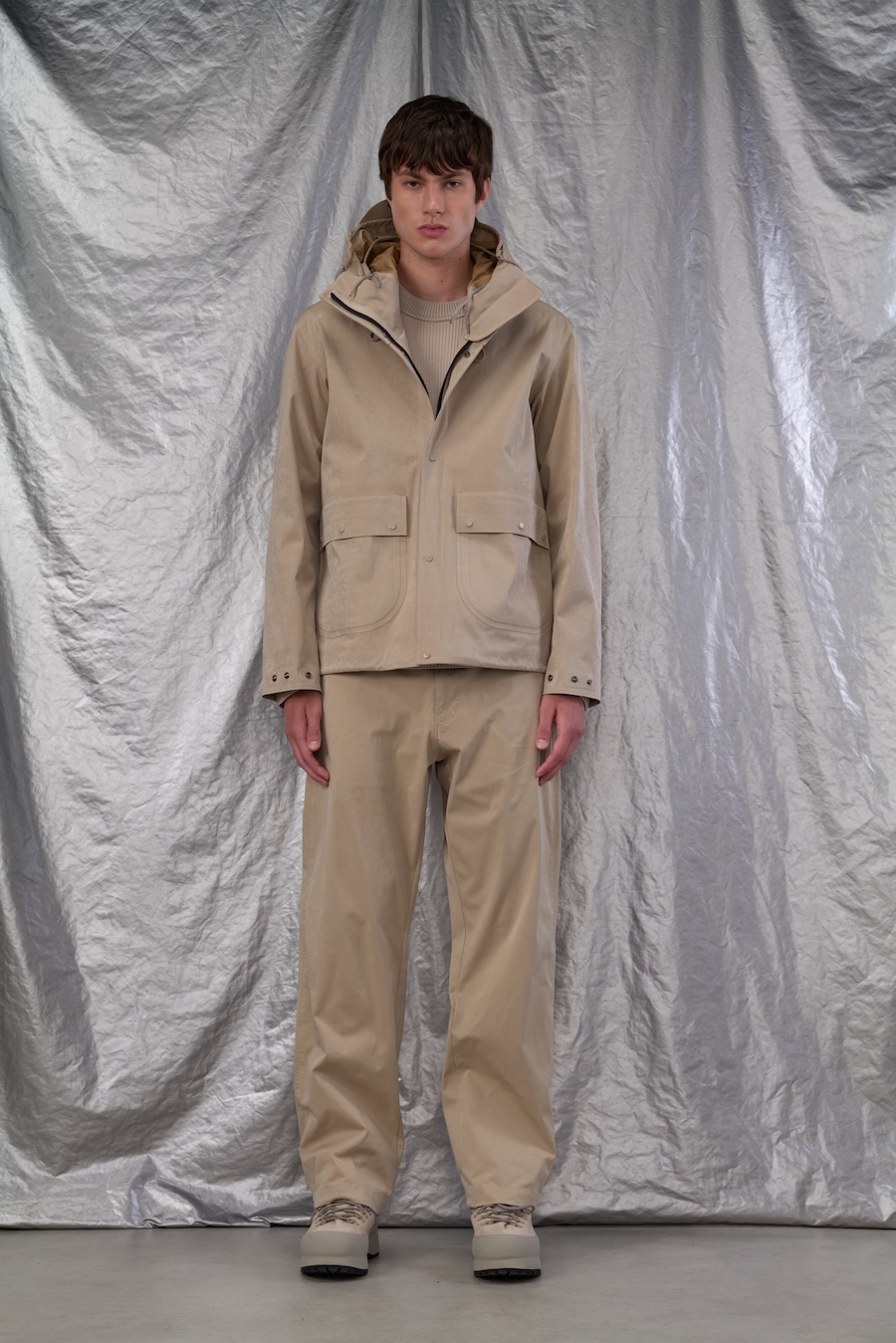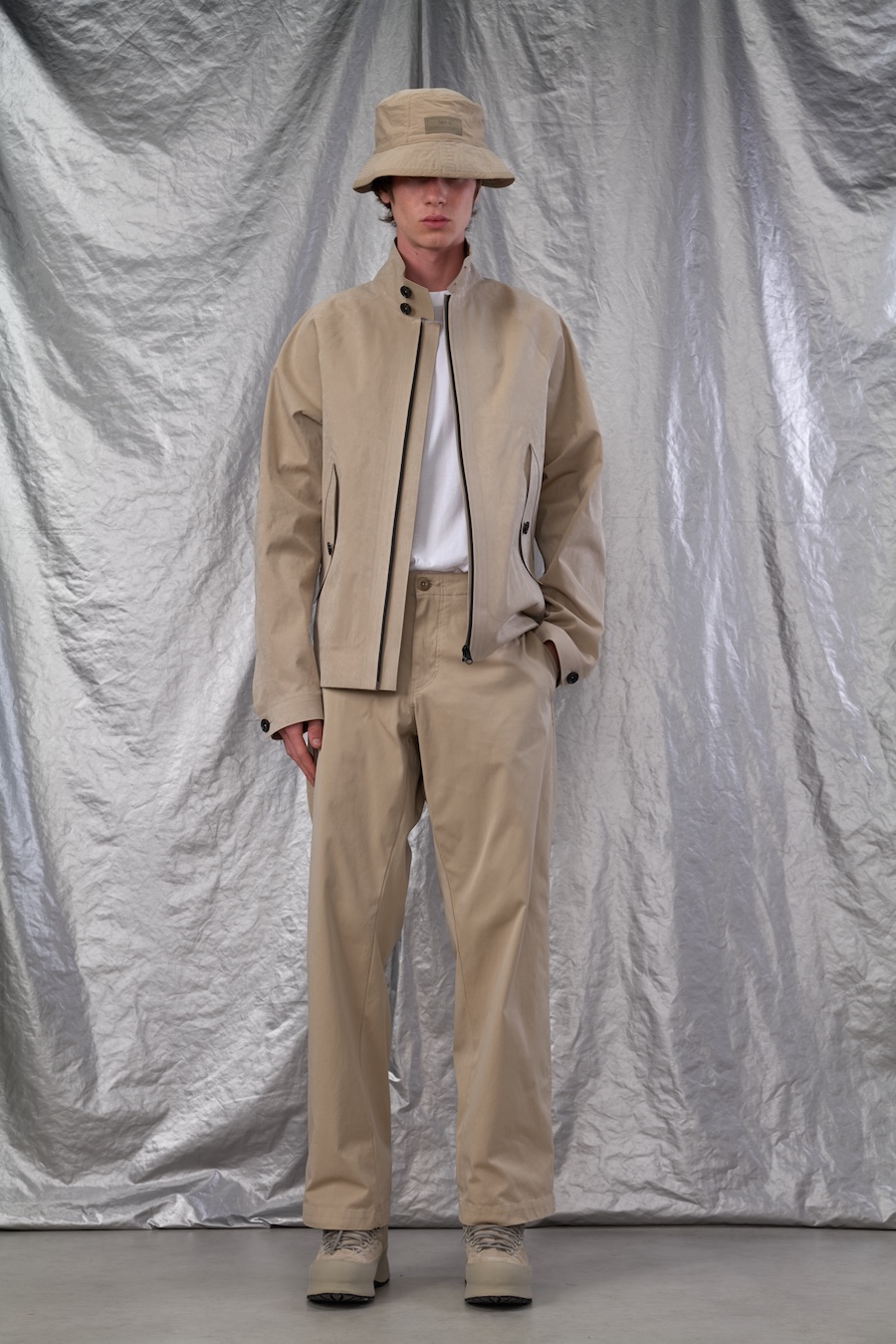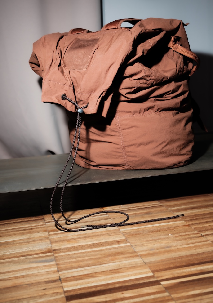 Laser cutting, utilised for precise, seamless finishes, lends a clean, futuristic look to each piece, while functional fabrics like structured cotton and nylon canvas are presented with a modern, practical finish.