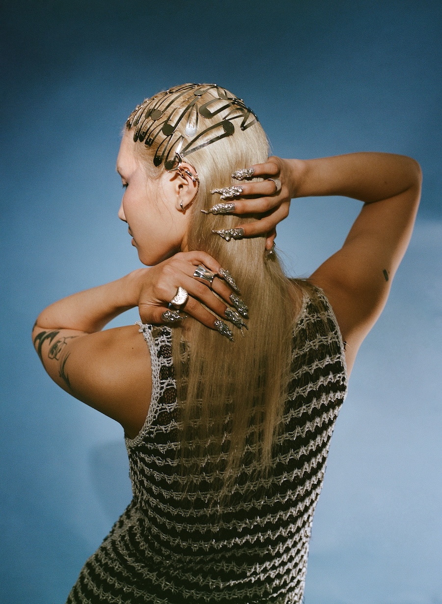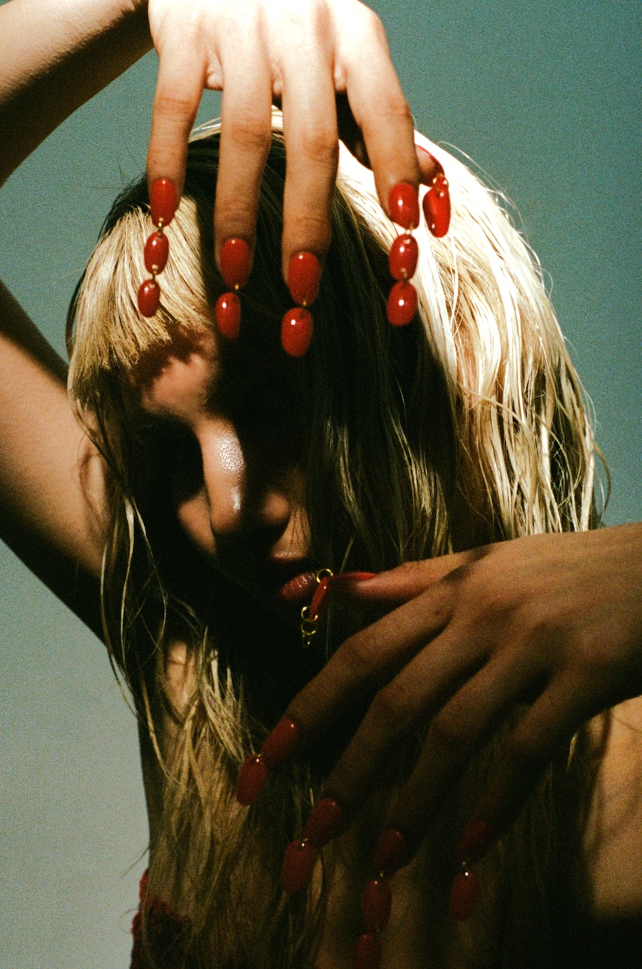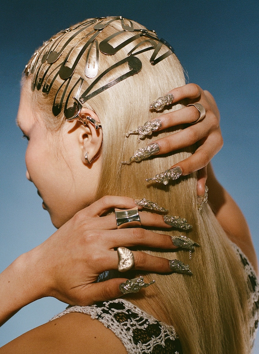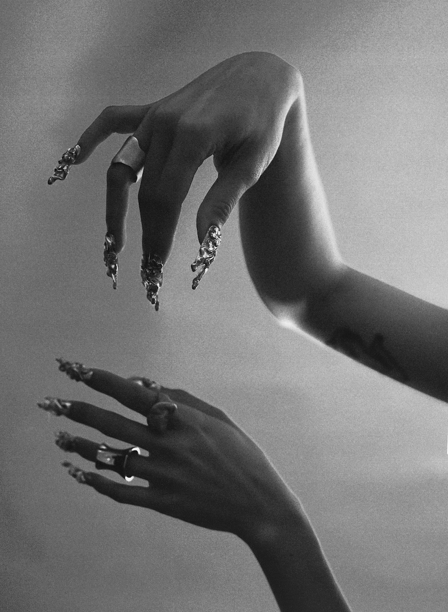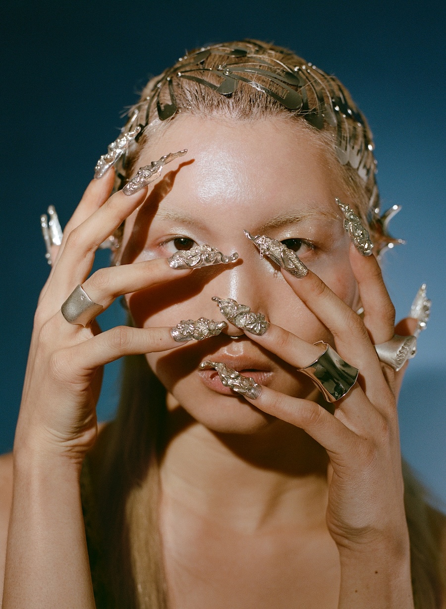 “The body is a shifting landscape transformed by surfaces and sensations. Each look captures a different tactile world: the heat of blood, the cool weight of metal, the yielding drift of water. The result is a sculptural study of how the elements carve, shield, and release the self. The materials we embody become the emotions we carry, and the body becomes a materialised exhibition of our emotions, from the pulse of Blood to the discipline of Metal to the surrender of Water.”