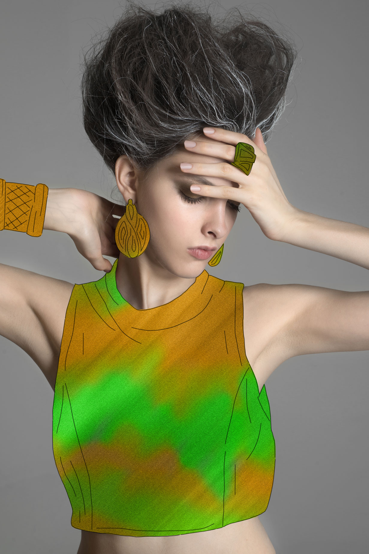 The concept of the editorial linked to the title is because the illustrations create a sense of separation from the photos and from reality, as if she is trying tI o appear fashionable, fancy, but she is naked underneath it. — a bare human.
