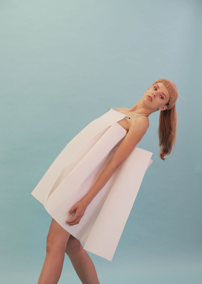 “The Act of Formation is my diploma project. In the collection I deal with the topic of expression of architectural principles by means of clothing. The main source of inspiration is the personality and work of prof. Ing. Arch. Eva Jiřičné, CBE. I look for a link between seemingly different worlds of architecture and clothing. Based on the aesthetic characteristics and design principles of the buildings, I model the flat textile material. Following the inner (interior visions of the architect) of the external (aesthetic facade) principles. To support the idea I use industrial technical fabrics and materials. Key words for this collection would by: texture, refraction, dimension I try not to take fashion too seriously. We tried to keep the shoot playful as well and give it a little retro vibe- the London pop scene of the 70s was a great inspiration for that.“ says designer Agata Zapotilova. Photography by Anna Urik.