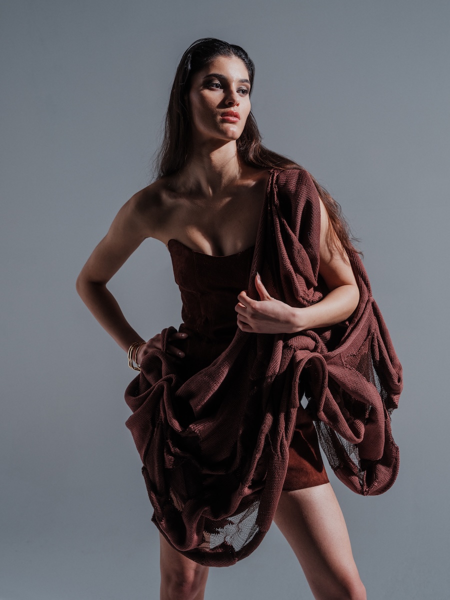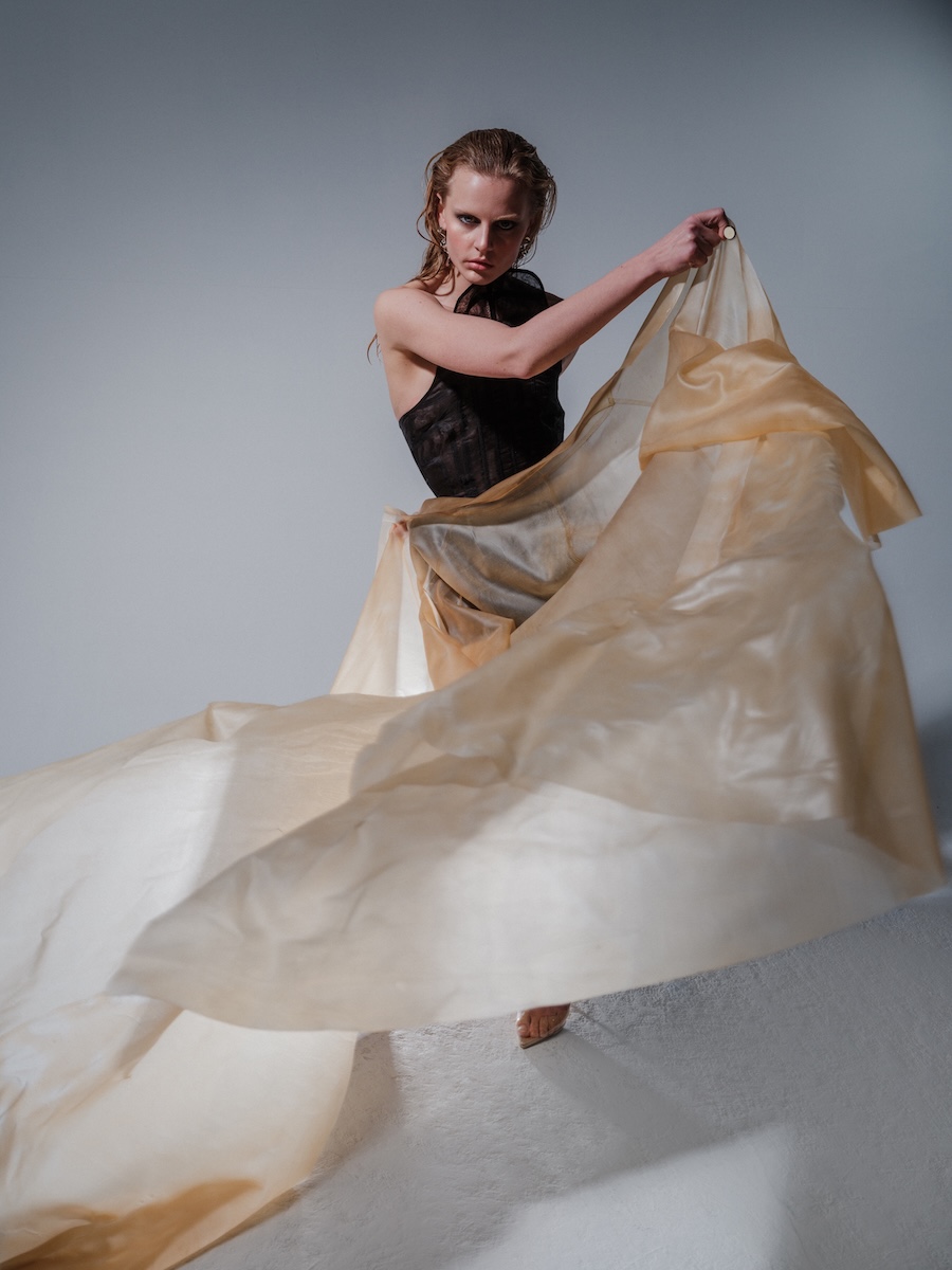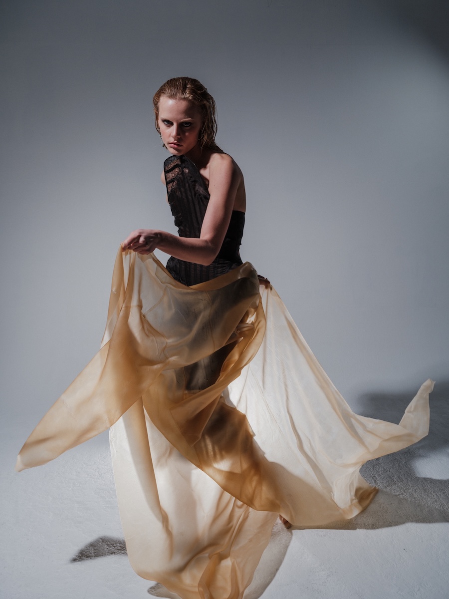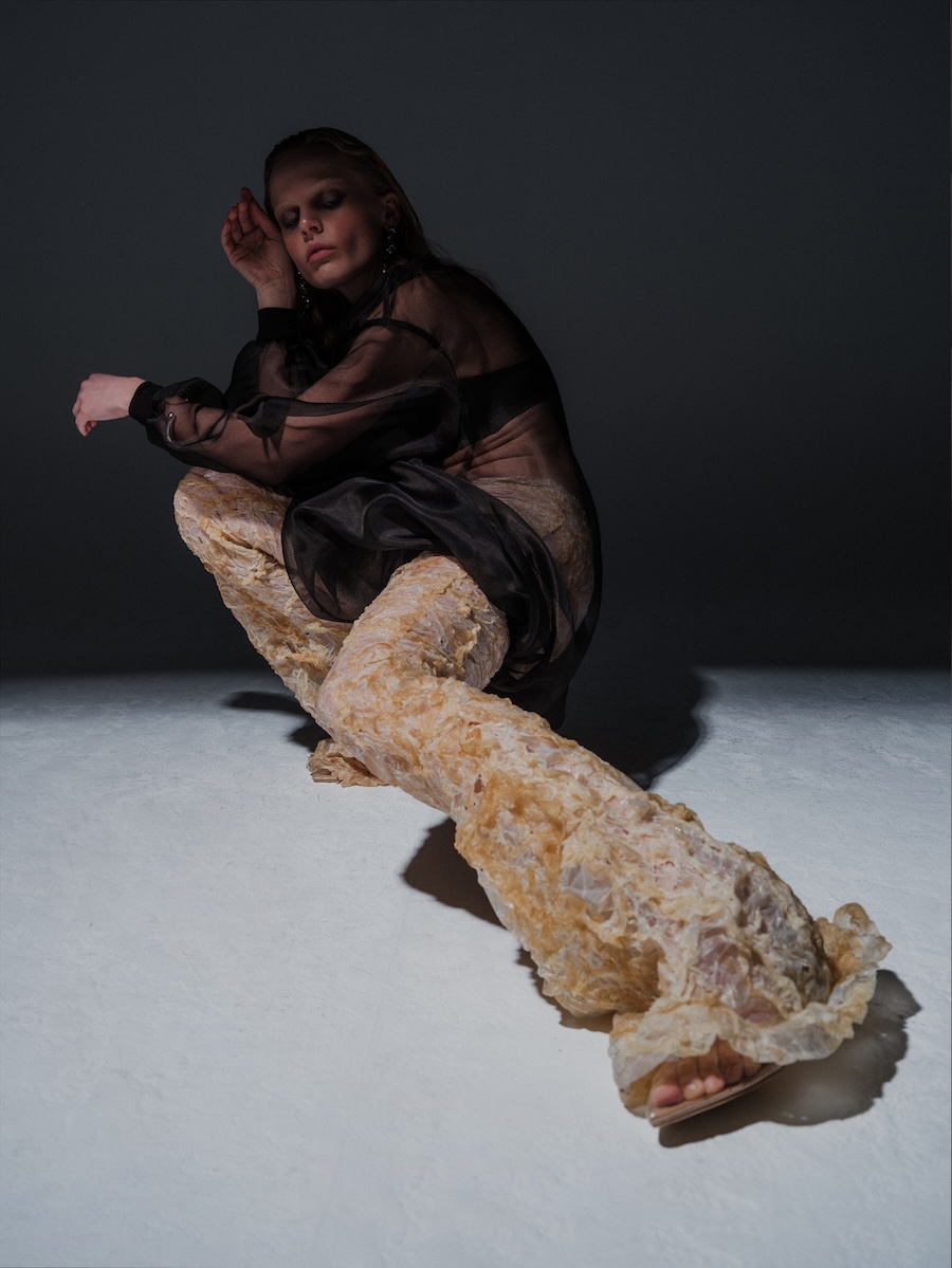Sculptural tailoring and transparent fabrics draw reference to the body‘s inner structure, while a wide range of textures from second-skin silhouettes to loosely draped volumes showcase the outer transformation of skin over time. At its core, the editorial proposes a new perspective on age, rooted in appreciation rather than stigma, recognising the ageing body as a record of personal history and individual experience.