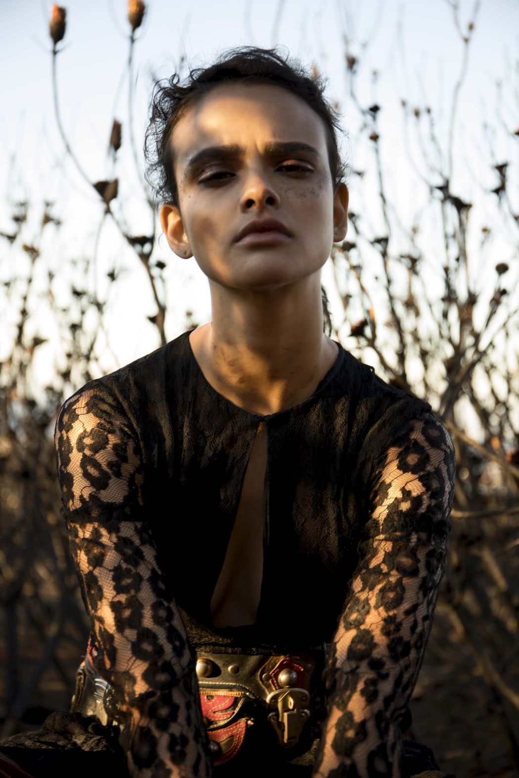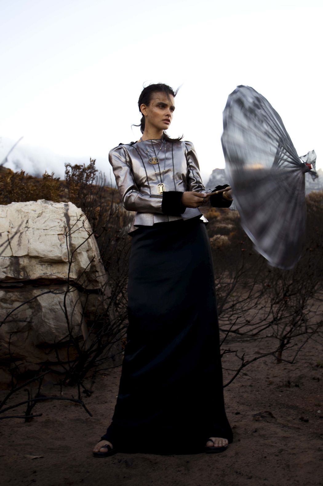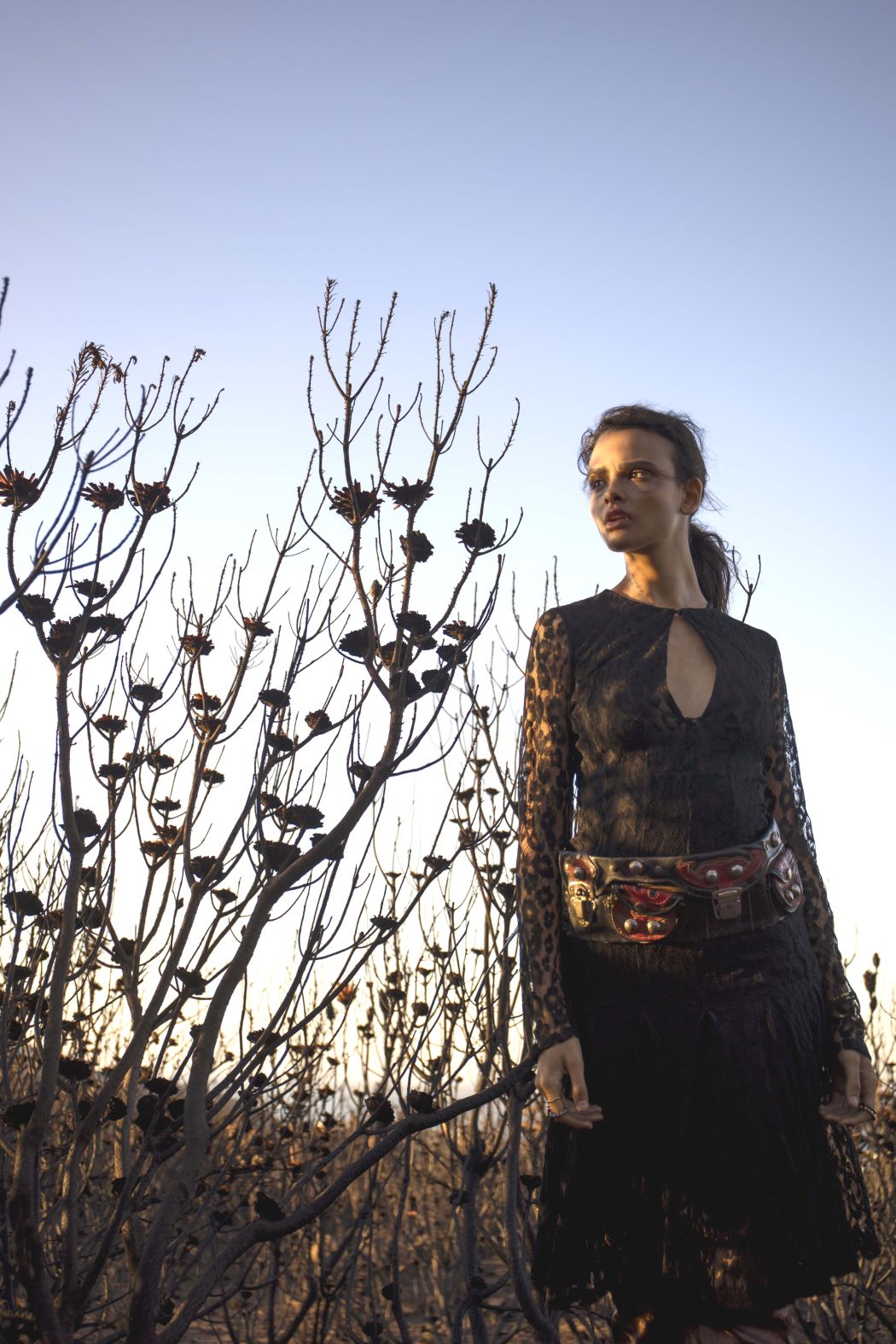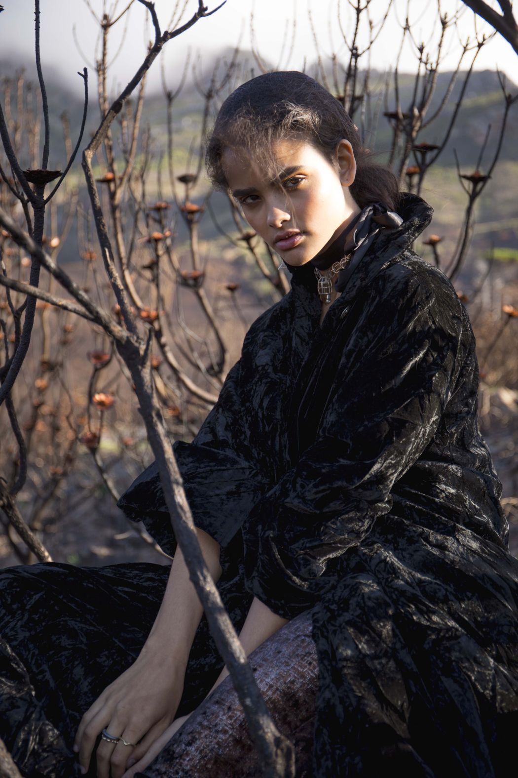 A KALTBLUT exclusive womenswear fashion editorial. Photograper Mari Hagger styled and captured Samara Martins signed to Wilhemina NY and Full Circle SA for us. Hair and make up by Niki Vos.Location was the side of Table Mountain in Cape Town which recently burnt furiously all night from an arson incident. The trees and bushes remained strong but burnt blacker than black and orange flower buds began to regrow. The shoot day was incredibly windy and within 2 hours we were all covered in ash! Makeup artist Niki Vos (from Amsterdam) was inspired after a hike up to the location and ideas from Africa Burn, the autumnal burnt colours and used parts of our surrounding foliage to add to the makeup.