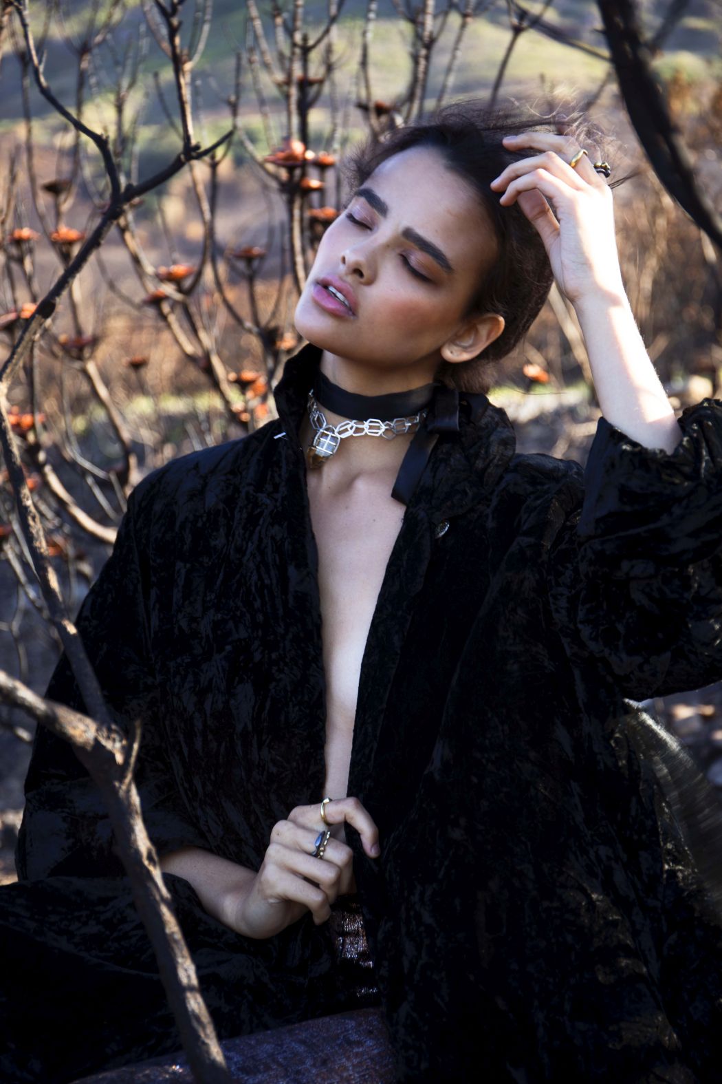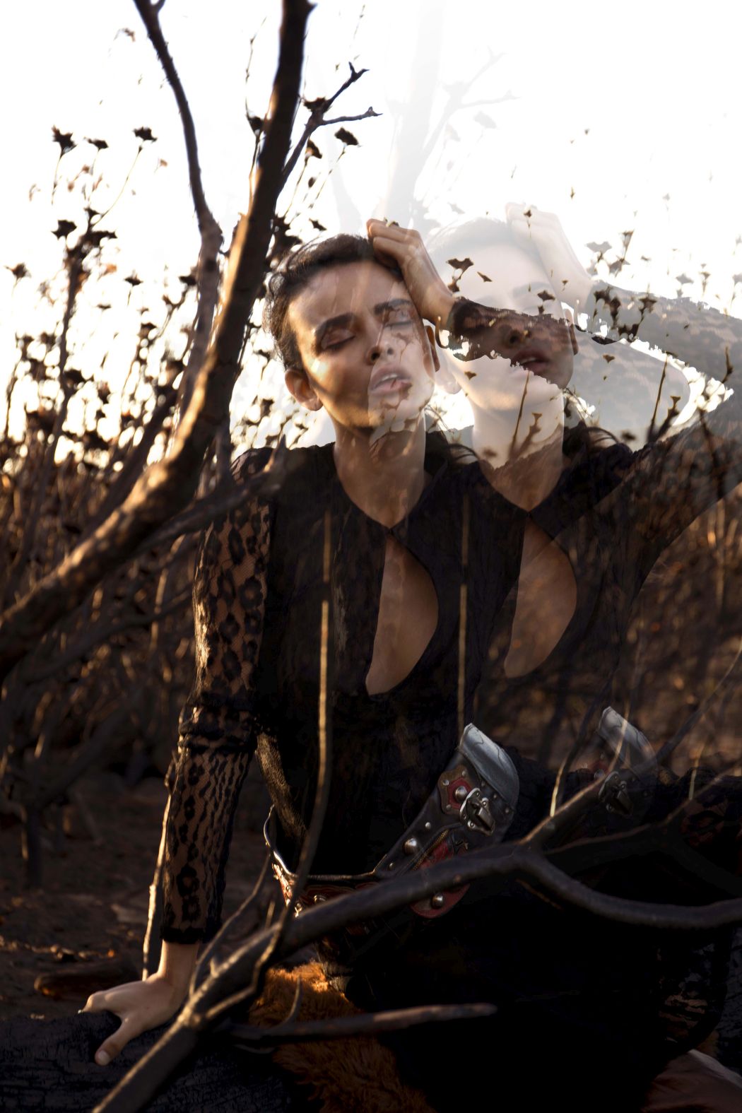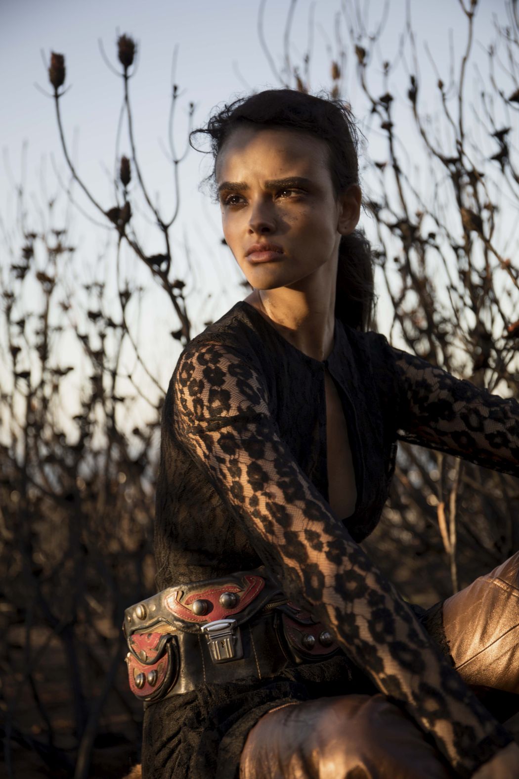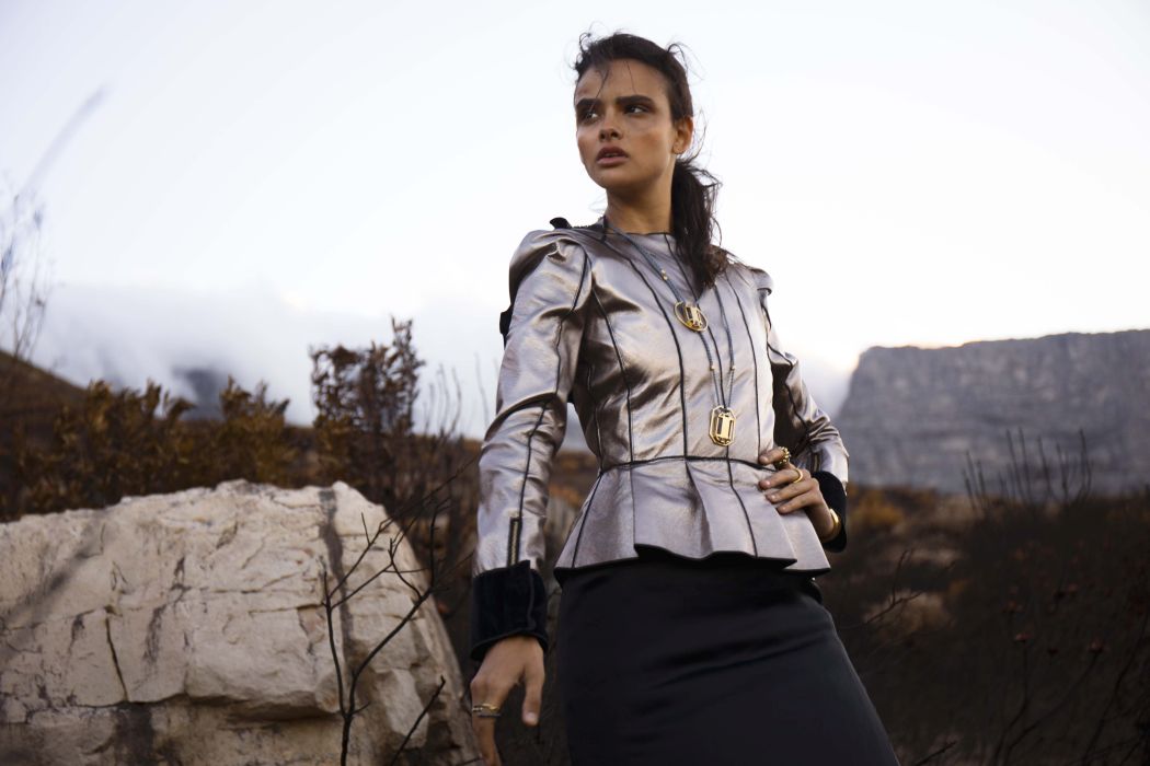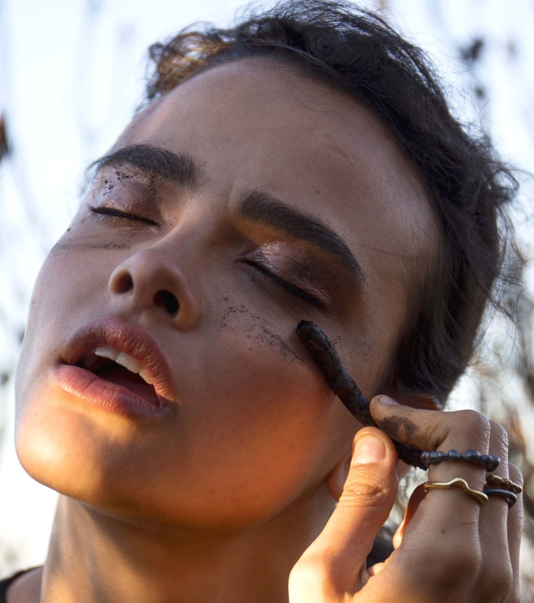 A KALTBLUT exclusive womenswear fashion editorial. Photograper Mari Hagger styled and captured Samara Martins signed to Wilhemina NY and Full Circle SA for us. Hair and make up by Niki Vos.Location was the side of Table Mountain in Cape Town which recently burnt furiously all night from an arson incident. The trees and bushes remained strong but burnt blacker than black and orange flower buds began to regrow. The shoot day was incredibly windy and within 2 hours we were all covered in ash! Makeup artist Niki Vos (from Amsterdam) was inspired after a hike up to the location and ideas from Africa Burn, the autumnal burnt colours and used parts of our surrounding foliage to add to the makeup.