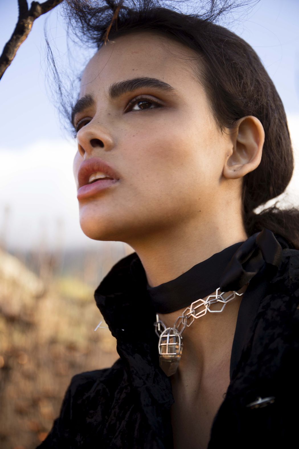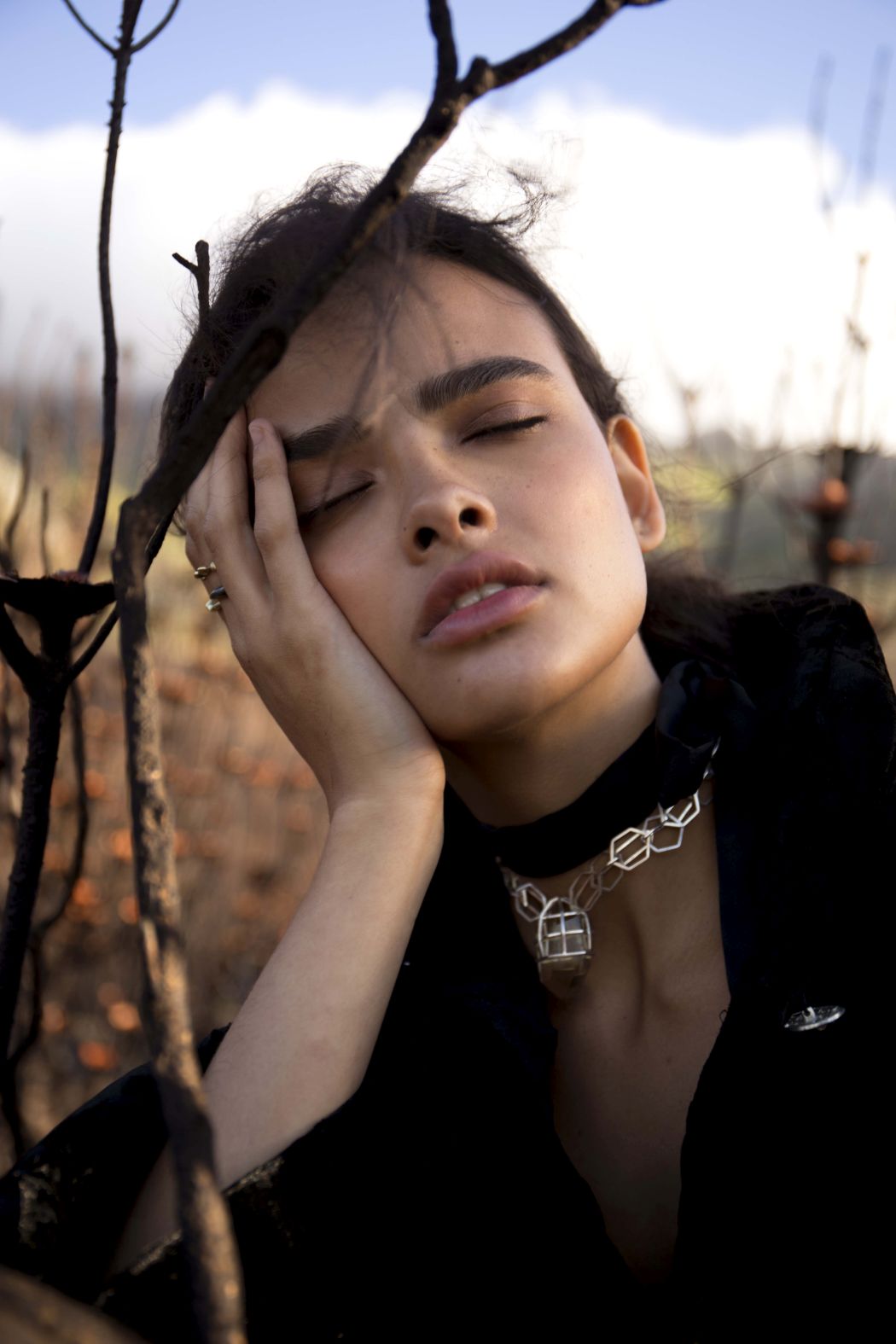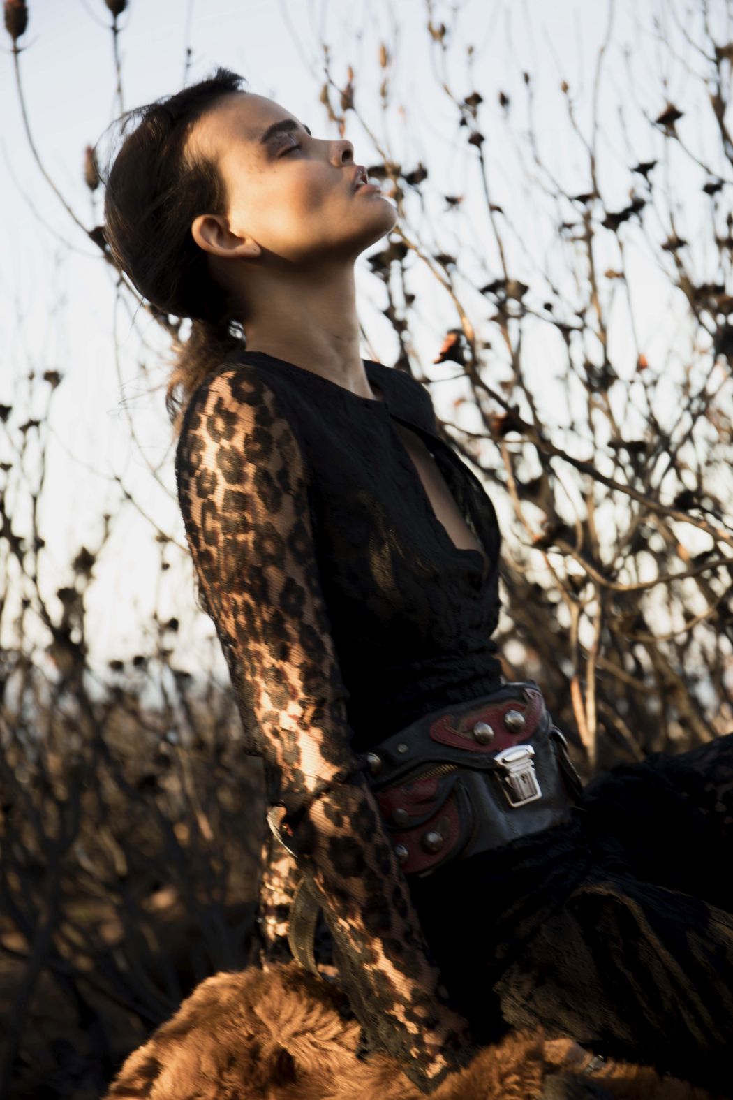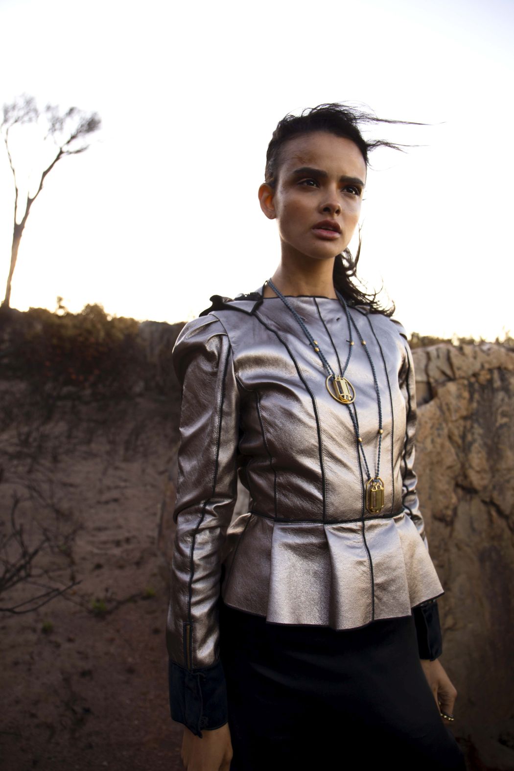 A KALTBLUT exclusive womenswear fashion editorial. Photograper Mari Hagger styled and captured Samara Martins signed to Wilhemina NY and Full Circle SA for us. Hair and make up by Niki Vos.Location was the side of Table Mountain in Cape Town which recently burnt furiously all night from an arson incident. The trees and bushes remained strong but burnt blacker than black and orange flower buds began to regrow. The shoot day was incredibly windy and within 2 hours we were all covered in ash! Makeup artist Niki Vos (from Amsterdam) was inspired after a hike up to the location and ideas from Africa Burn, the autumnal burnt colours and used parts of our surrounding foliage to add to the makeup.