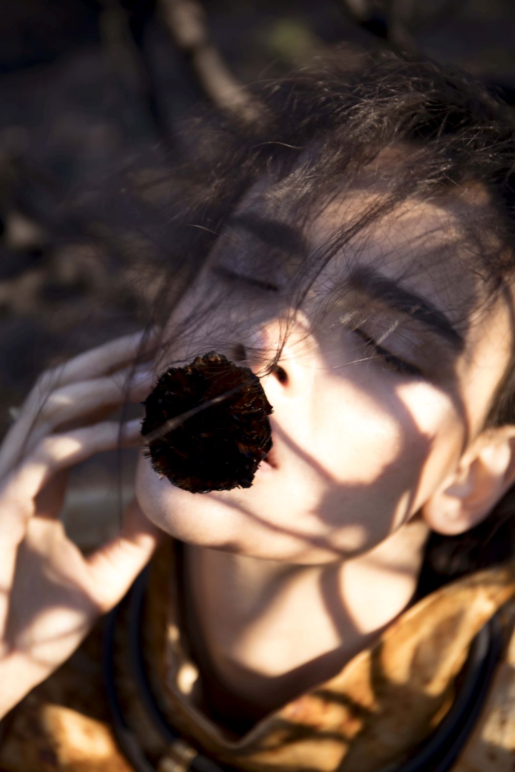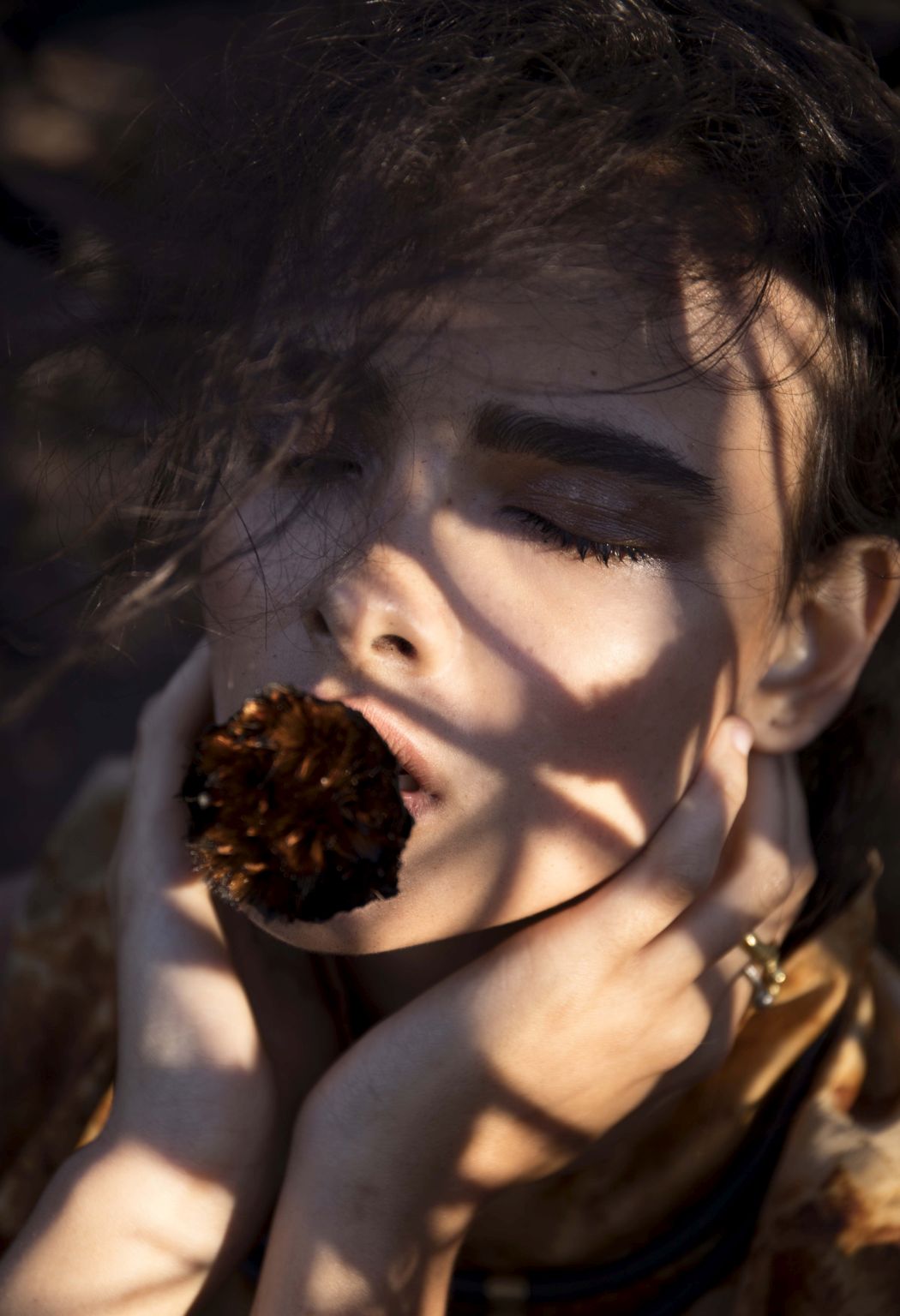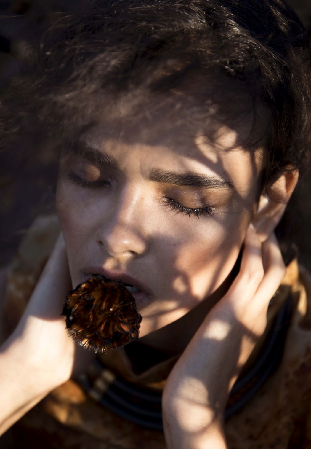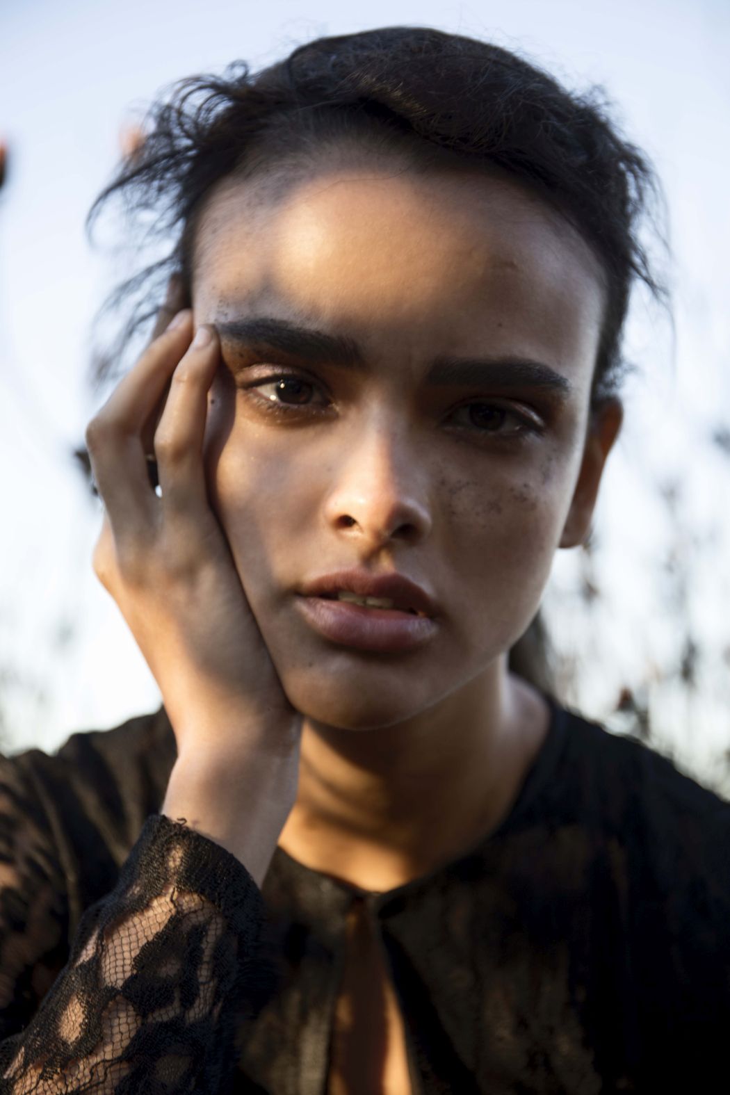 A KALTBLUT exclusive womenswear fashion editorial. Photograper Mari Hagger styled and captured Samara Martins signed to Wilhemina NY and Full Circle SA for us. Hair and make up by Niki Vos.Location was the side of Table Mountain in Cape Town which recently burnt furiously all night from an arson incident. The trees and bushes remained strong but burnt blacker than black and orange flower buds began to regrow. The shoot day was incredibly windy and within 2 hours we were all covered in ash! Makeup artist Niki Vos (from Amsterdam) was inspired after a hike up to the location and ideas from Africa Burn, the autumnal burnt colours and used parts of our surrounding foliage to add to the makeup.