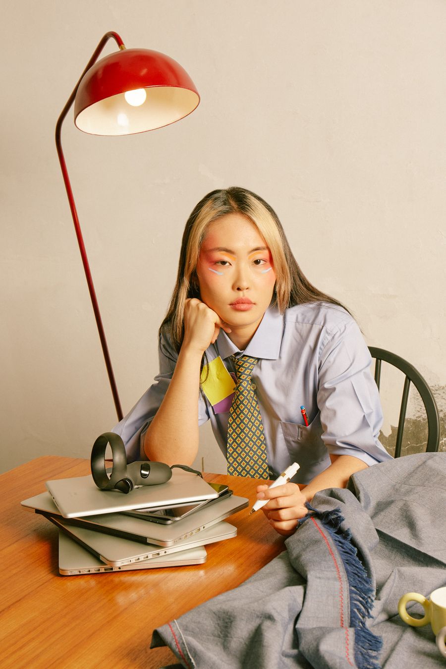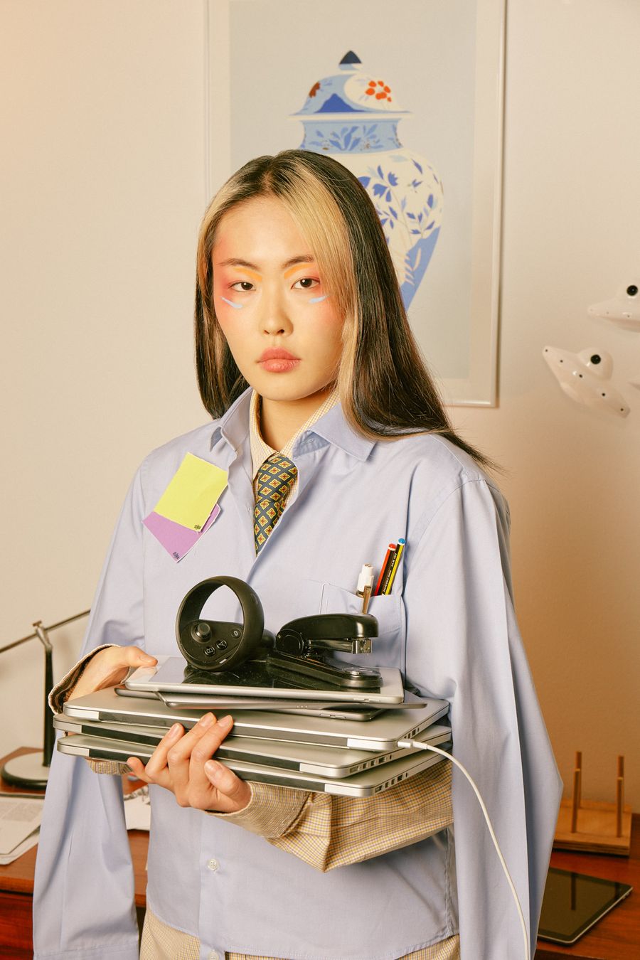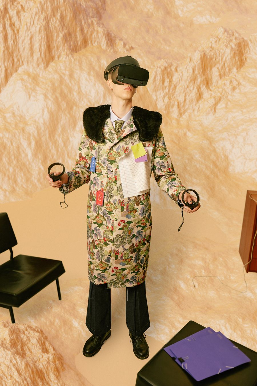 The collection “The business year” starts from the circumstances we were living through after the pandemic of the COVID. Teleworking became our daily life and this made us enable a corner of the house to turn into our office. This project aims to reflect that space of the house that has ceased to be so to become a hybrid of our office, but also in our dining area, leisure … as we spend all our time in the same place. In a place where technology predominates, and with a dystopian vision, virtual reality glasses make the experience of confinement different.