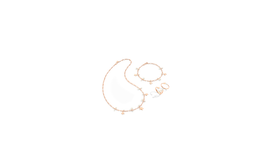 All the jewellery pieces in the collection, made of 9-karat rose gold, play with delicate crystal beads, thin chains and iconic asterisks, focused on a determined and sympathetic without abandoning its feminine and romantic style, Stellina interprets the classic pearls in a more contemporary and fashionable context and in a typically DoDo way.