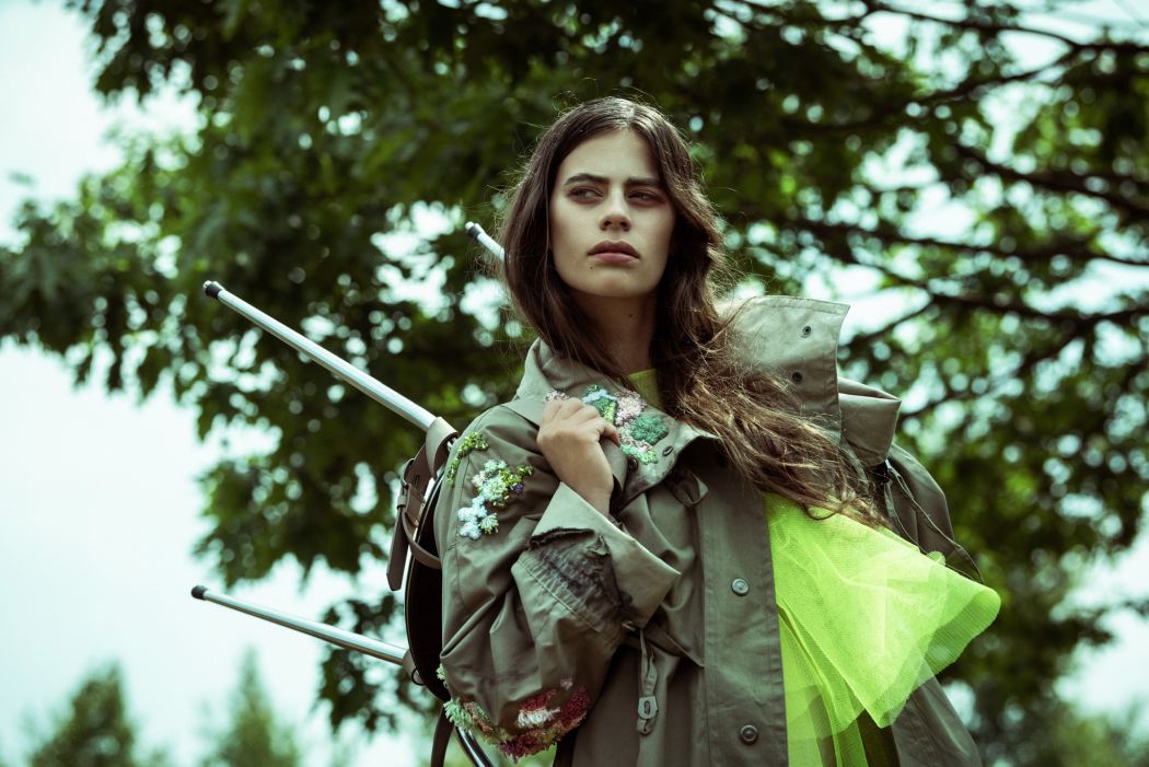 Now, within the fashionshoot we are presenting here, we took this basic idea a step further. The chair, no longer being a foreign object disconnected from ourselves that we can use to how it pleases us. The chair has somehow become part of the body itself. It has become a presence with a definite weight, weighing on oneself, being there and staying there, bound to the body. The wonderful Julie Vanelderen (Atelier Covered) has taken this idea and added a very strong element of nature overflowing human reality. Symbolizing the immobility of humanity, its resignation, and translating it into a beautifully handcrafted and customized ensemble that adds an overgrowing nature into the complete.” says Lieven Gouwy