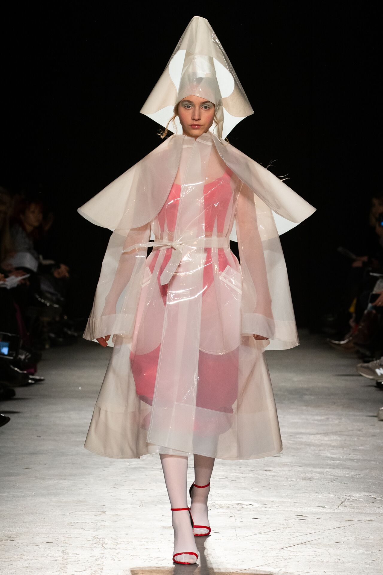 Then came sexy nuns. Yes, you heard me correctly. It wouldn’t be a decent graduate show without a little bit of low budget horror and a 1970s porn throwback. Enter Fennuala Butterfield with a collection contrasting purity and innocence against repressed sexuality. Severe, restrained outerwear is juxtaposed with voluminous draping in striking silhouettes as Virgin cotton pushes against PVC vinyl in a palette of blushing pinks and harsh reds, perfectly offsetting the crisp clean whites.
