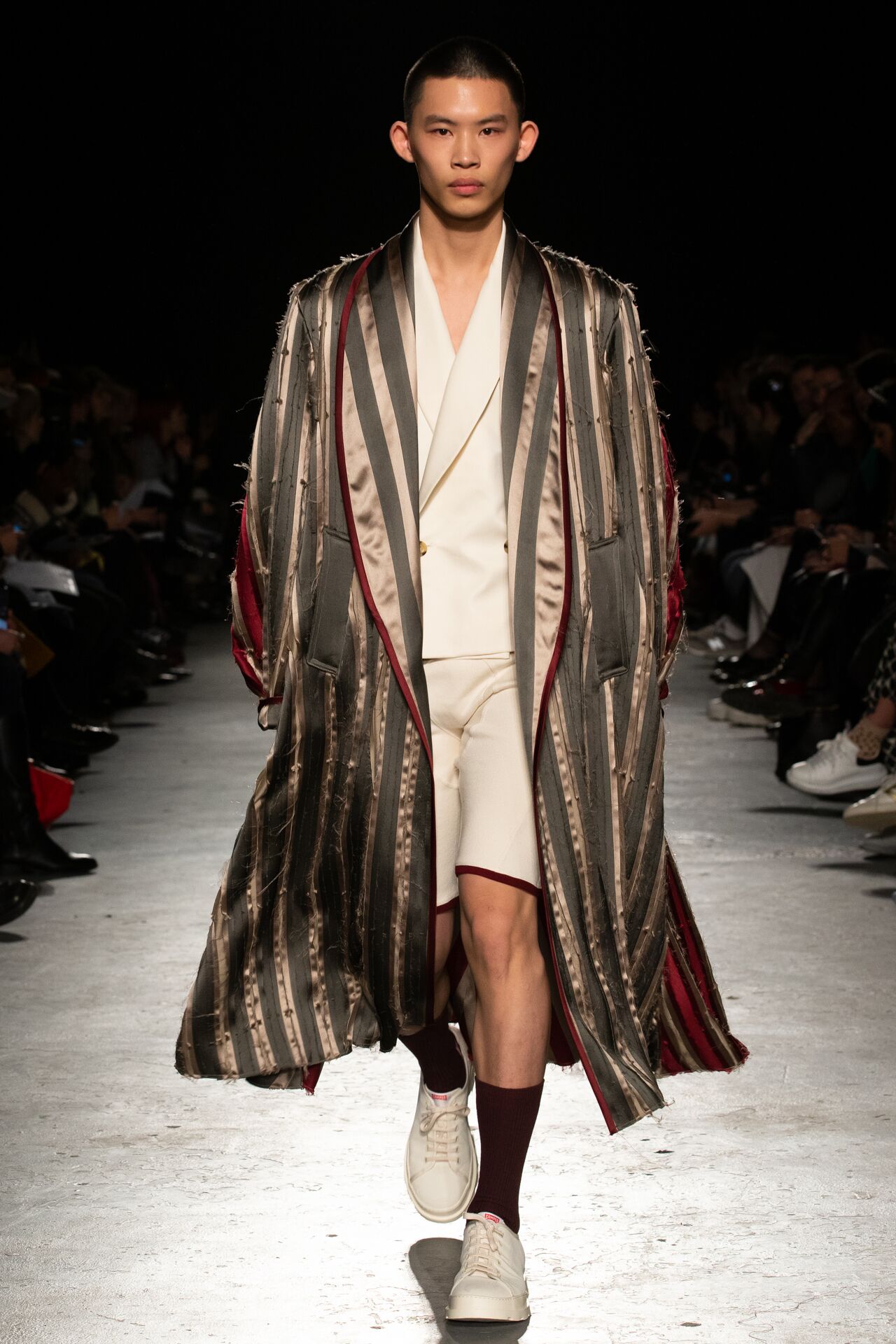 Steven Stokey-Daley tackled themes of homosociality and the romantic portrayals of British public school cultures as rich outerwear crisp-cut trousers are layered beneath knitted sleepwear and adorned with fanciful, frivolous hats inspired by regatta boat racing traditions.