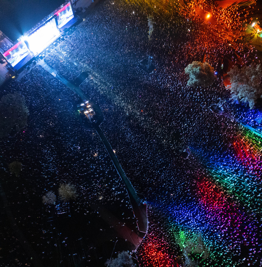 Seasons change but the emotionally raw performance that Future Islands brought sure hasn’t. “We Are Future Islands, this is what we fuckin’ do!” lead singer Sam Herring declared as they launched into a tight 12-song set that spanned the beloved years of their career. The sun was setting as Empire of the Sun appeared, entrancing the audience with trippy visuals and officially getting the evening dance party started. Appearing live for the first time in over 3 years, MGMT took nostalgia to the next level performing their 2007 debut album Oracular Spectacular in full. The synth duo included home videos of the making of the album, paper-mache puppets and even a children’s choir to add to the youthful fanfare of the album. Turns out the best way to fire up an audience of elder Millennials is to hit play on “Kids.” M83 closed out the Stardust stage with a career-spanning setlist that oddly left out Saturdays=Youth but still blew the audience away with his iconic sweeping soundscapes and multi-instrumental band. Last but not least, headliner Yeah Yeah Yeahs brought the fiery energy that has cradled them in all of our hearts since they formed in 2000. From “Maps” to “Spitting Off The Edge of the World” to “Zero,” the setlist was pure joy-inducing. Indian singer-songwriter Imaad Wasif joined the band on guitar and of course, lead singer Karen O didn’t miss the opportunity to wish everyone a Happy Mother’s Day – and even got the crowd to sing “Happy Birthday” to her “old man” who had joined us in the crowd.