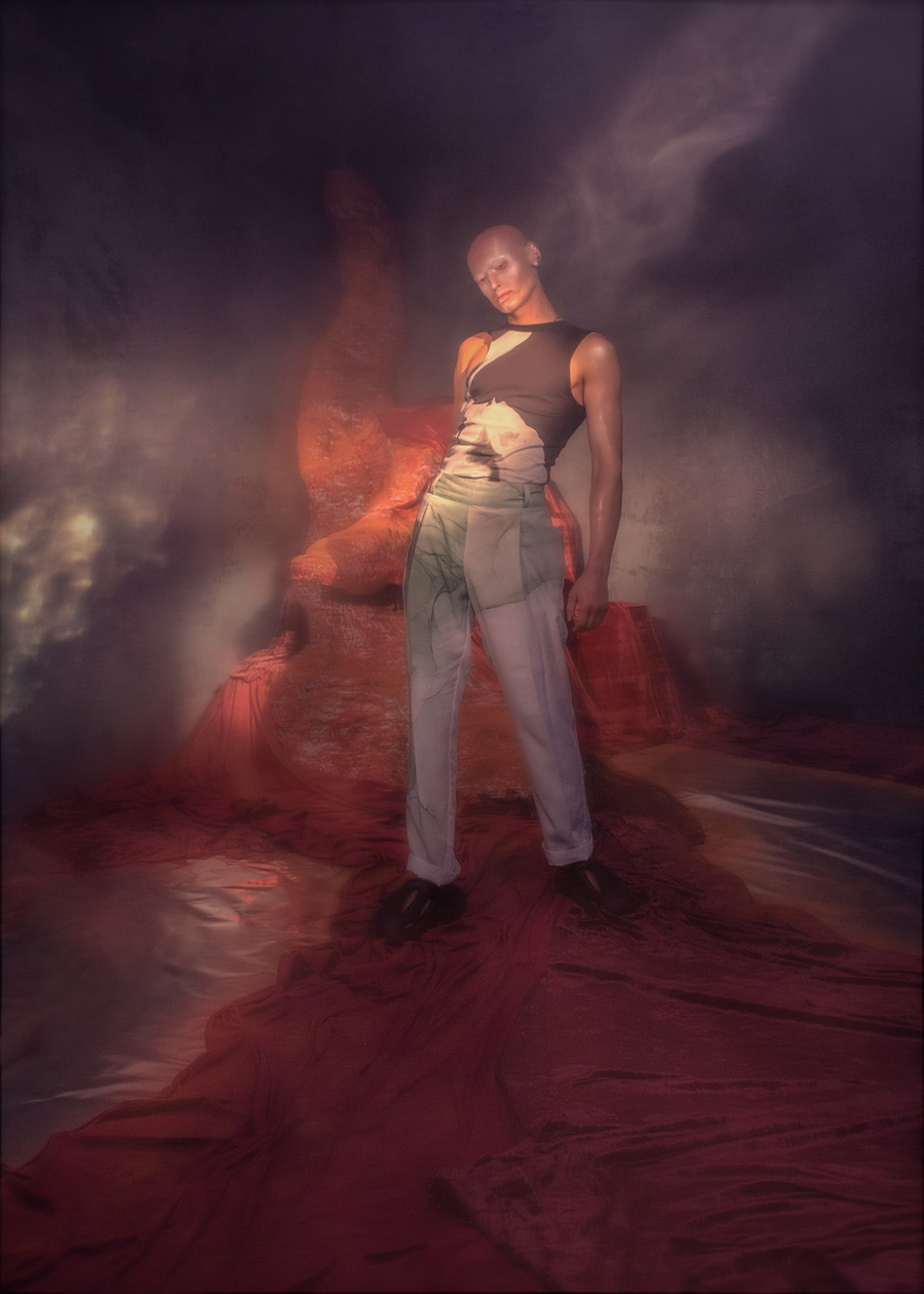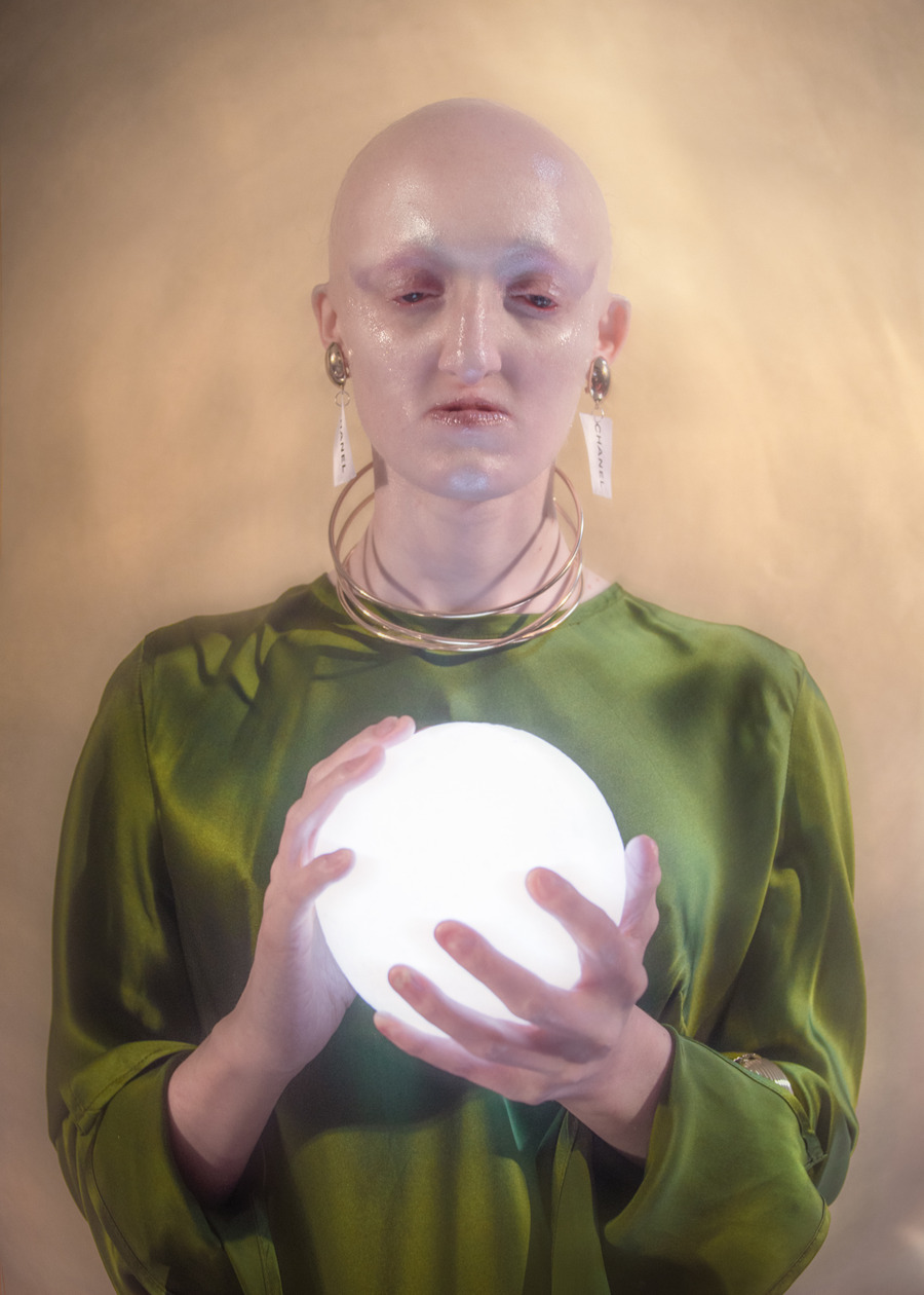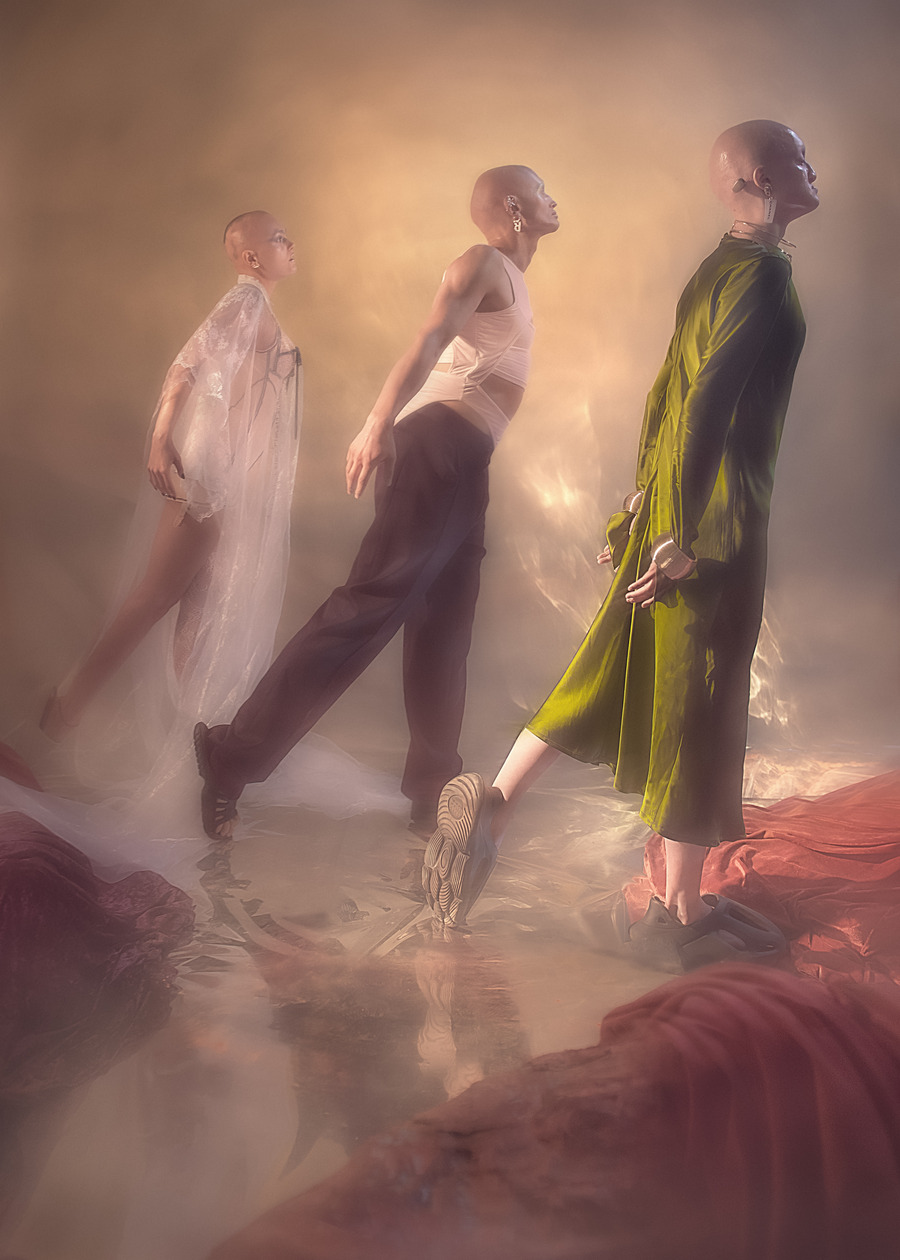 Ethereal beings wander a barren landscape at night in The Gloaming by fashion photographer Lucy Feng. A strange desolate landscape, somewhat martian in appearance with dry, dusty terrain and pools of water, crafted by set designer Matthew Lawrence. There’s a strange and “other” quality about the figures, portrayed through otherworldly styling by Lewis Robert Cameron alongside three-dimensional futurist beauty from make-up artist Yoko Minami and prosthetic artist Charle Ivey. A KALTBLUT exclusive.