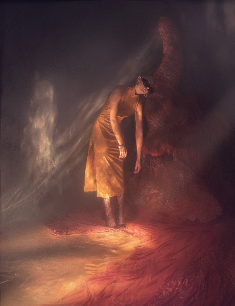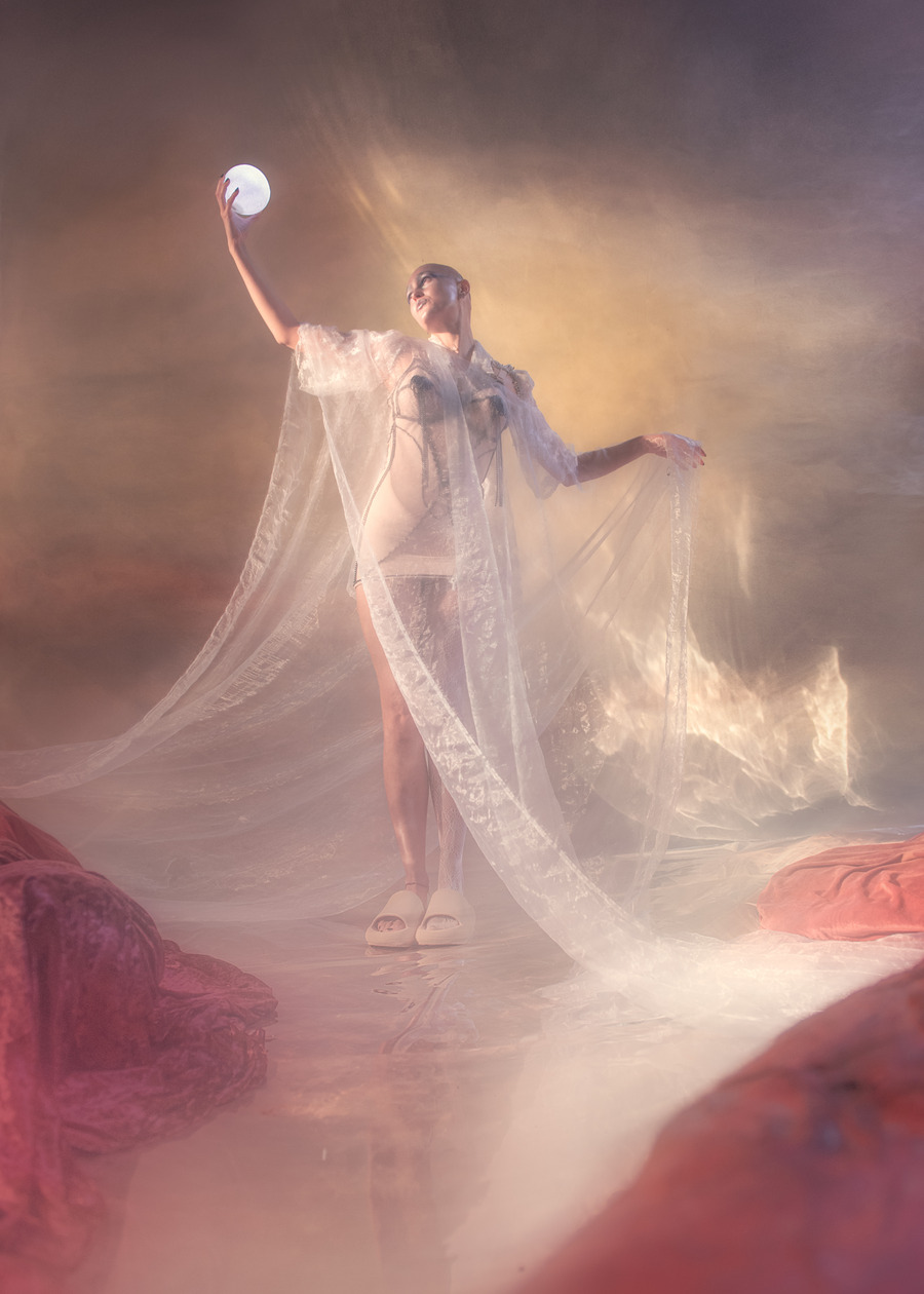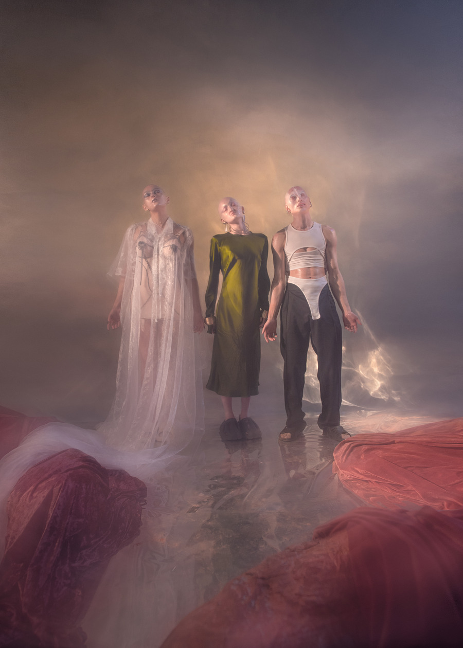 Models move in creature-like, awkward postures, reminiscent of Odd Nerdrum’s paintings, but they are immensely beautiful too; their iridescent skin gleaming in the moonlight and a wild grace surging through their form. Even light itself falls strangely upon them, rippling in impossible formations across their flesh and alienesque garments, almost as if it pulses out from within.