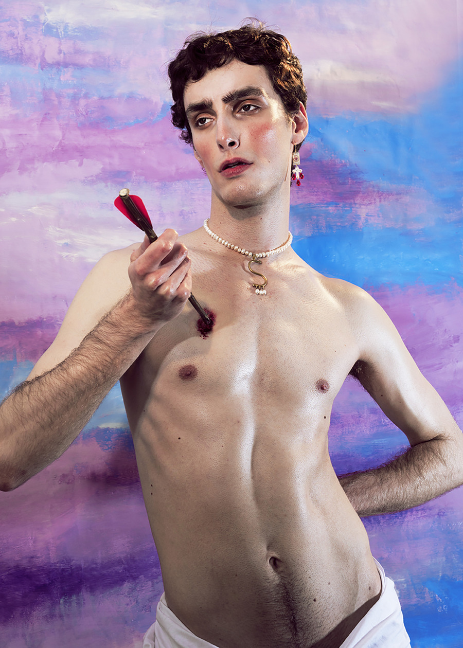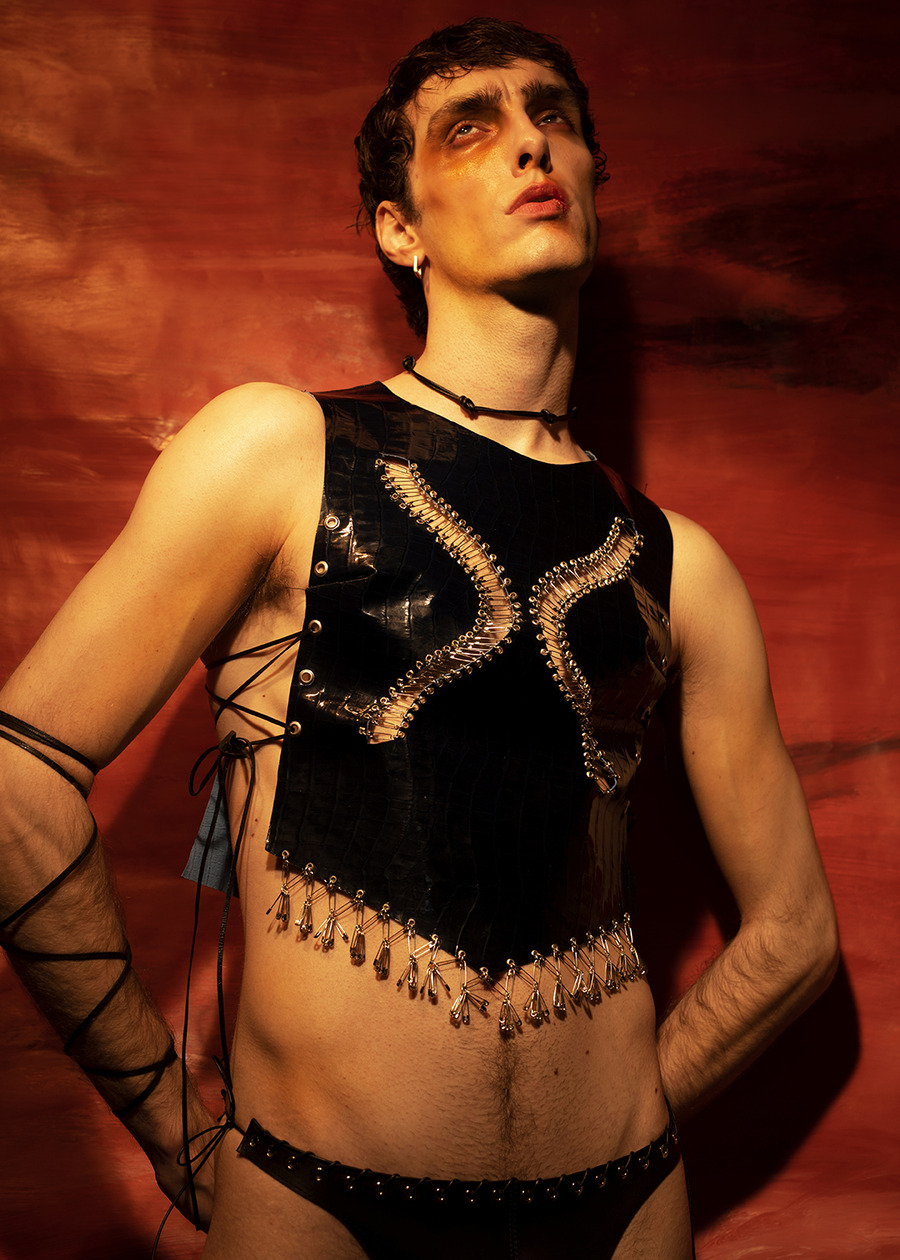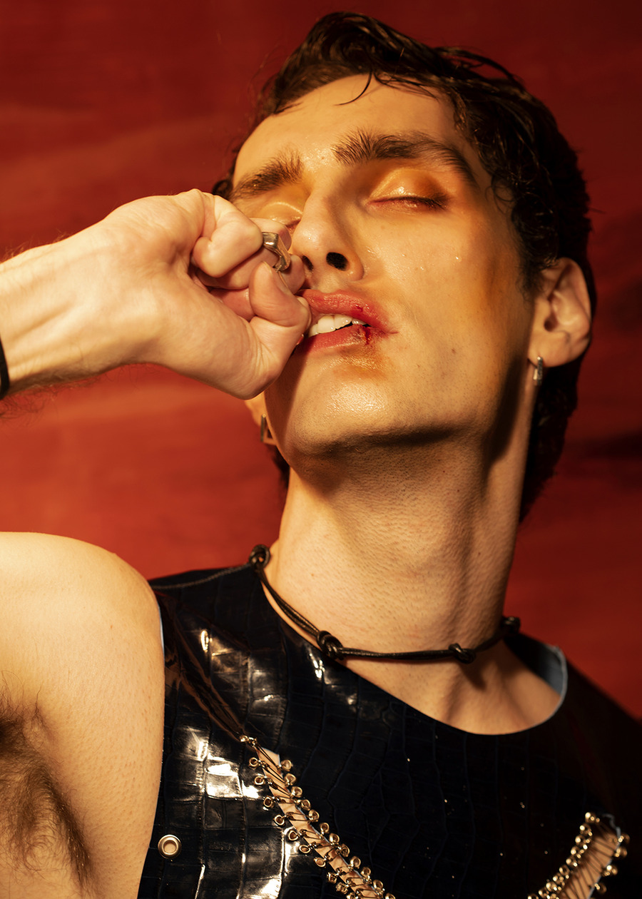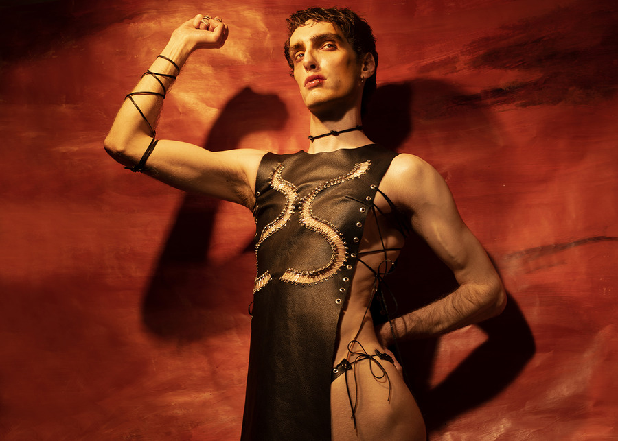 A KALTBLUT exclusive. Modelling, creative direction & concept by Matthew Scott, signed at AMCK Models London. Photography & set design by Aaron Bird. Styling & production by Sabrina Raso. Makeup by Czar Joshua Ventura. Fashion brands used are Sardanapalus, Ludovic De Saint Sernin, Sssilk666, Livia Wednesday, Dilara Findikoglu, and Matilda Little.