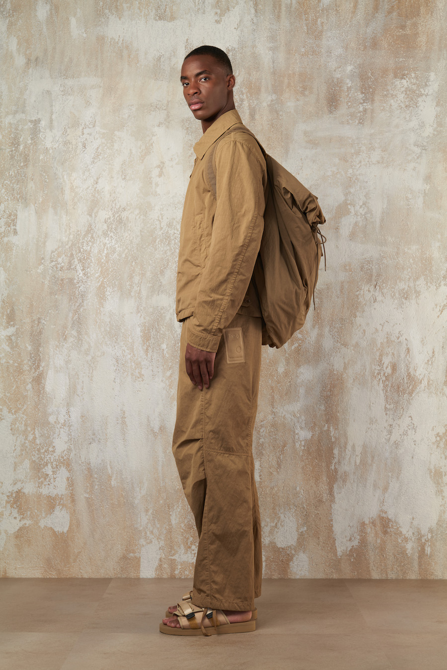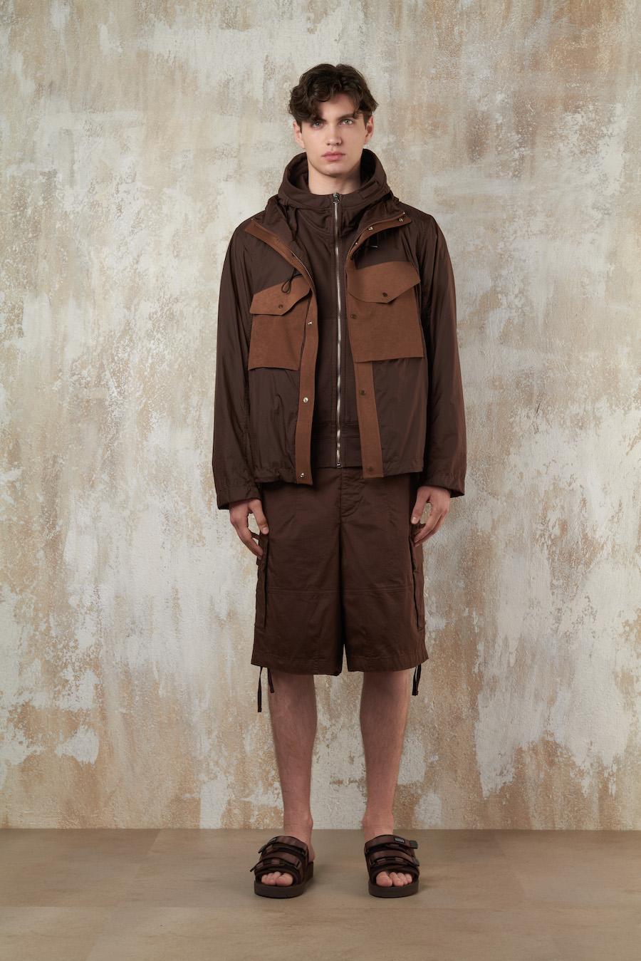 Continuing its innovative journey, Ten c introduces avant-garde materials such as tone-on-tone water-repellent resin-coated linen and garment-dyed nylon gabardine with a metallic sheen. These cutting-edge textiles join the ranks of Ten c’s staples like OJJ, tactel nylon, and three-layer heat-sealed cotton/nylon.