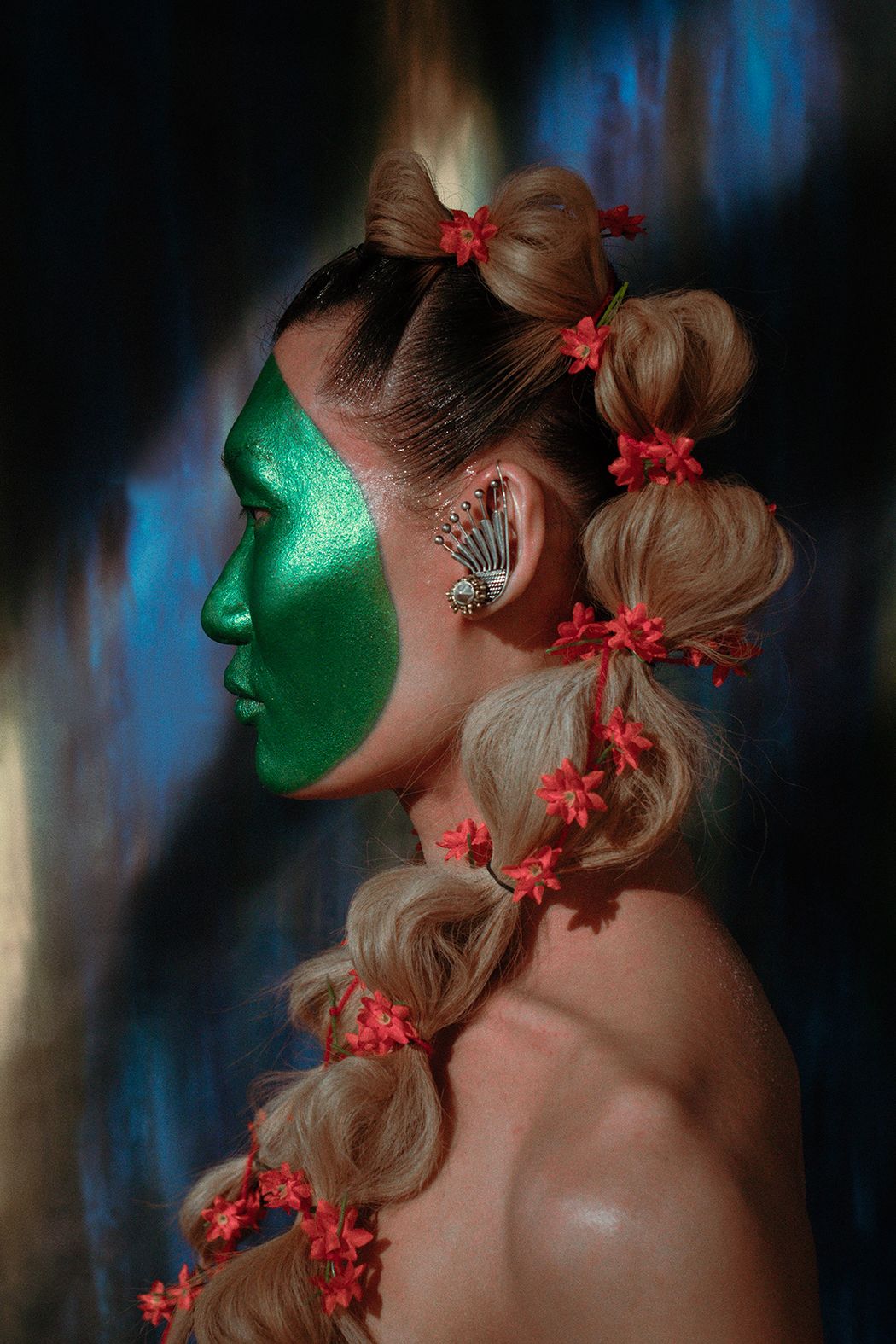 ‘The Kaleidoscopic Self’ is a vibrant mythological tale that speaks about gods that become humans and humans that become gods. This project is led by my interest in divine possessions within the context of Indian culture and is a contemporary take on it. I aim to demystify that transformation from the true self to a divine self as it unfolds atypical layers of beauty thereby generating non-singular lines of interpretation. Creating an unconventional layer of beauty generating multiple layers of interpretation of different dimensions of oneself and the process of transformation from the human self to the goddess on earth. This metamorphosis from Human Self to Divine Self embodies not only liberation but also aggression that stems from her pain and suffering. A release, an emancipatory occurrence that is divine spiritual possession, facilitates an escape from the toxic fabrics of the society.