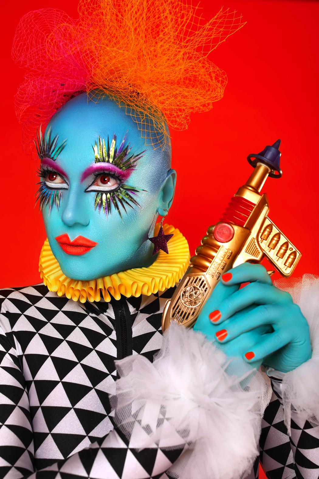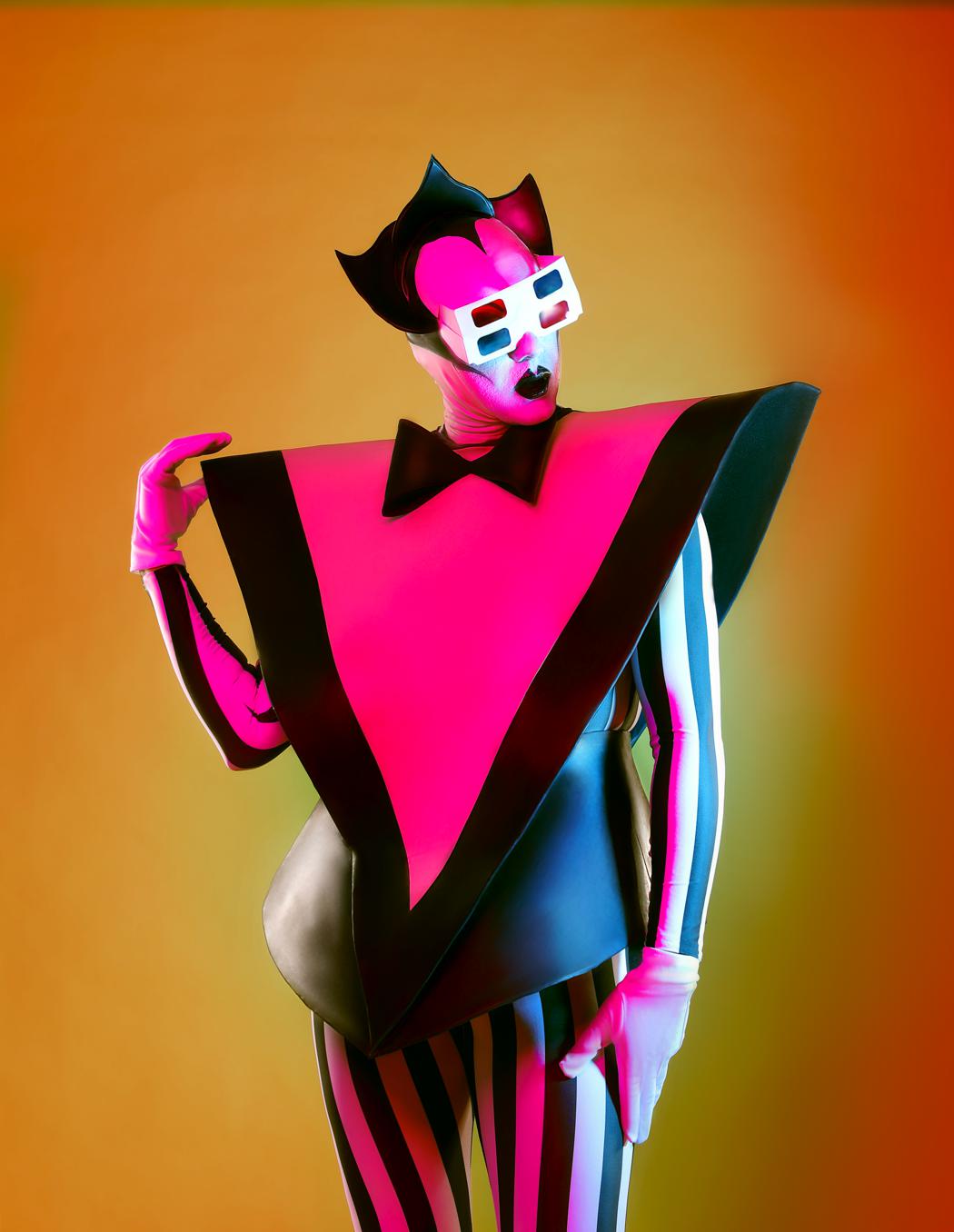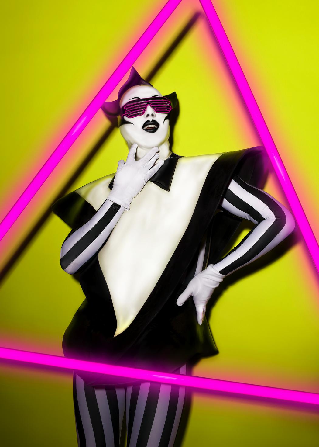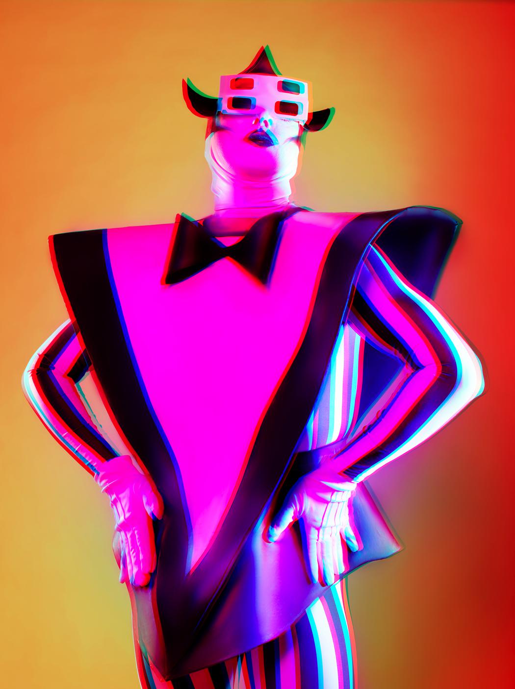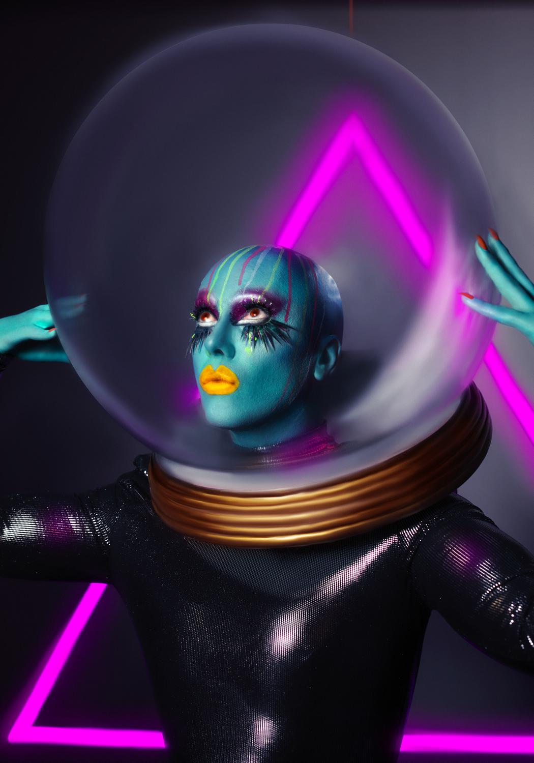Le Pustra is a dazzling queer “Kunstfigur” based in Berlin. Synthesizing elements of theatre, drag, fashion, and surrealism, Le Pustra is a creation of beauty and an accidental club-kid-cum-avant-garde fashion muse. His work mostly explores self-identity with a sense of irony. This series is a playful homage to cult “fashion alien” Klaus Nomi and legendary club kid, fashion designer and Provocateur, Leigh Bowery – styled with campy Sci-fi and Retro-Futurism references.