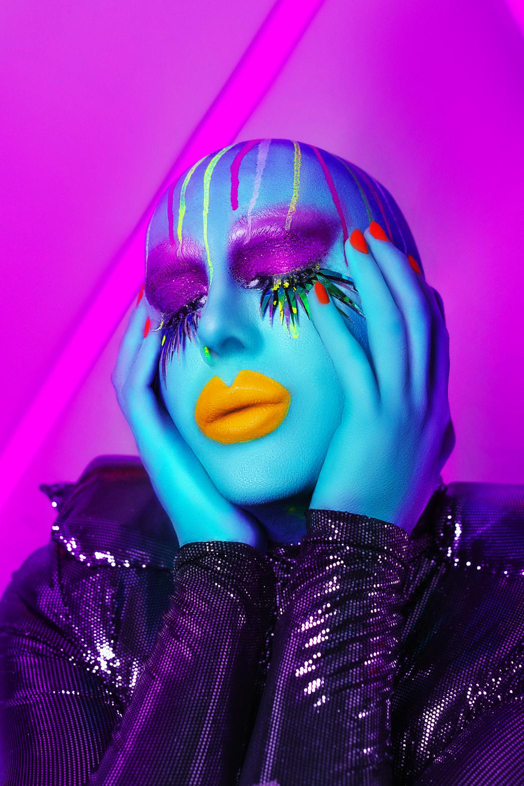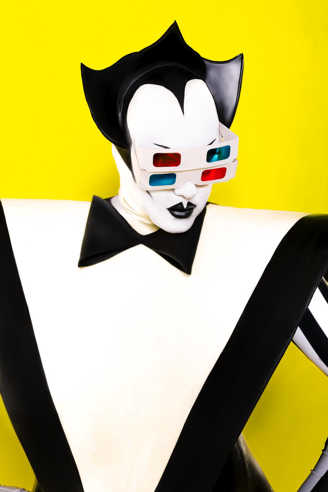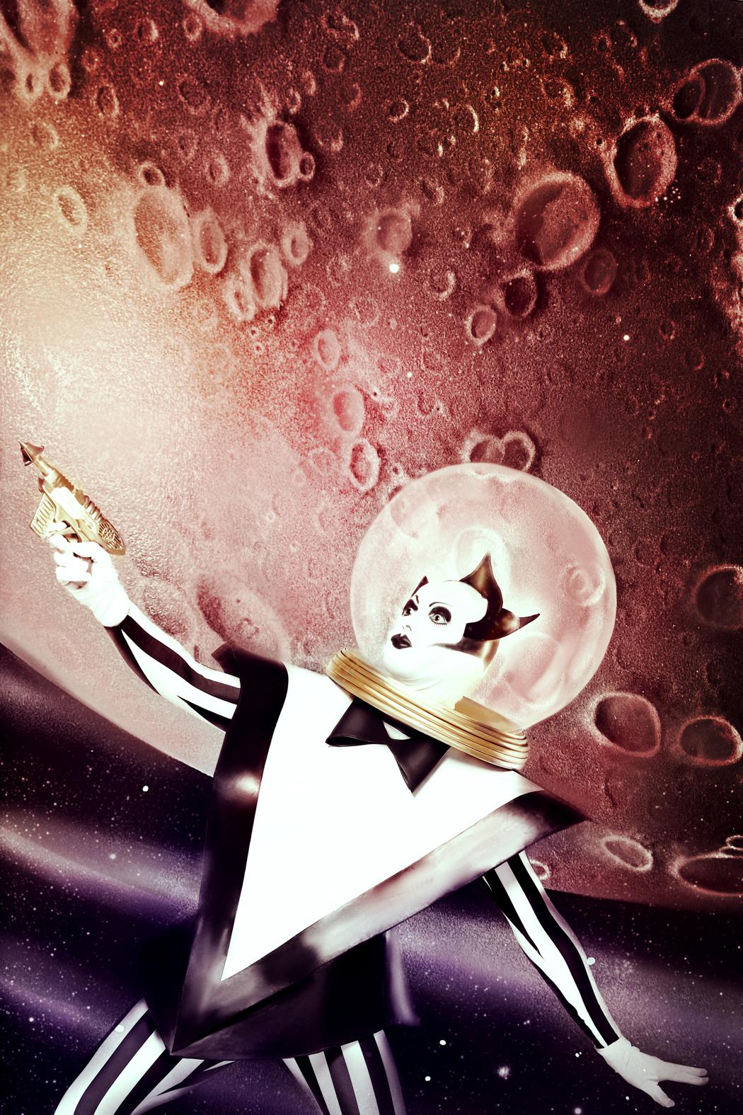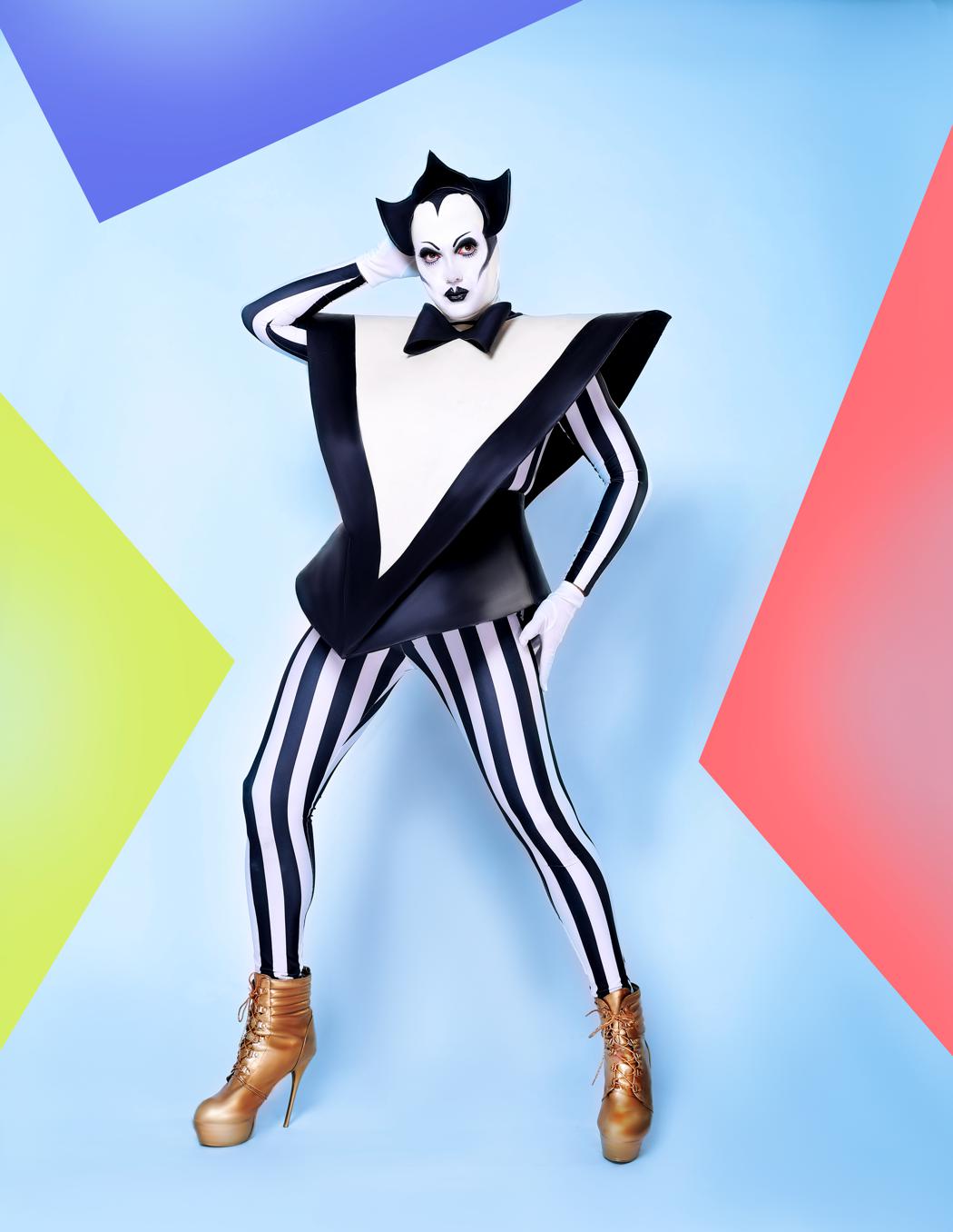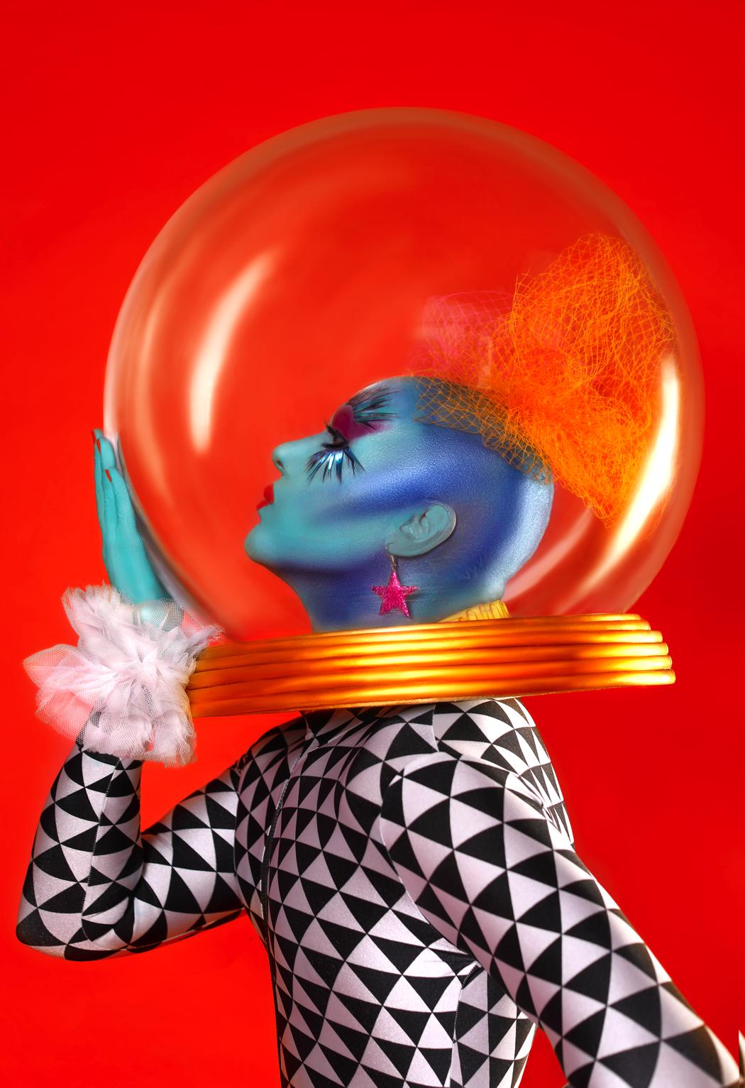 Le Pustra is a dazzling queer “Kunstfigur” based in Berlin. Synthesizing elements of theatre, drag, fashion, and surrealism, Le Pustra is a creation of beauty and an accidental club-kid-cum-avant-garde fashion muse. His work mostly explores self-identity with a sense of irony. This series is a playful homage to cult “fashion alien” Klaus Nomi and legendary club kid, fashion designer and Provocateur, Leigh Bowery – styled with campy Sci-fi and Retro-Futurism references.