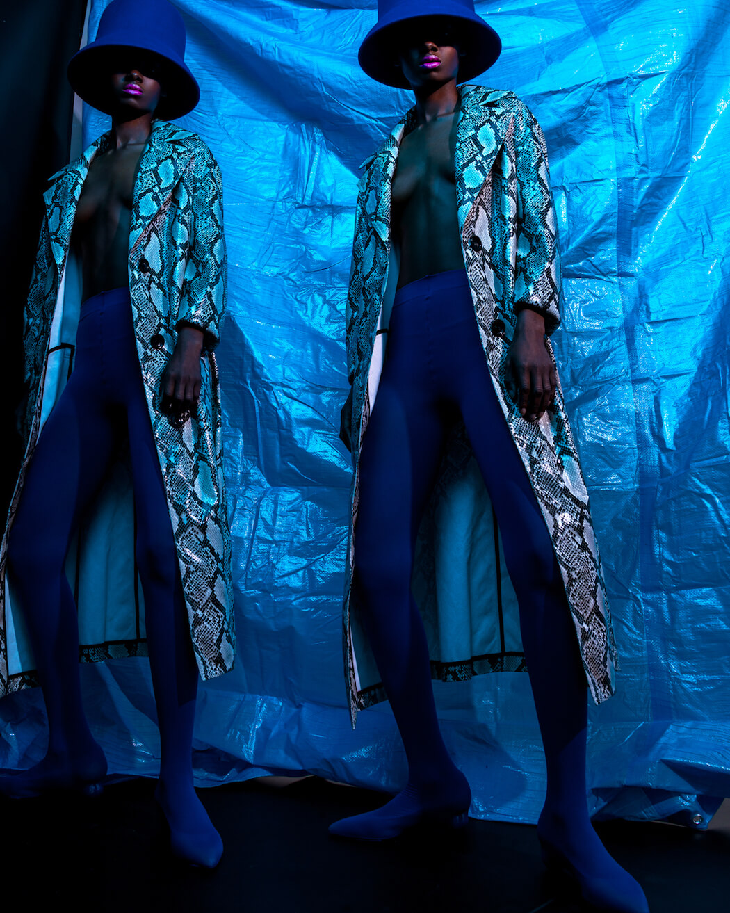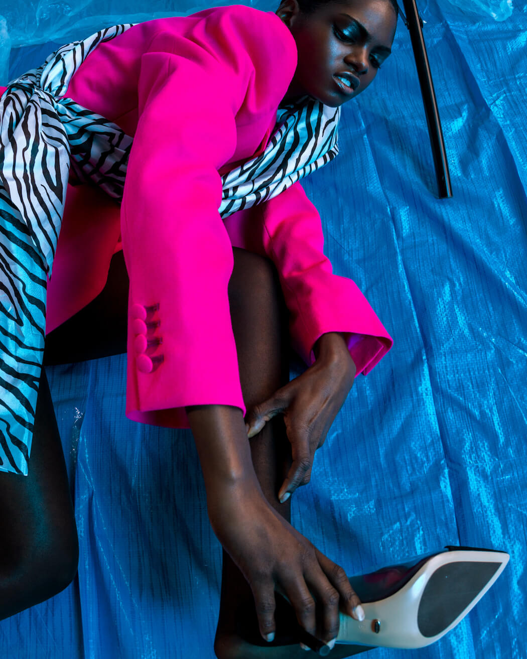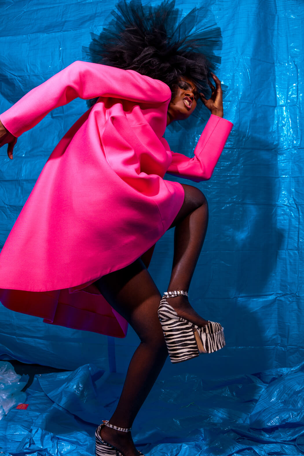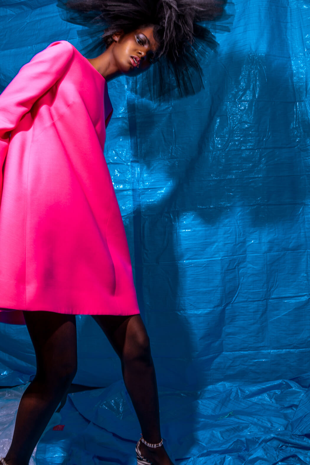 A KALTBLUT exclusive. Photography by The O.X. Project. Model is Delar Gaston of Select Model Management. Wardrobe Stylist is Kimmi Ade of Distinct Artists. Make-up by Konstantine Mironychev of Distinct Artists. Hair by Igor Shashkin of Distinct Artists. Skin Retouching by Andrea Corsei. Brands are The Attico, K.Adé, Tony Bianco, Stand Studio, Nina Ricci, ATM, Kwaidan Editions, McQ, Dolce & Gabbana, Ikram, Coperni, Ikram, Toga, Ikram, Balenciaga, Valentino, Katie Farnan, Osman.