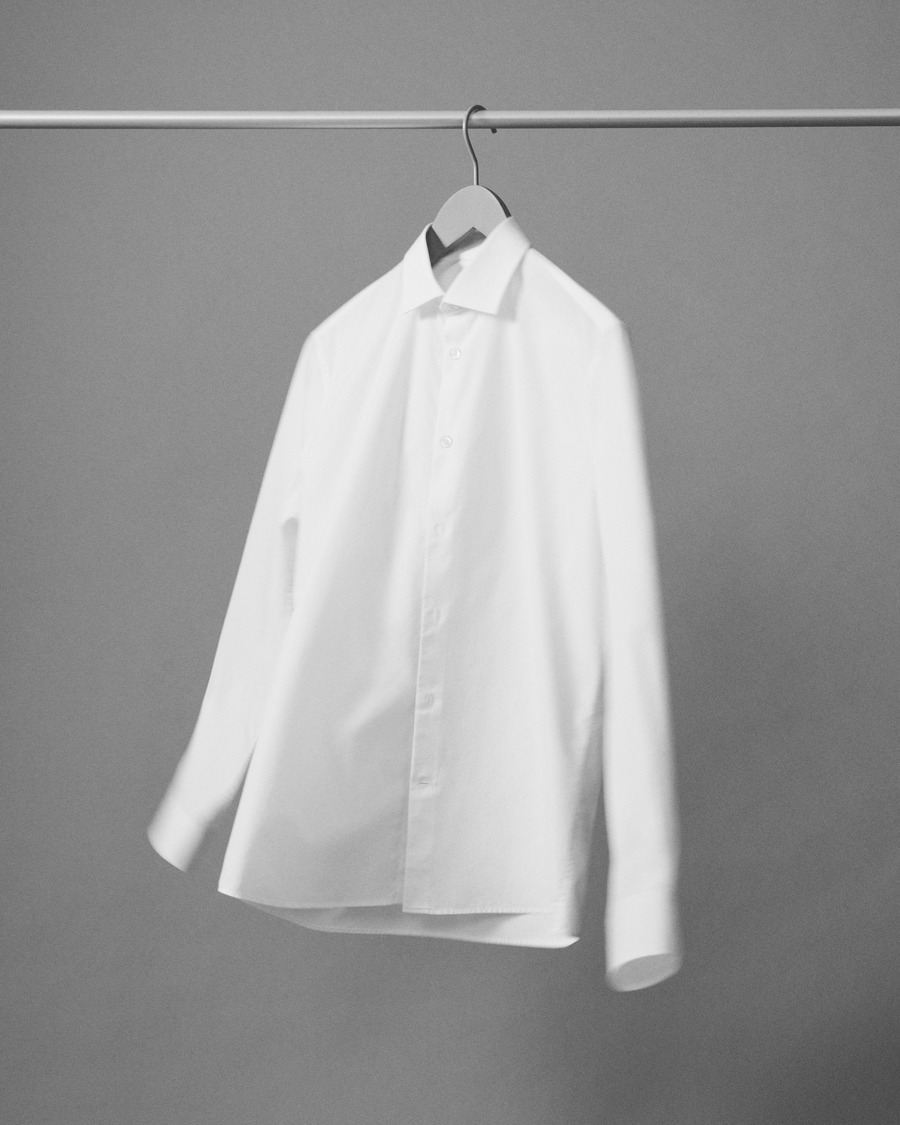 The shirt has a classic straight cut and a seamless French button placket with mother-of-pearl buttons. The cuffs are adjustable with two buttons to get the best fit around the wrists and arms. The cutaway collar can be worn with or without a tie, making it suitable for any occasion. The poplin shirt will be available in two colours: white and light blue.