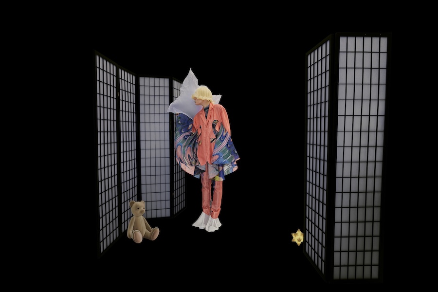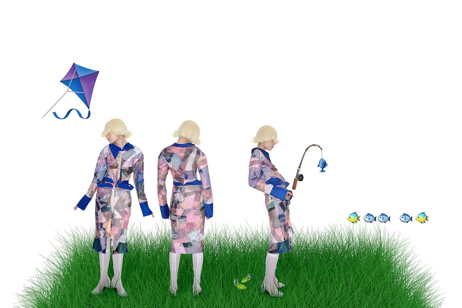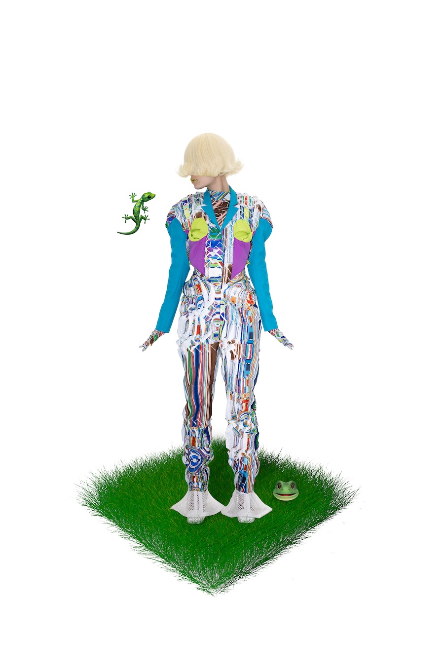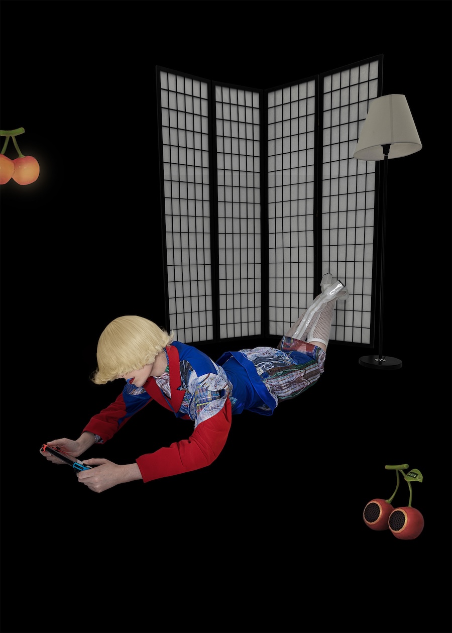 A KALTBLUT exclusive. Spatial Anchor Point explores how identity shifts across digital coordinates. Within a single day, the self relocates between roles- student, player, consumer-touching screens as if teleporting between layered spaces. Inspired by game-world logics such as pixel grids and Animal Crossing’s mosaic canvases, the garments translate this movement into glitch surfaces, pleated distortions, and imperfect prints. Staged between a dark theatrical void and a luminous field of icons and grass, the images suggest a body that flickers-no longer fixed, but constantly re-anchored in overlapping realities.